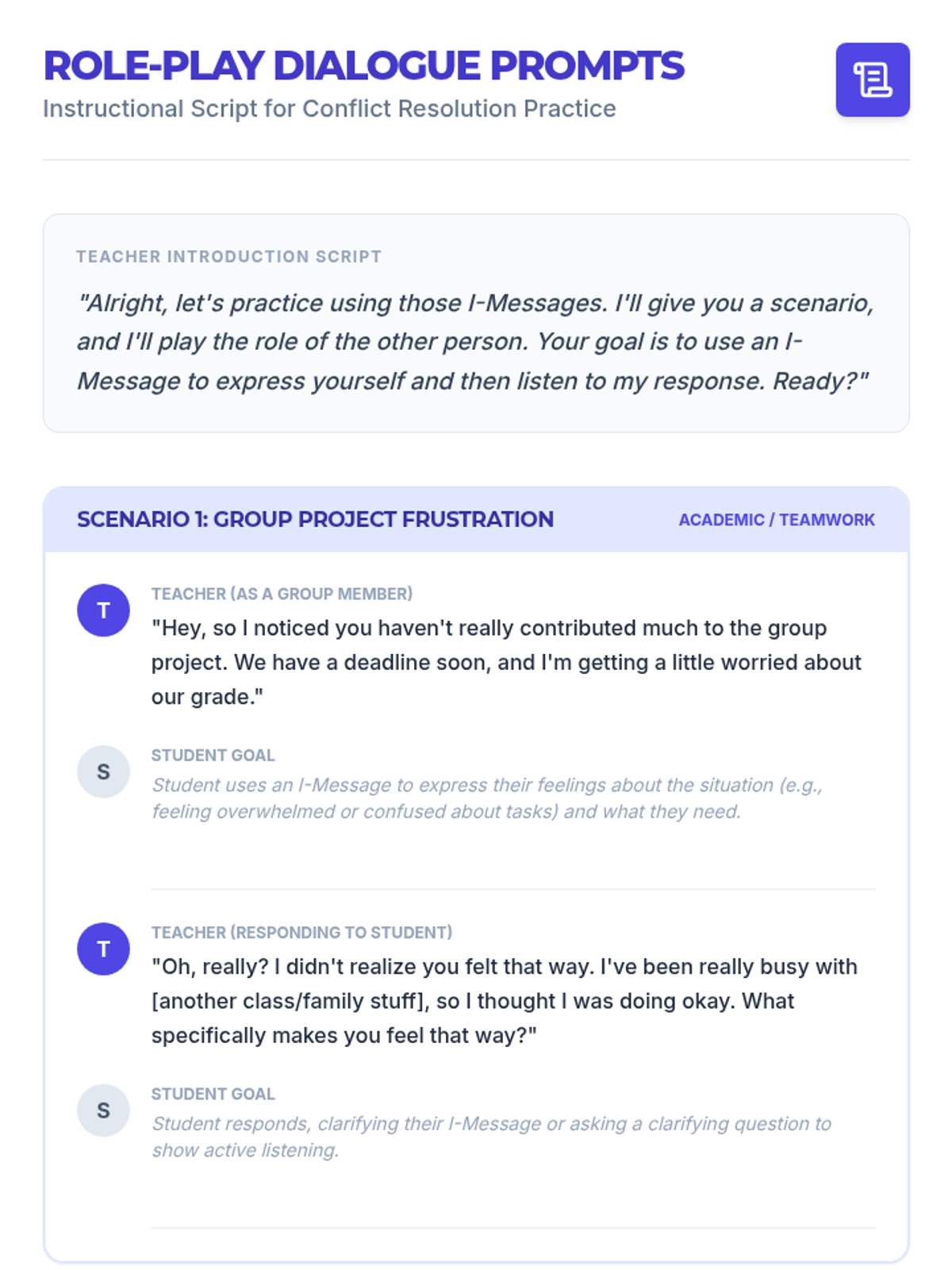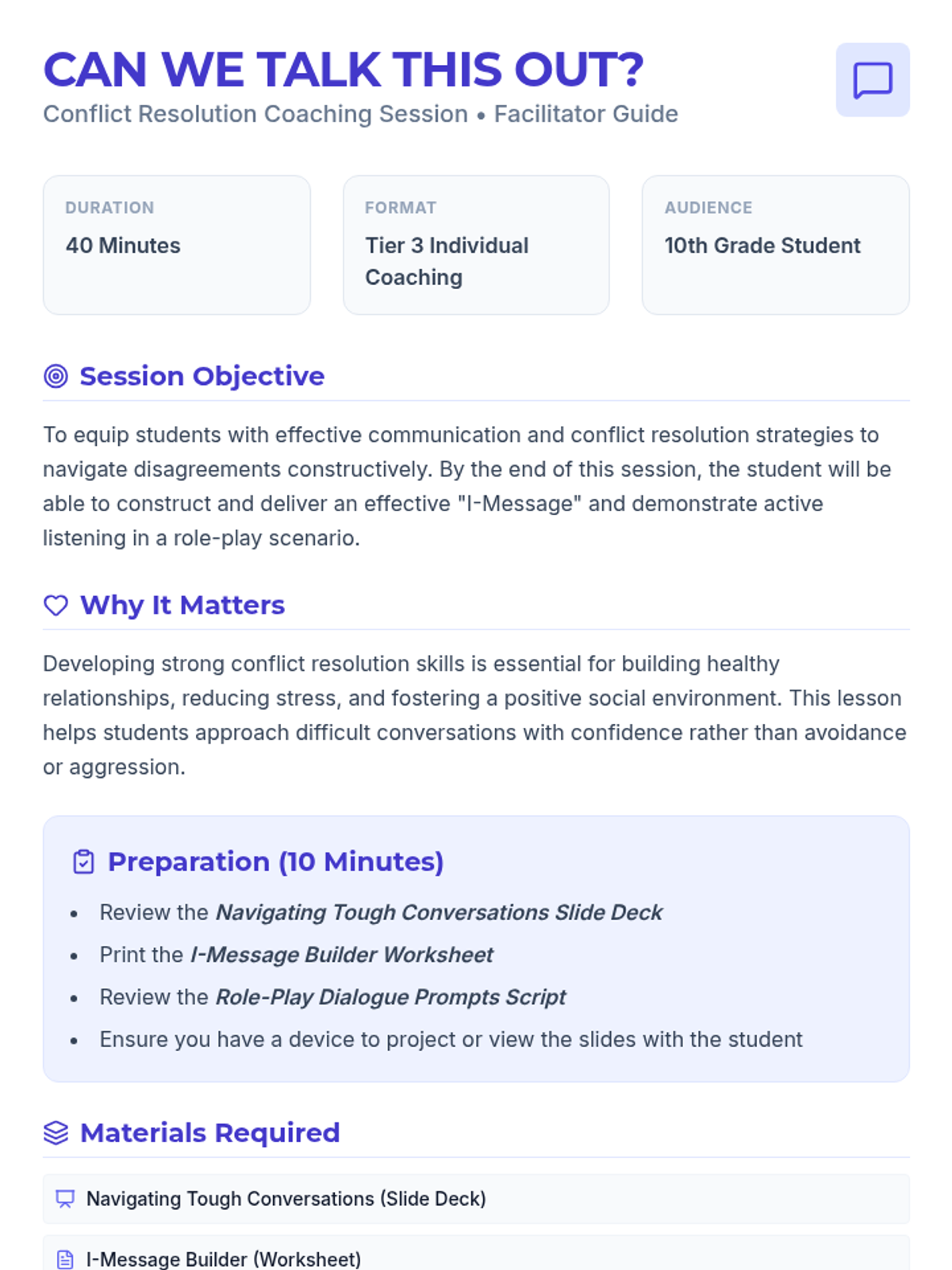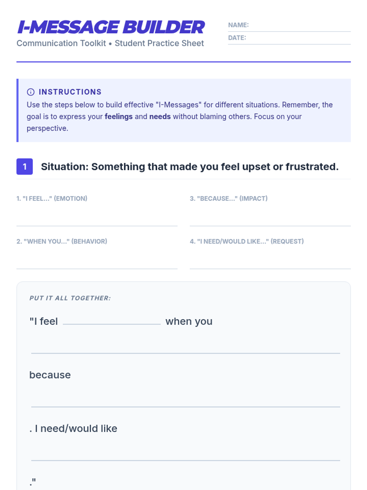 An individual coaching session for 10th-grade students focused on mastering effective communication and conflict resolution using 'I-Messages'. Students will learn to express their needs constructively and practice active listening through guided role-play scenarios.