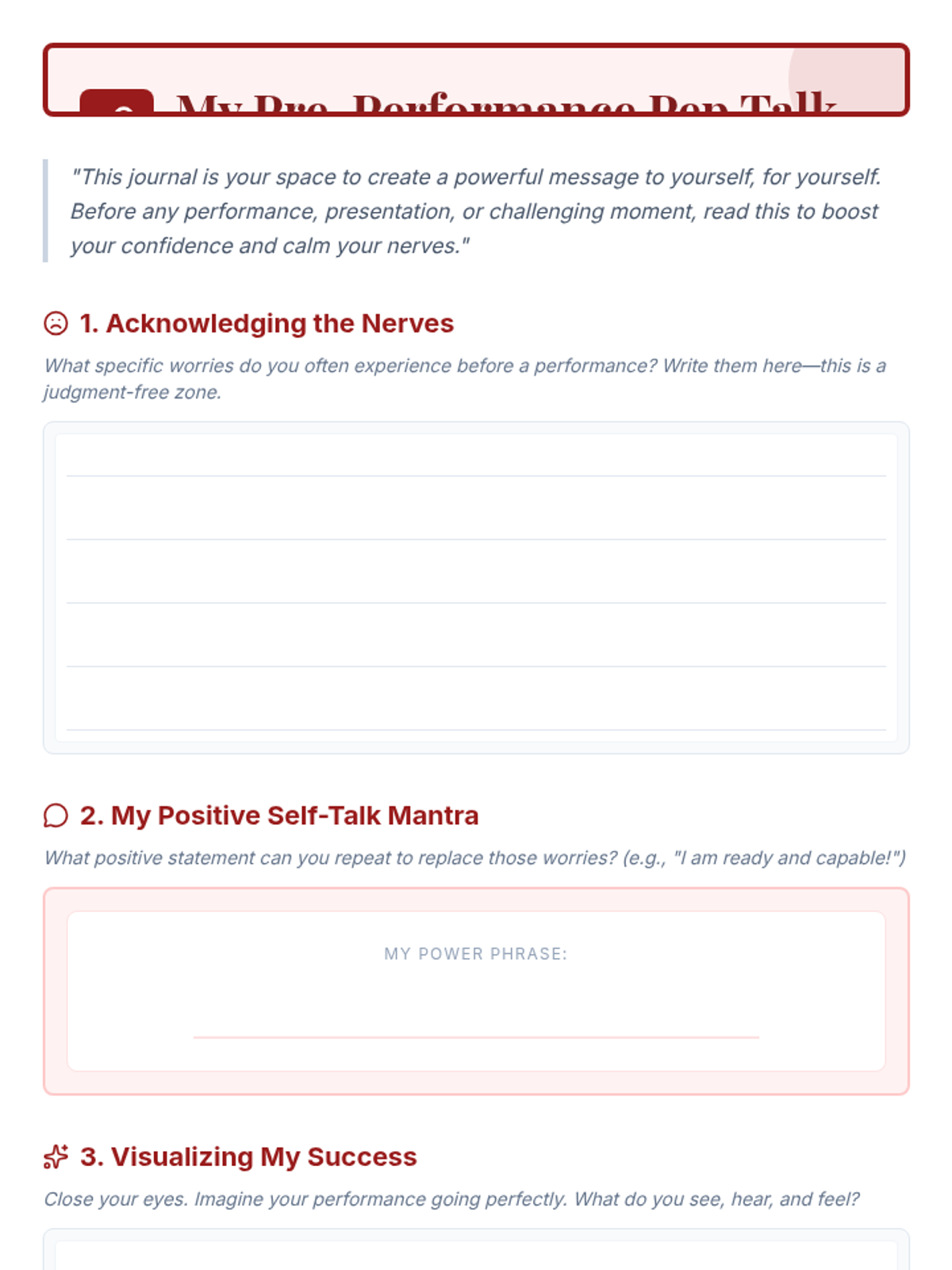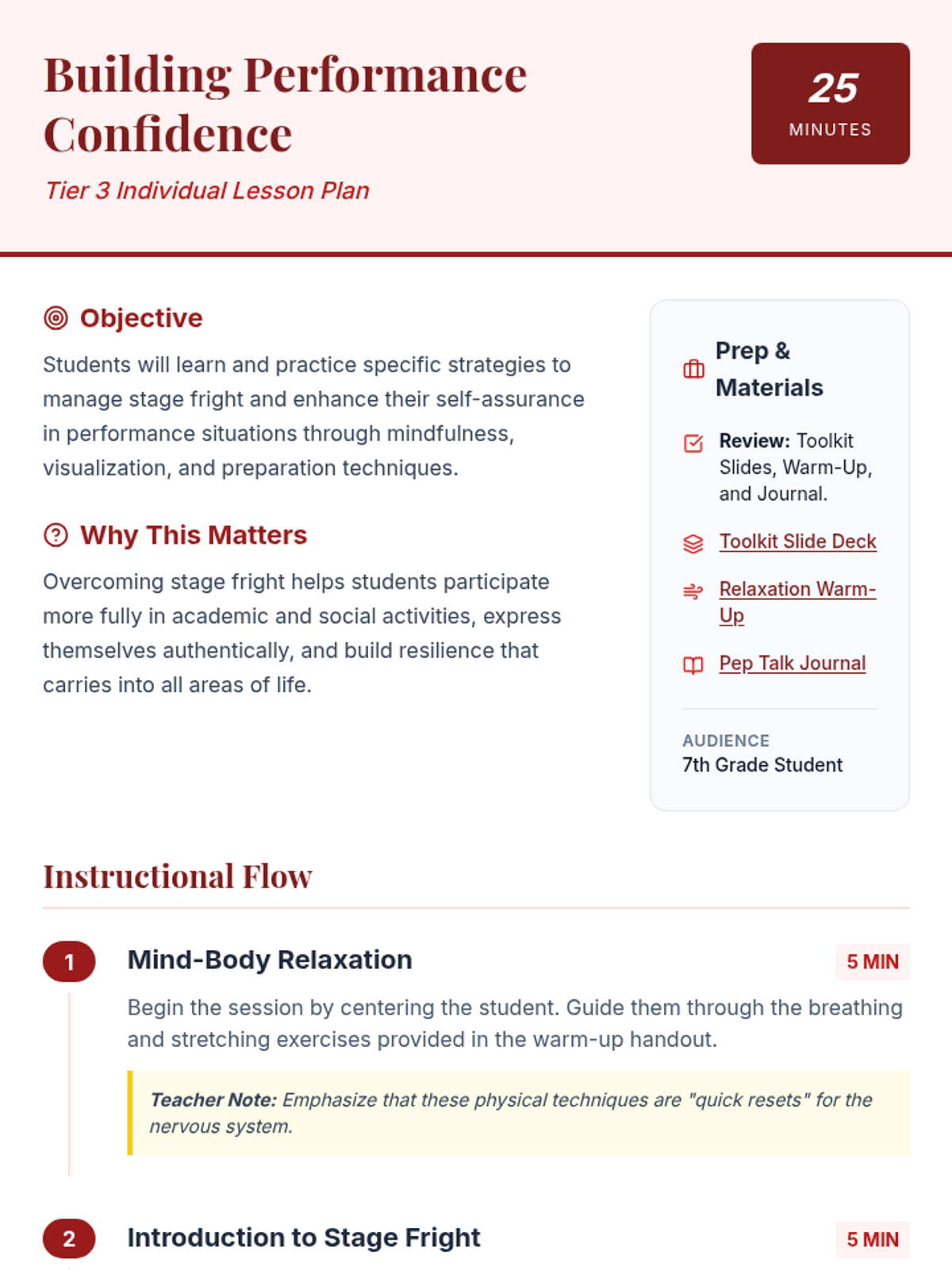 A 25-minute individual Tier 3 lesson designed to help 7th-grade students manage stage fright and build performance confidence through mindfulness, positive self-talk, and preparation strategies.