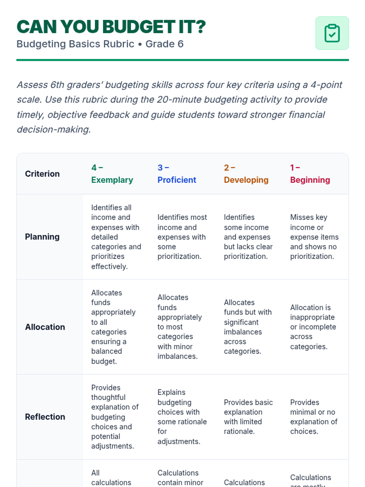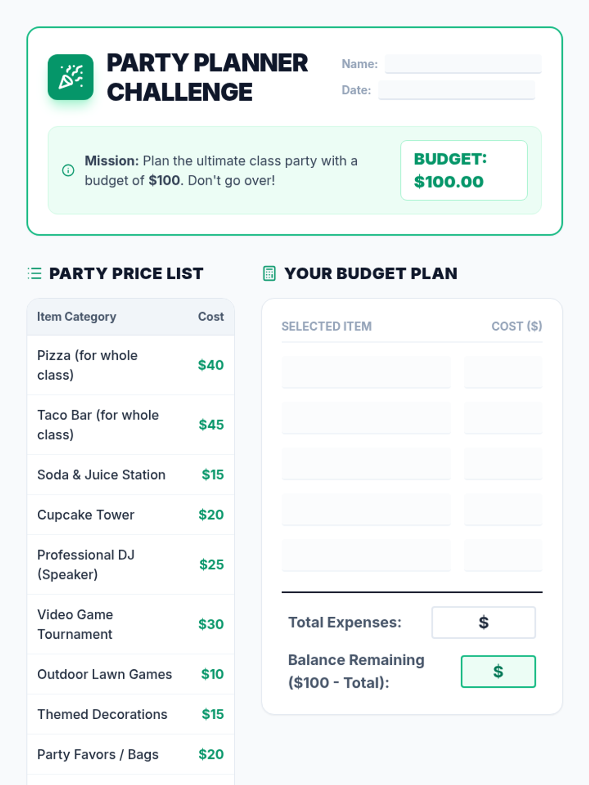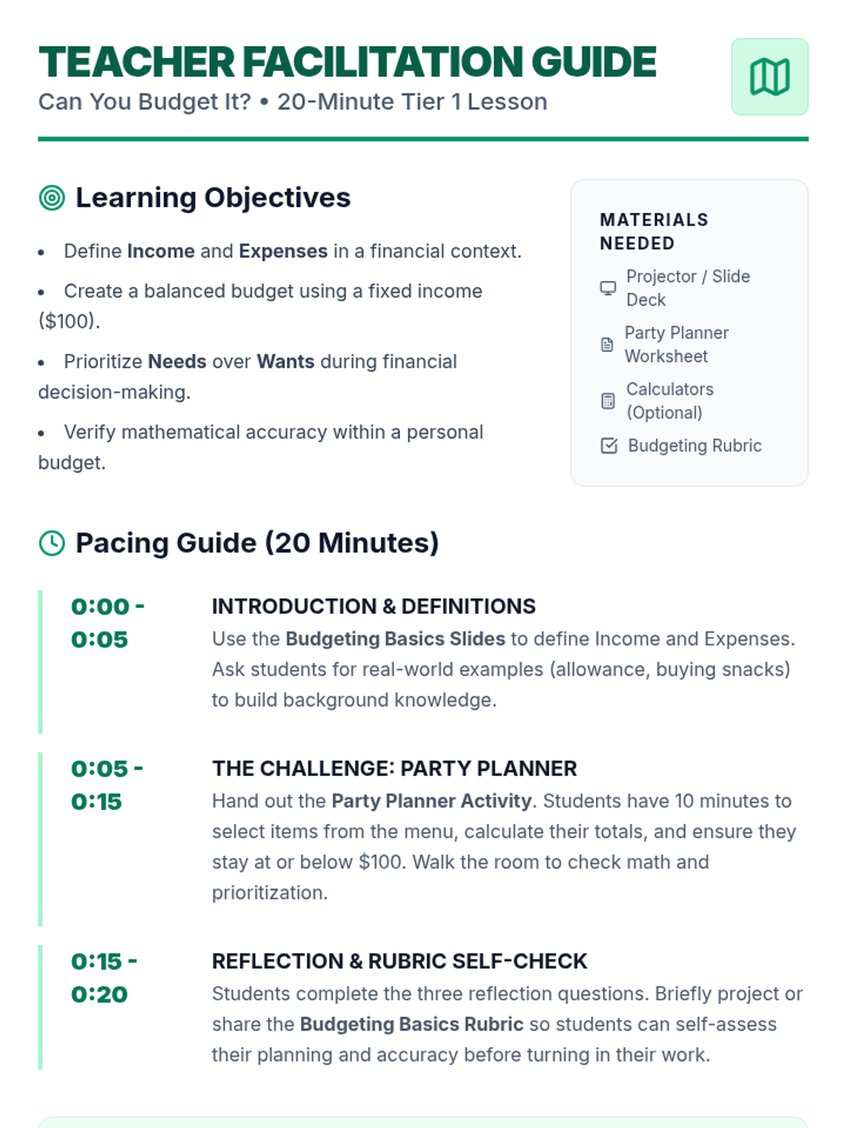A fast-paced, 20-minute Tier 1 lesson designed to introduce 6th graders to the basics of budgeting. Students participate in a quick-fire 'Classroom Party' budget challenge to practice planning, allocation, and financial decision-making.