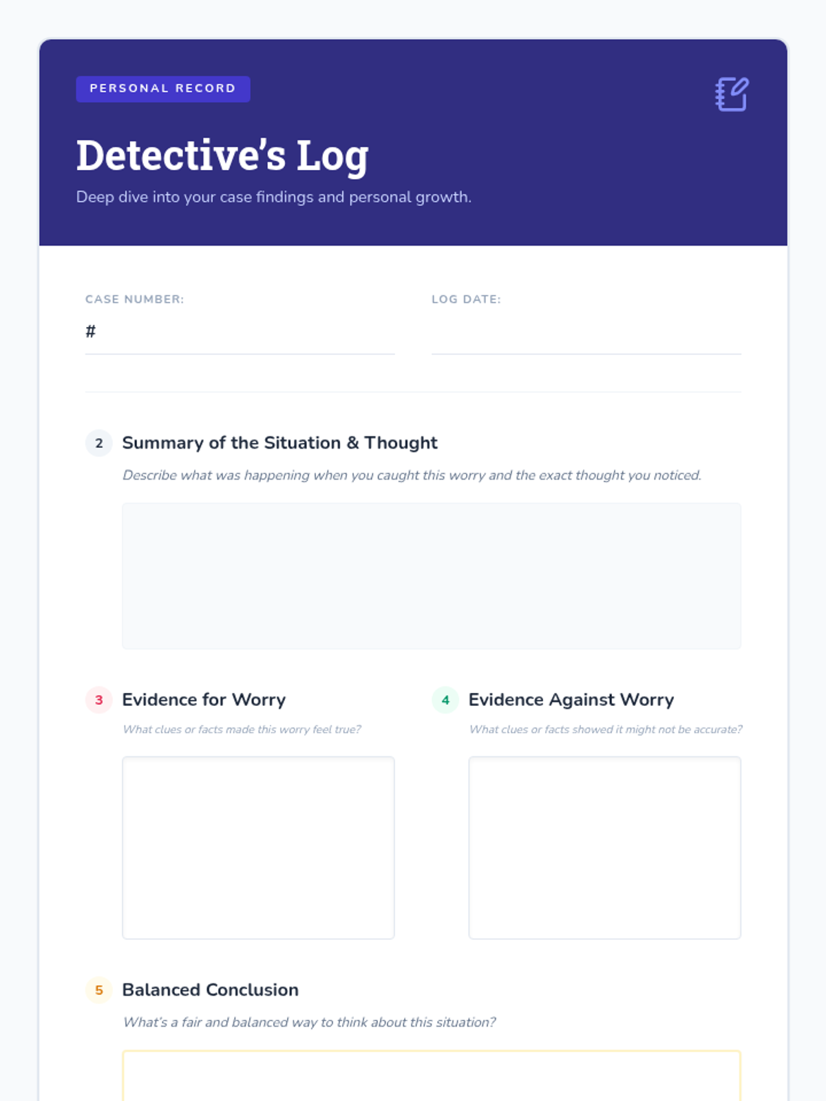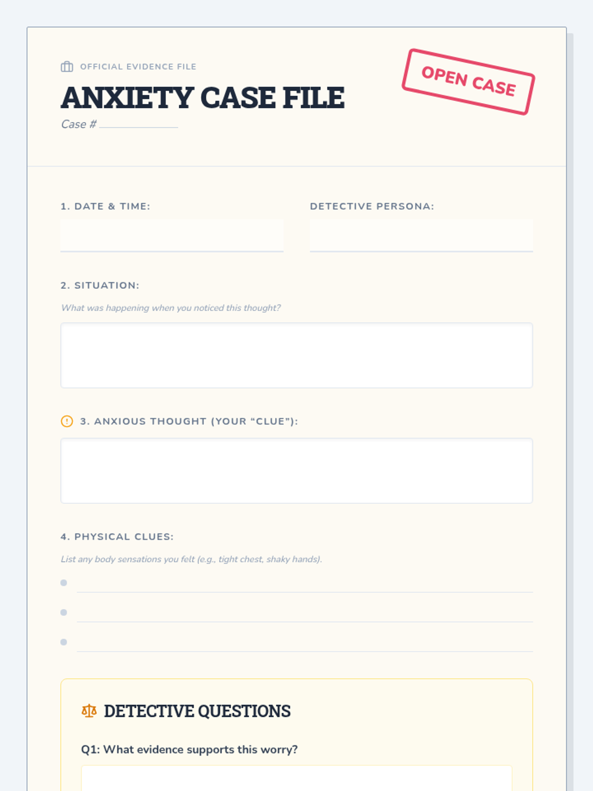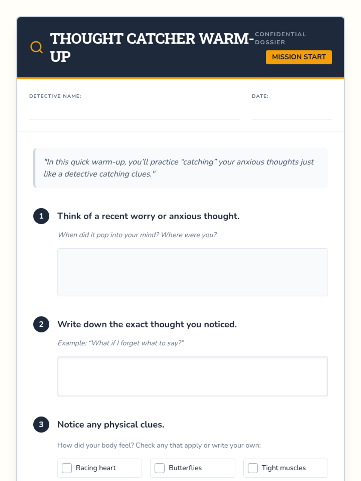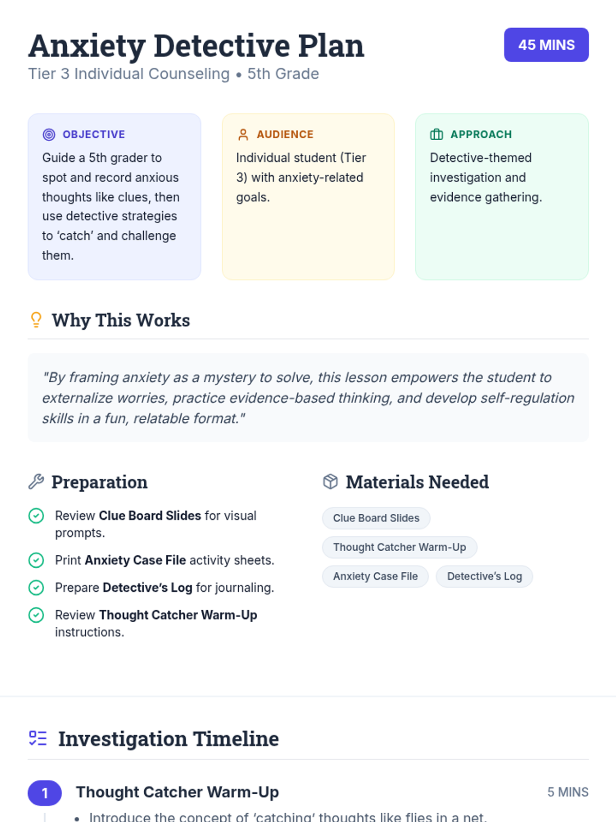 In this detective-themed individual counseling session, a 5th grade student will track anxious thoughts like clues and learn strategies to ‘catch’ and challenge them. This 45-minute Tier 3 activity helps build coping skills and self-awareness in a personalized, engaging format.