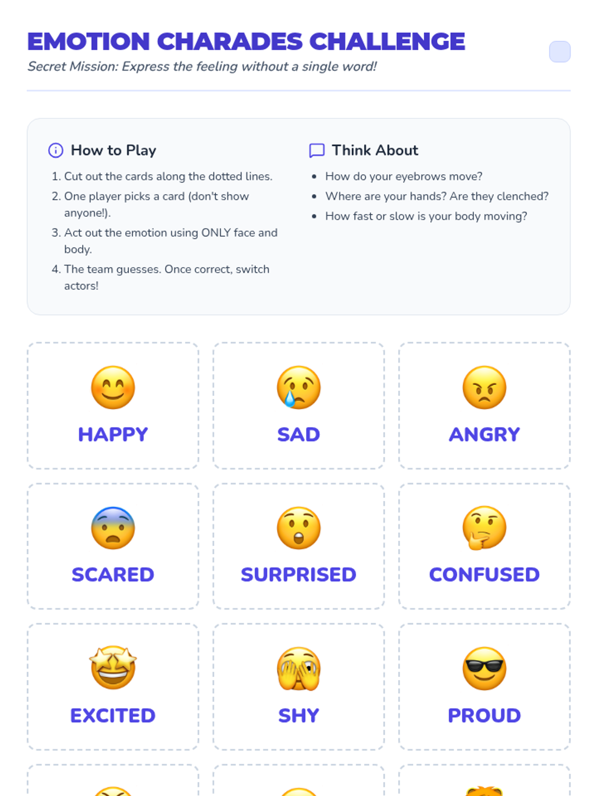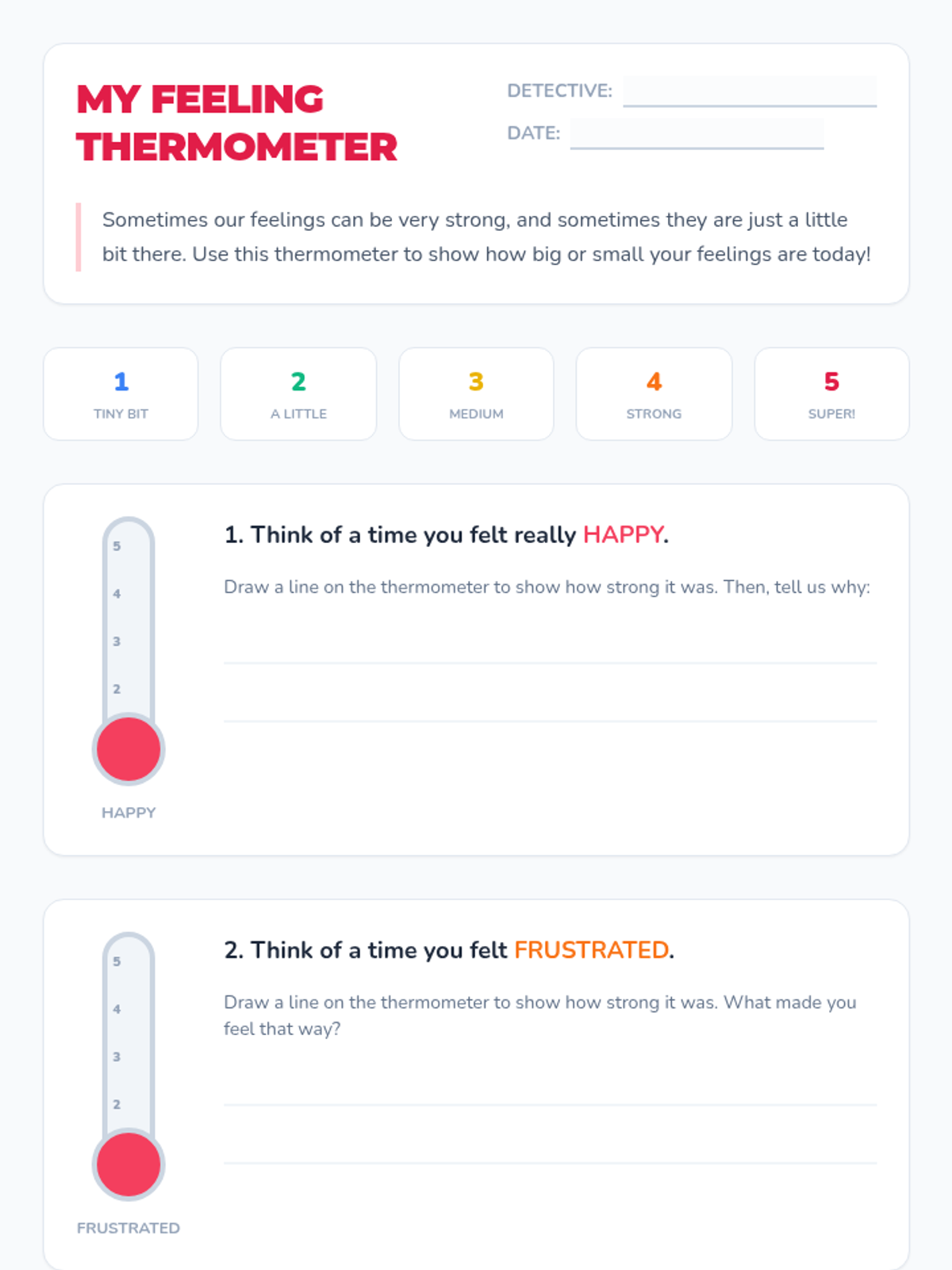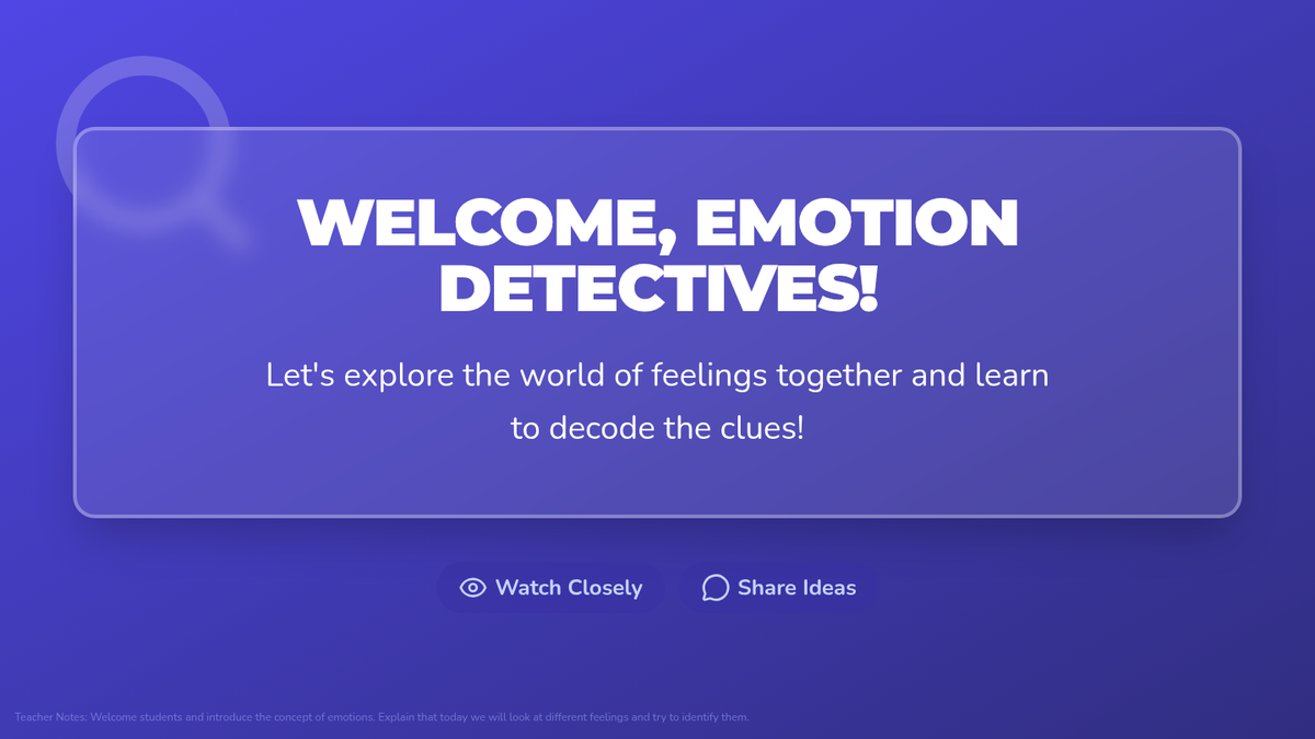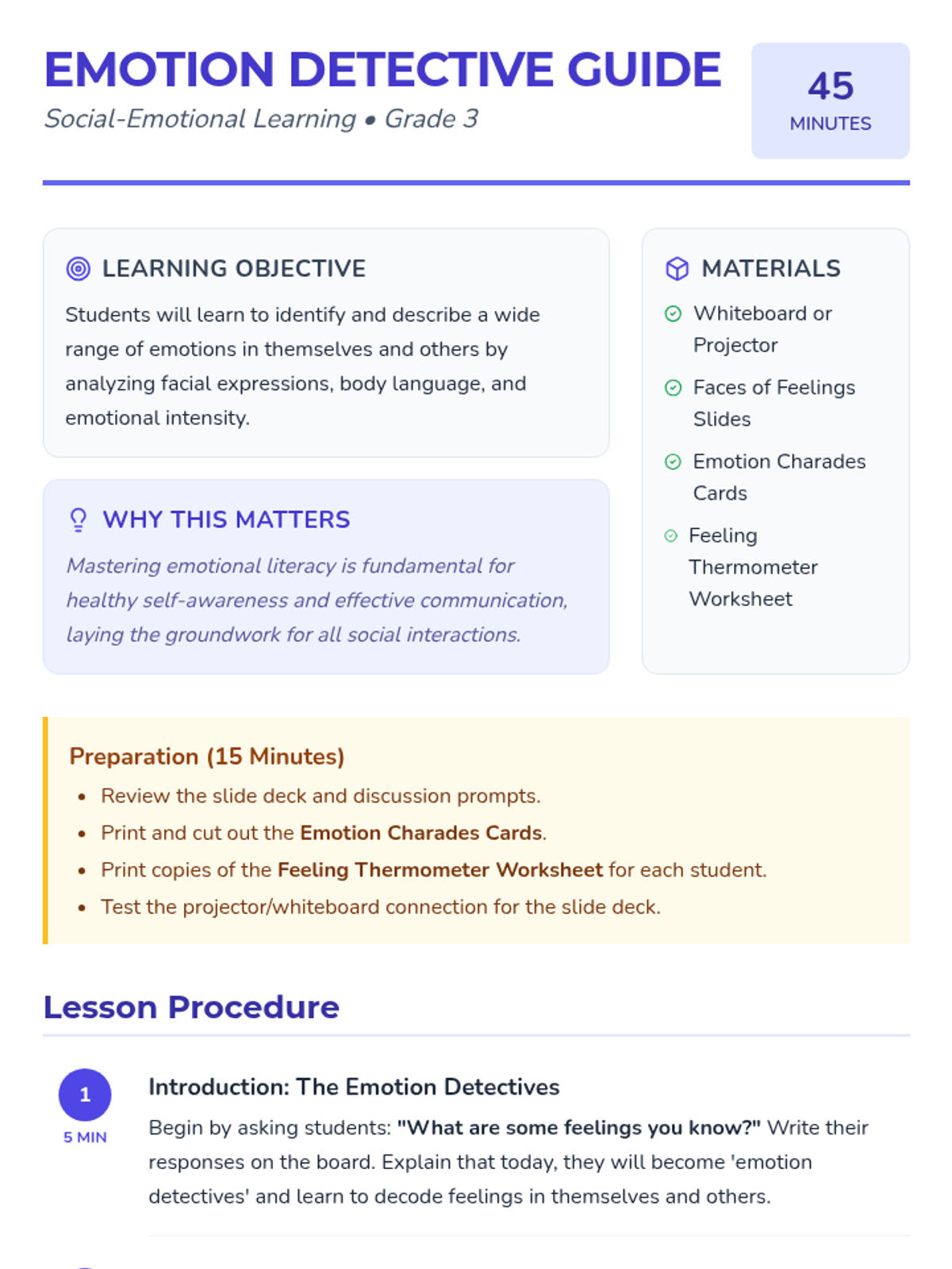 A 45-minute social-emotional learning lesson for 3rd graders focused on identifying, decoding, and measuring the intensity of various emotions. Students act as 'emotion detectives' to explore facial expressions and body language through slides, charades, and personal reflection.