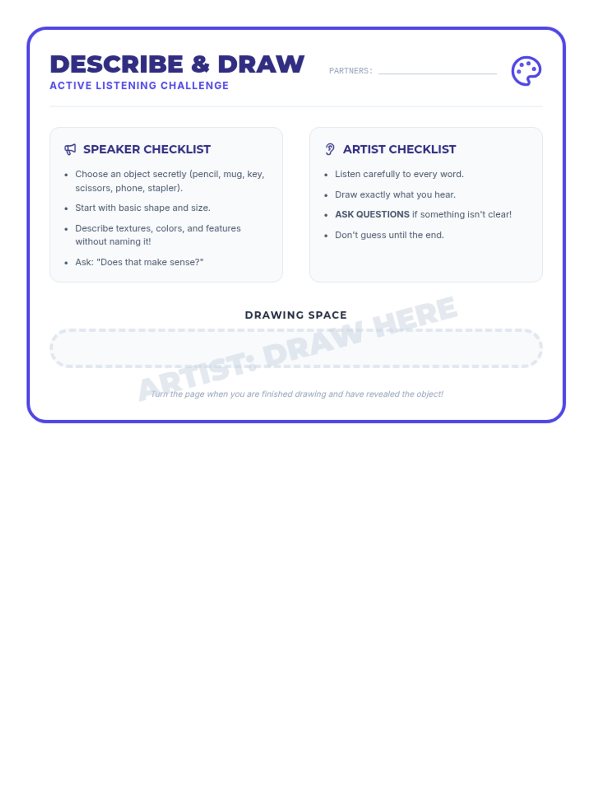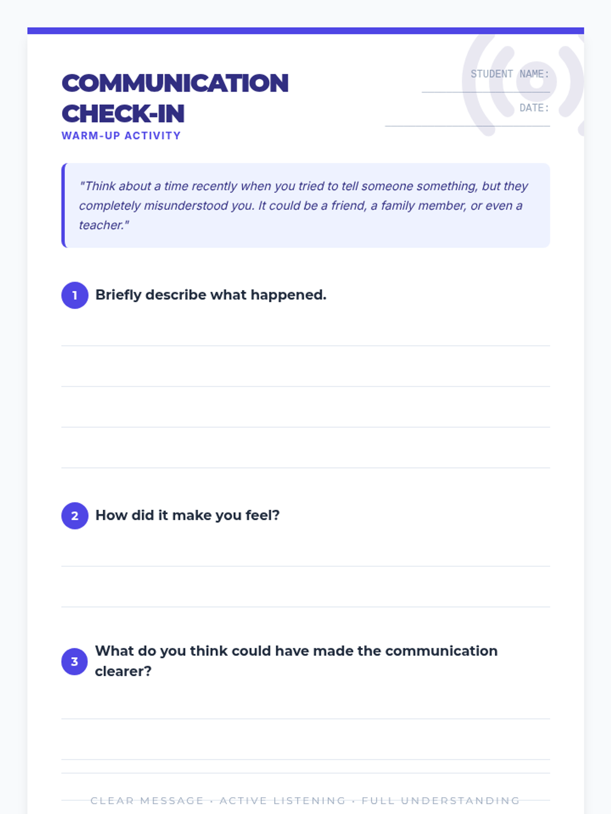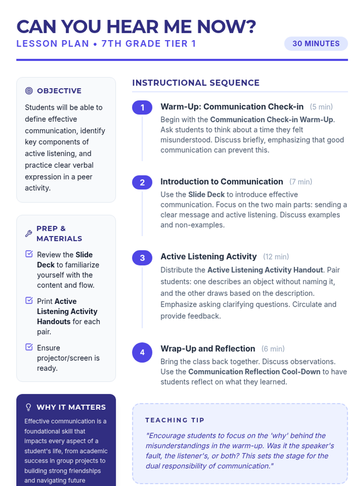 This 30-minute lesson for 7th graders focuses on the importance of clear and effective communication, helping students understand and practice different communication styles through active listening and verbal clarity exercises.