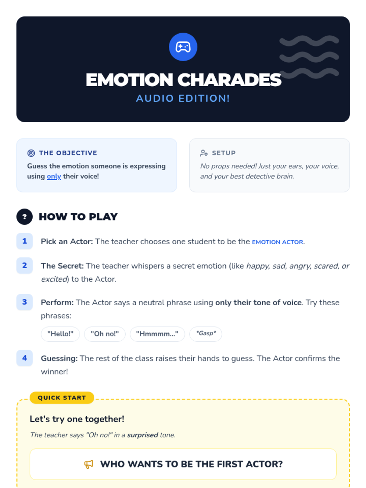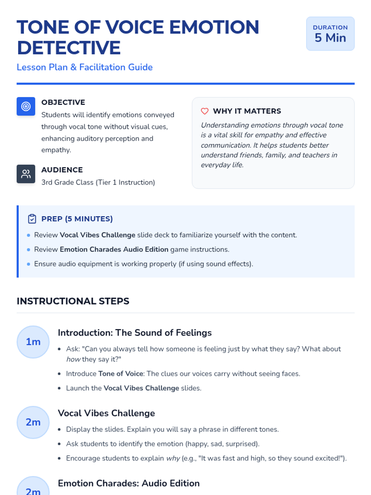 An engaging 5-minute activity for 3rd graders to identify emotions through vocal tone, sharpening auditory perception and empathy.