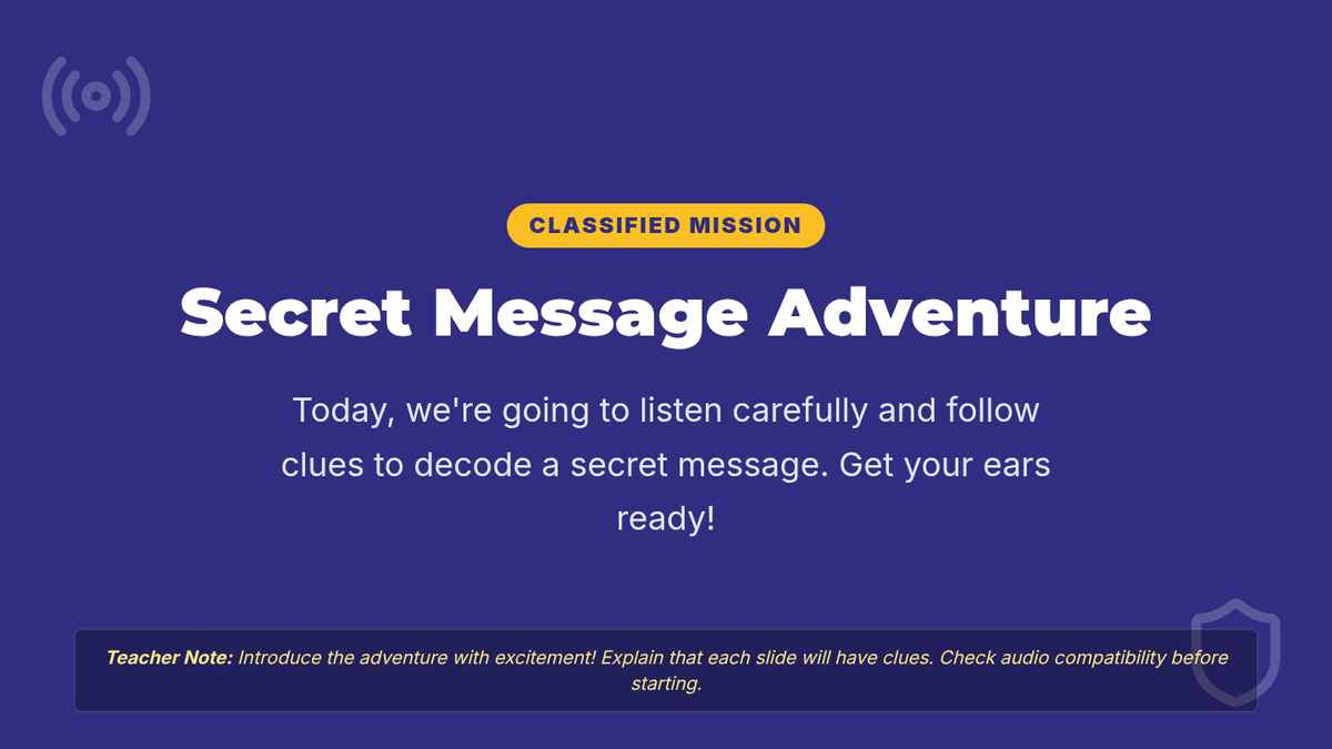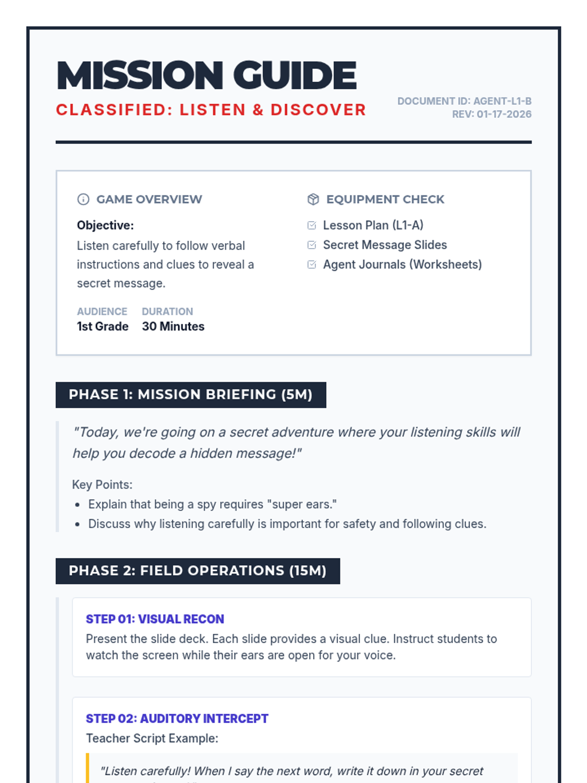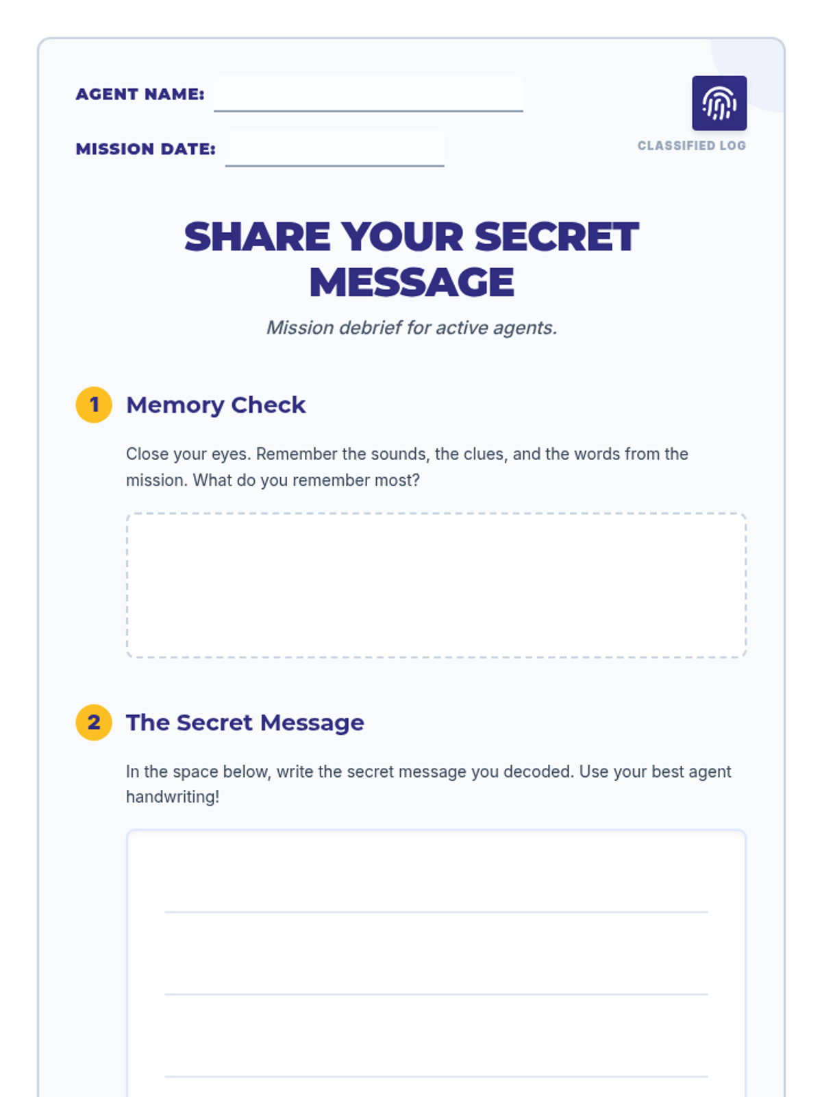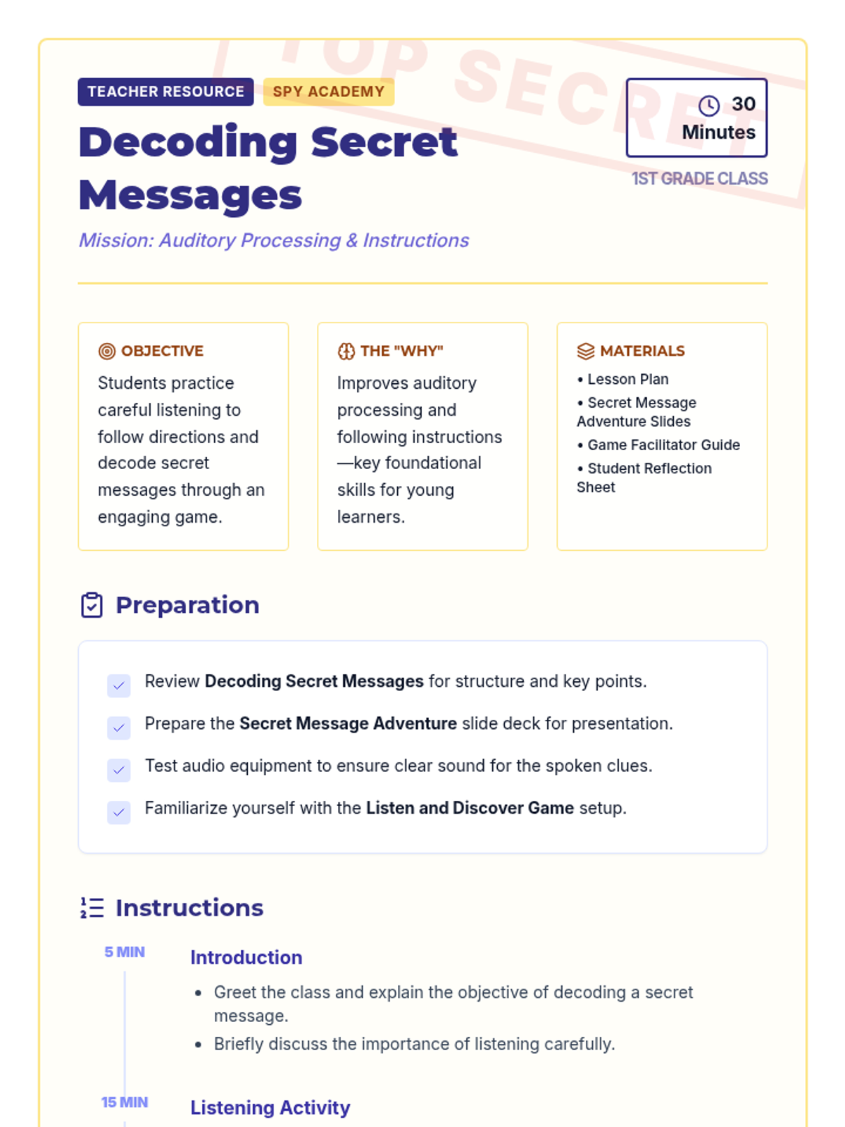 Students practice auditory processing and following complex instructions through an engaging secret agent game. By decoding a hidden message, they learn the importance of active listening and attention to detail.