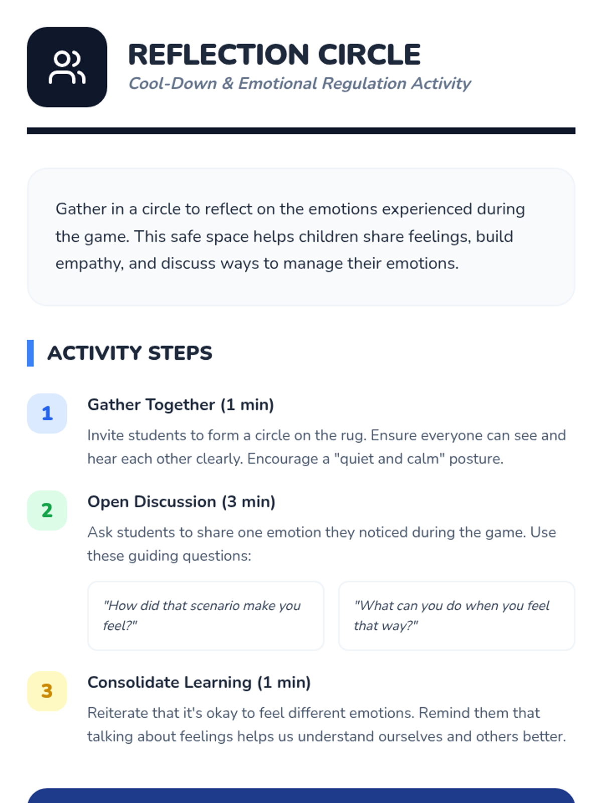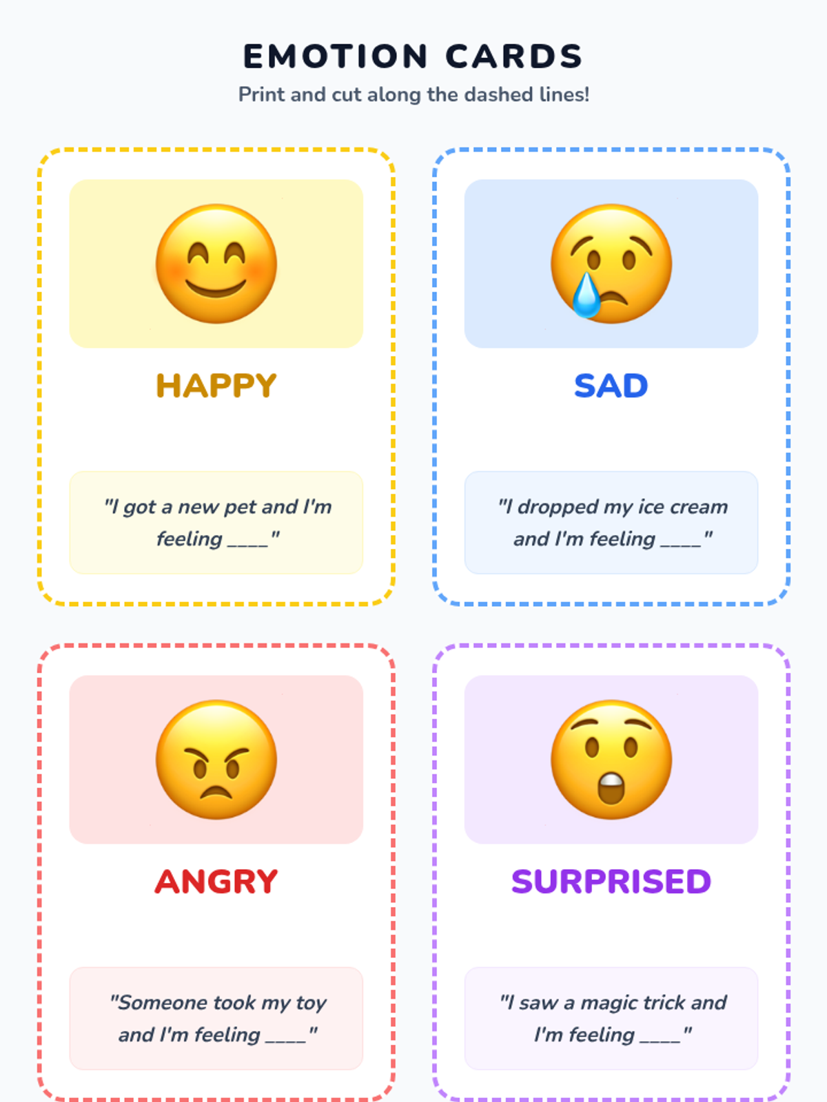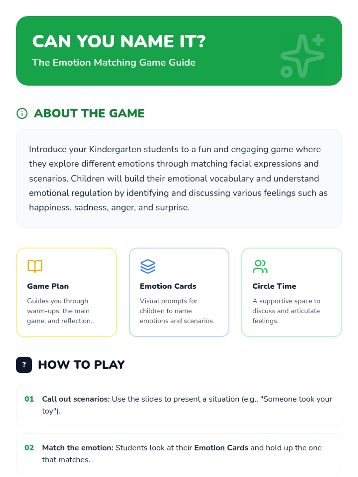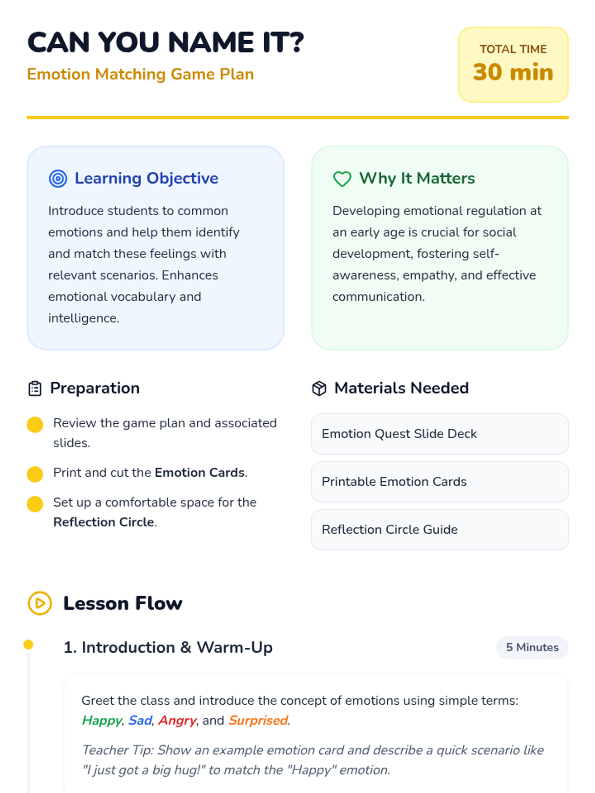 A fun, interactive 30-minute lesson for Kindergarteners to identify and match emotions with scenarios through a class game. Students build emotional vocabulary and self-awareness while practicing social skills.