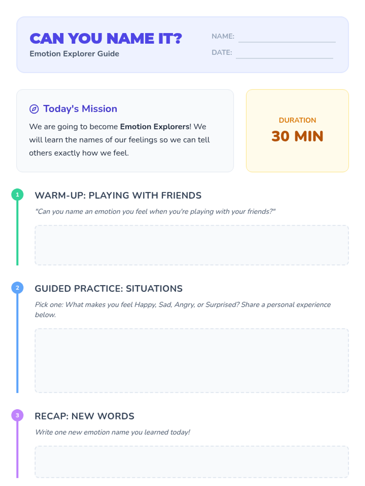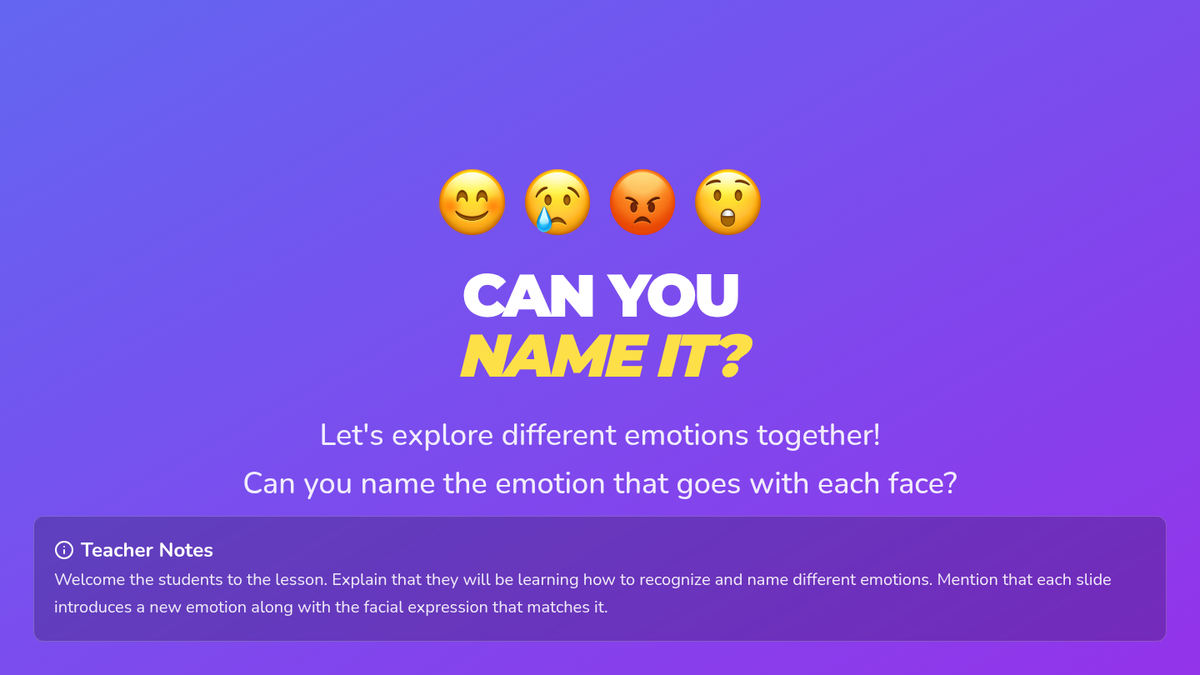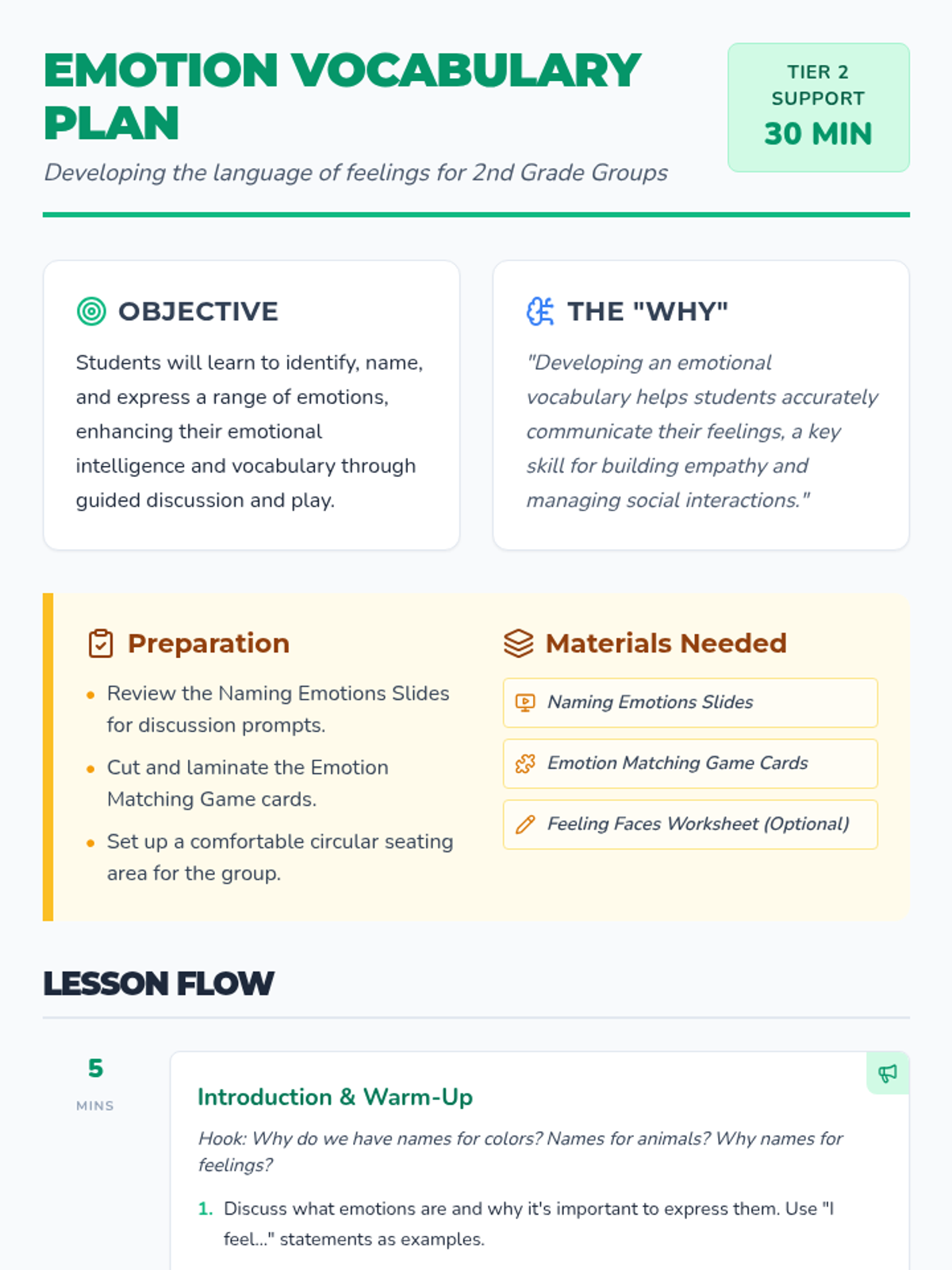 A Tier 2 group lesson designed for 2nd graders to develop emotional vocabulary by identifying, naming, and expressing feelings through interactive slides and a matching game.