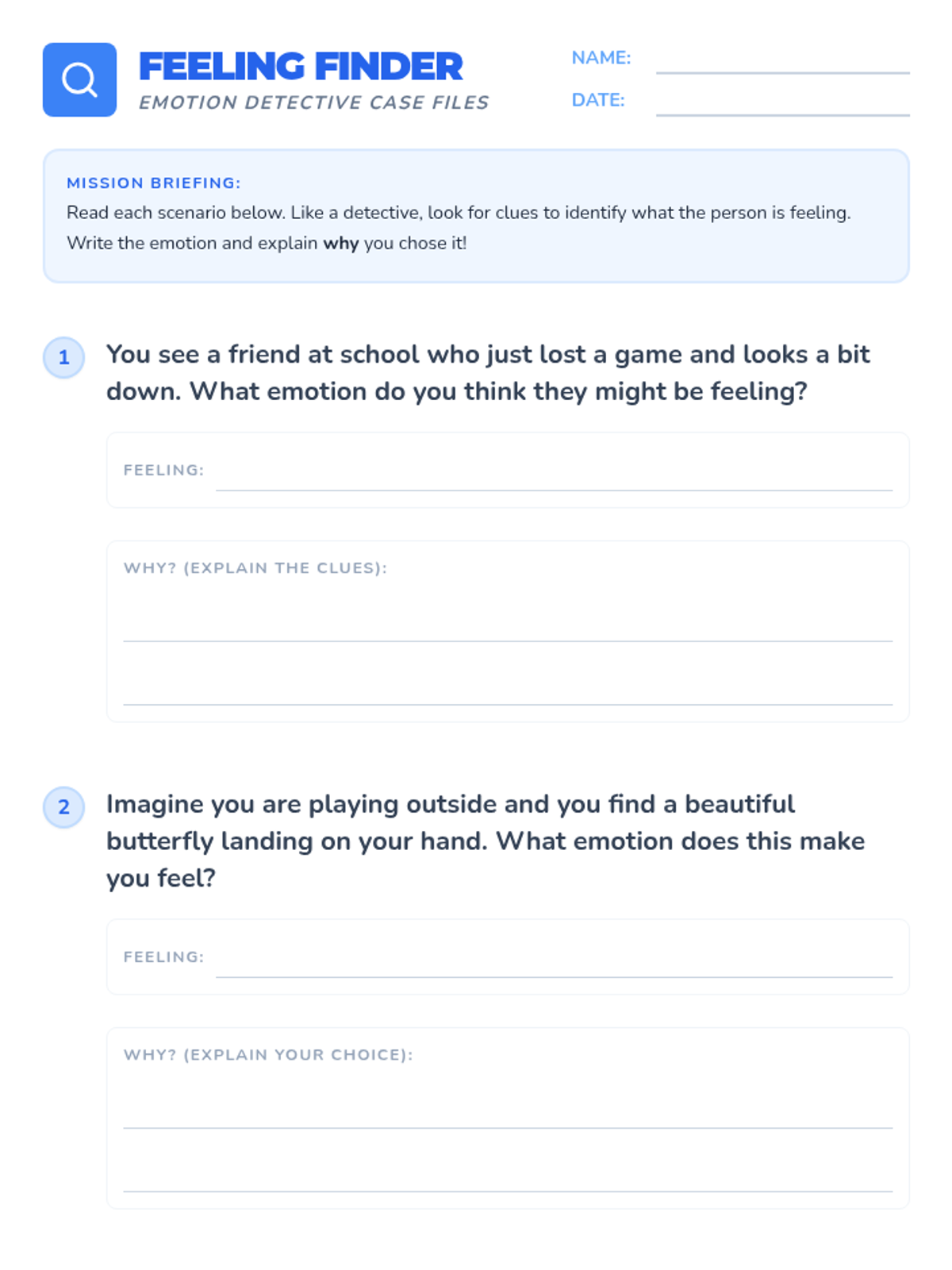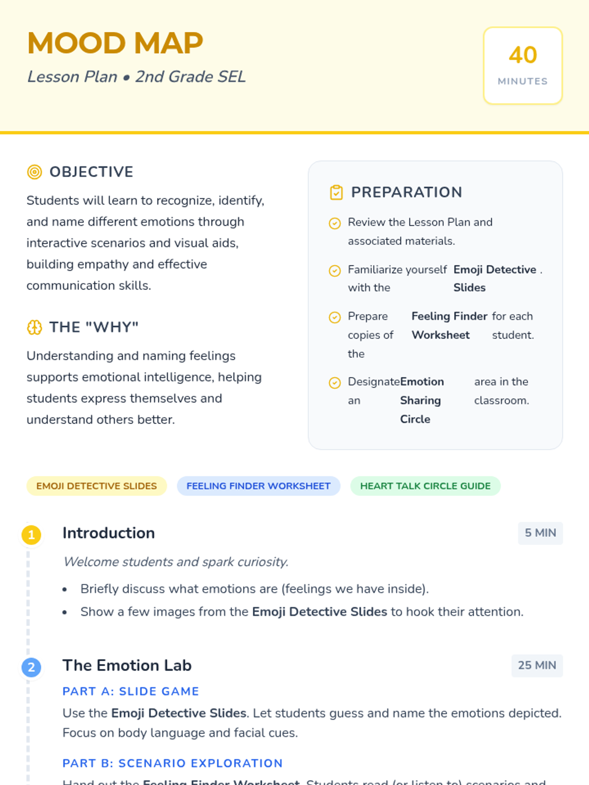 A fun and interactive 40-minute lesson for 2nd grade students to identify and name emotions using visual aids and scenarios, fostering emotional intelligence and empathy.