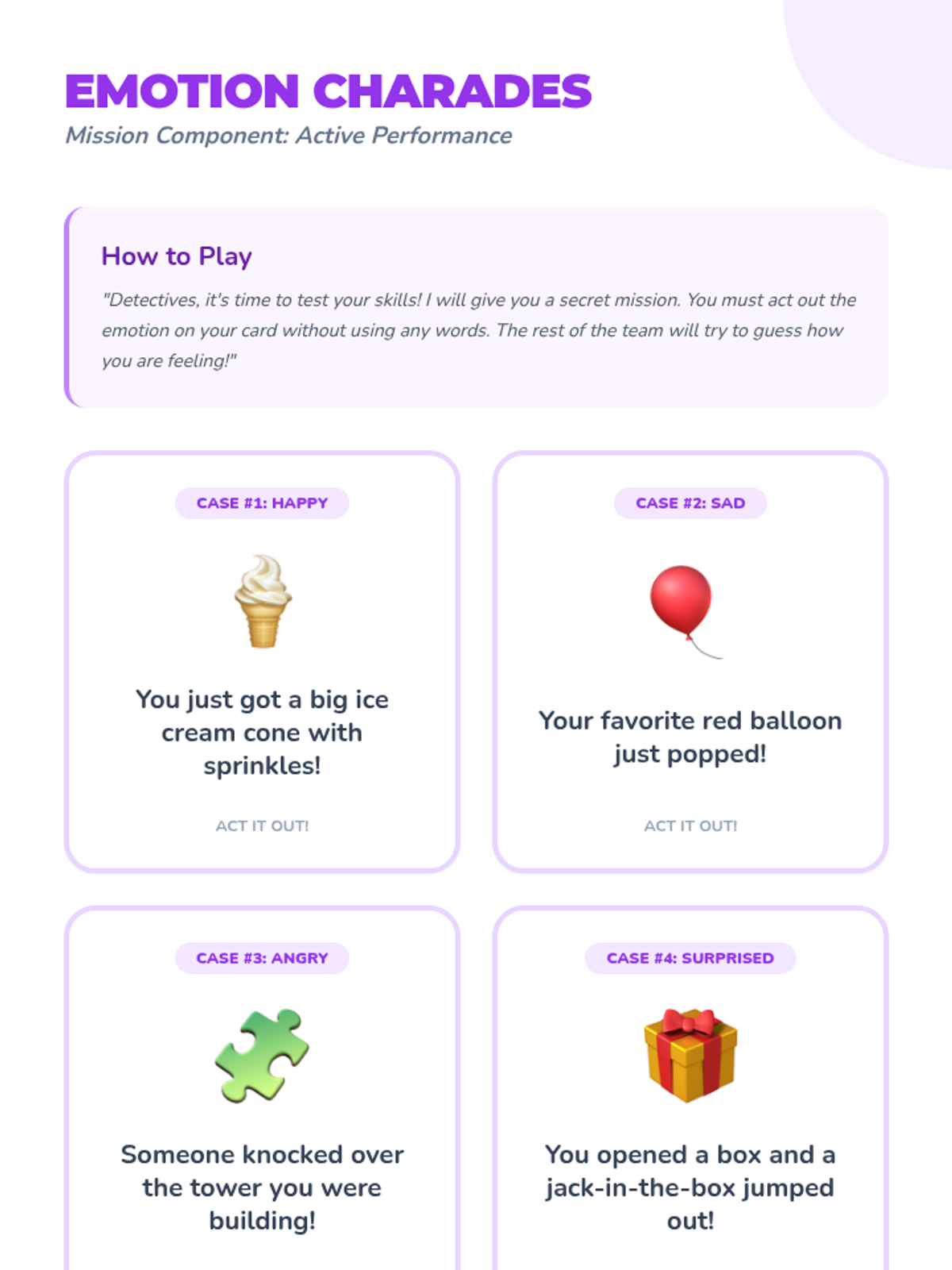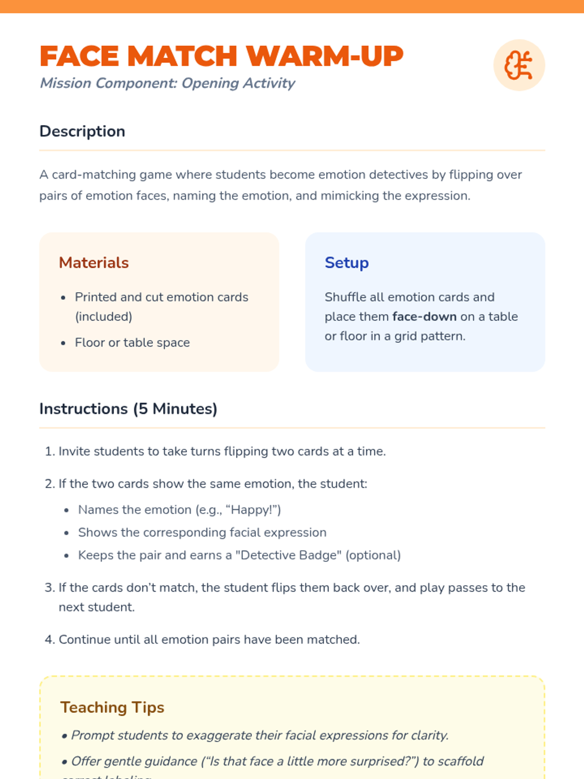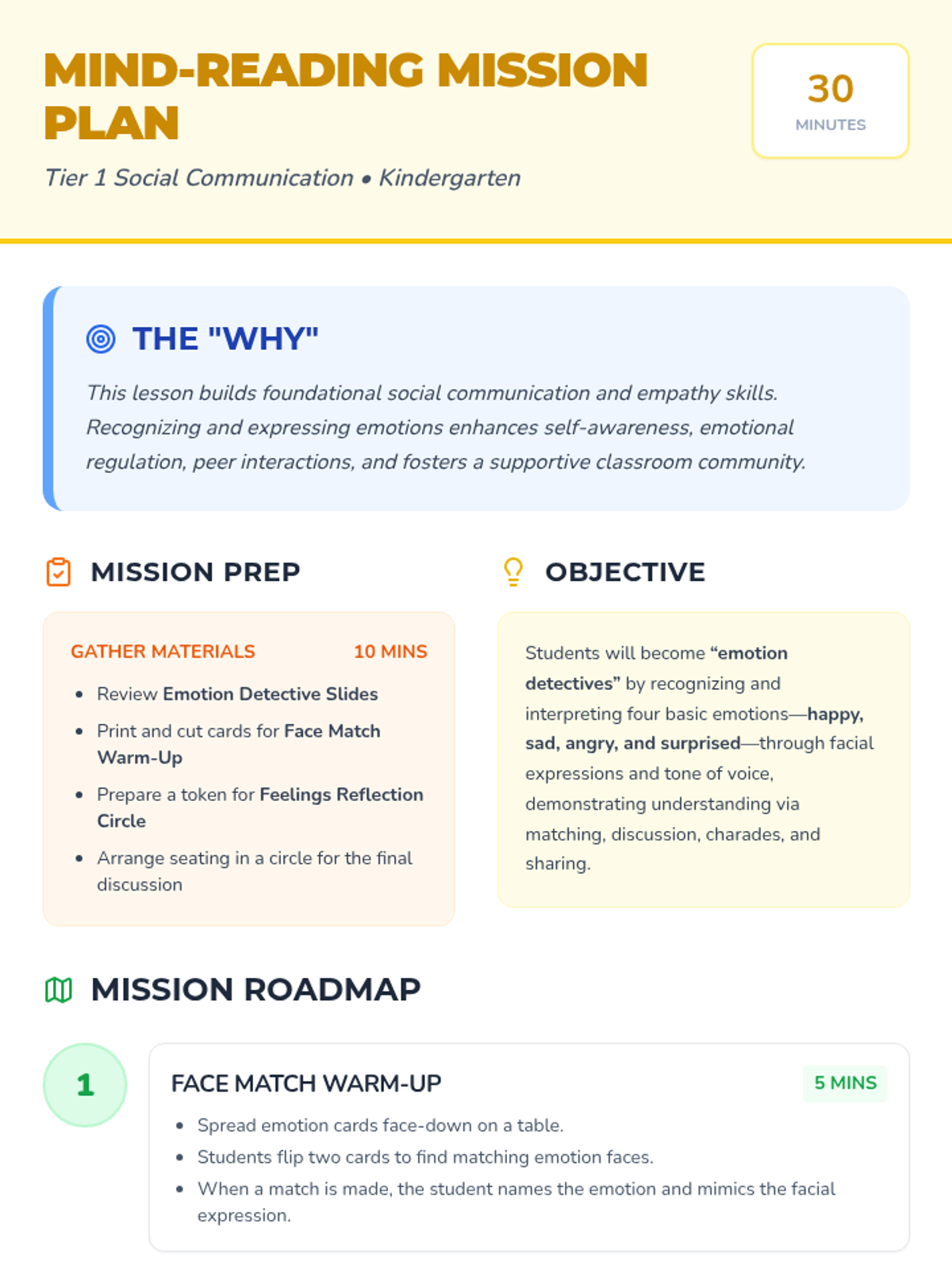 A kindergarten Tier 1 lesson where students become 'emotion detectives' to recognize and interpret basic emotions through facial expressions and tone of voice.