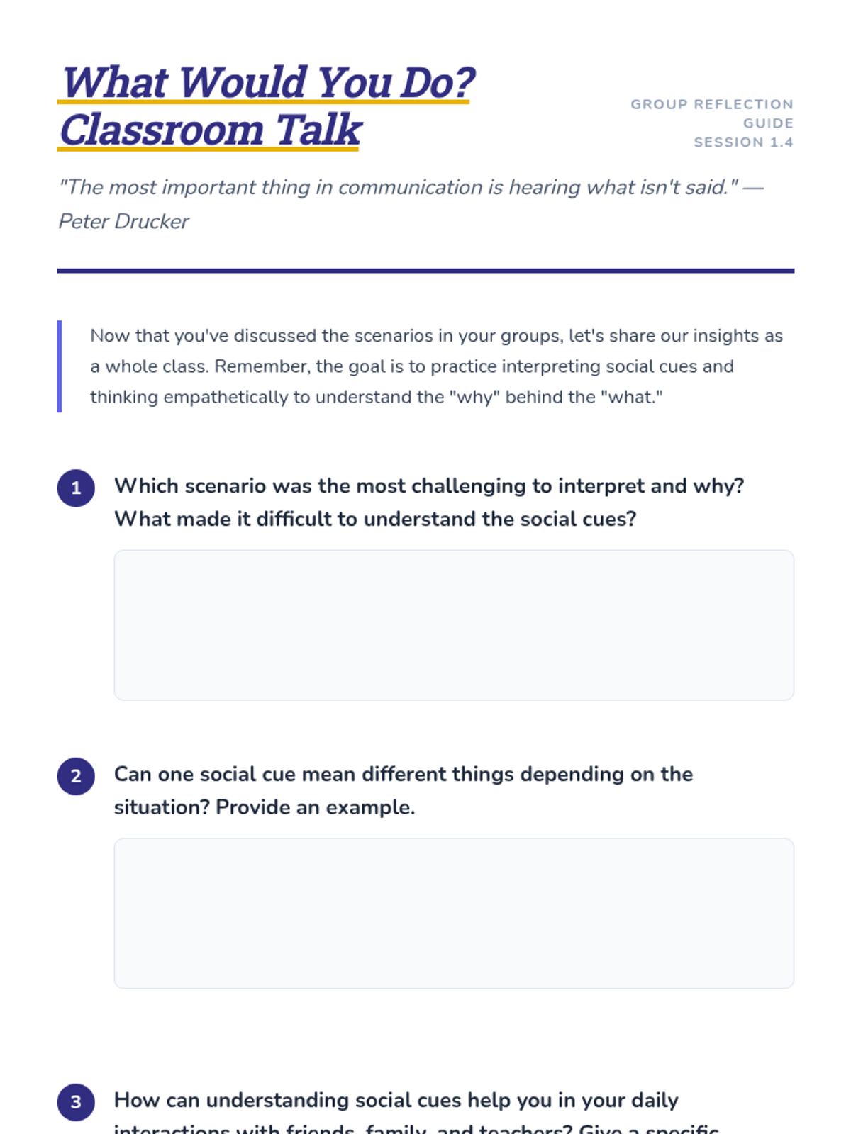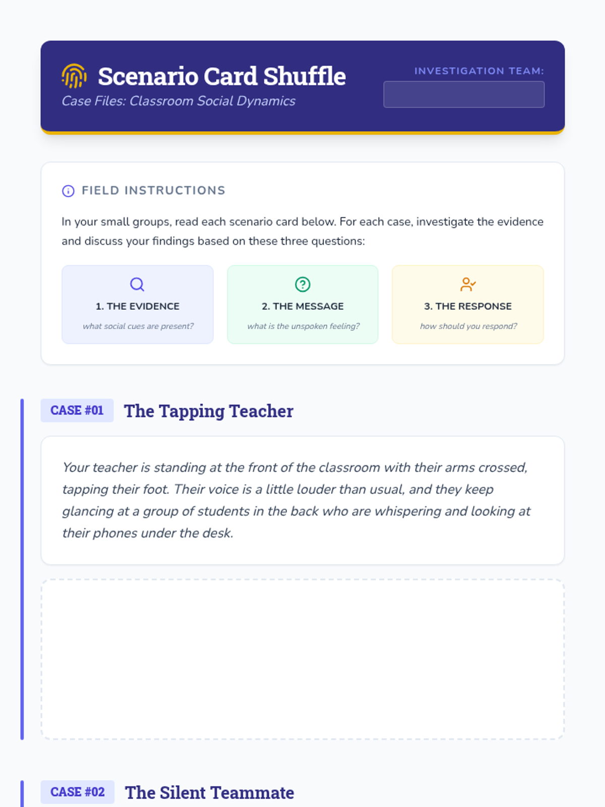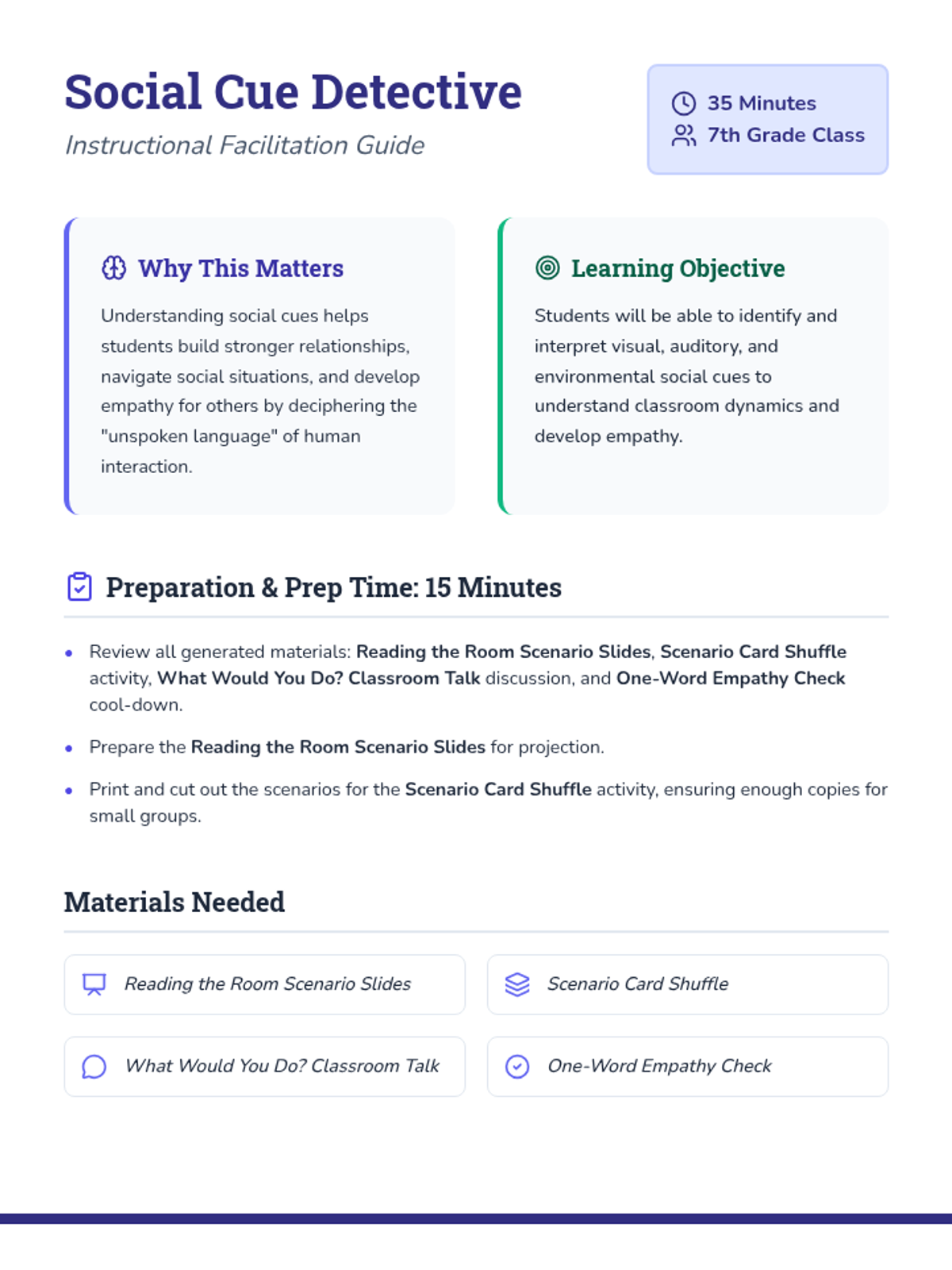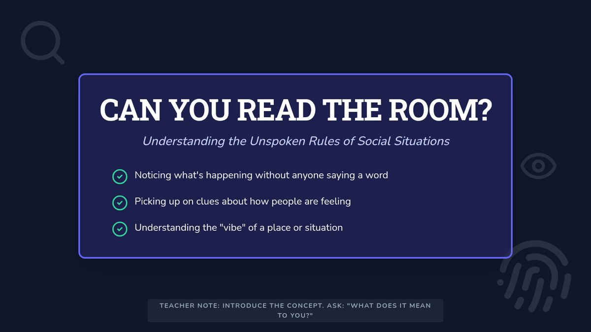 A 35-minute lesson for 7th graders on interpreting social cues, facial expressions, and environmental signals to build empathy and navigate social dynamics.