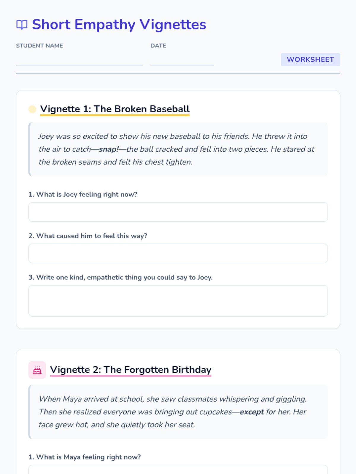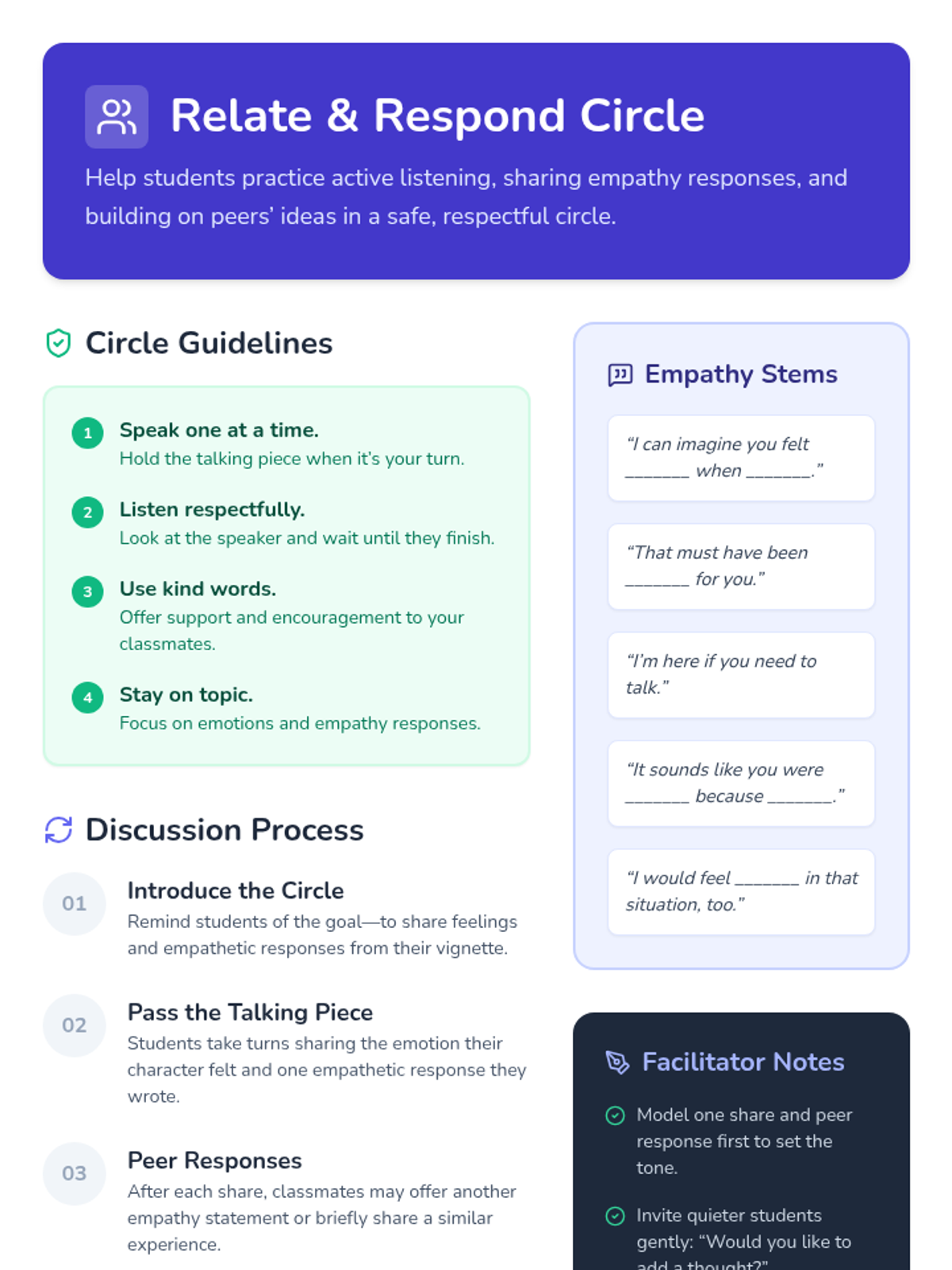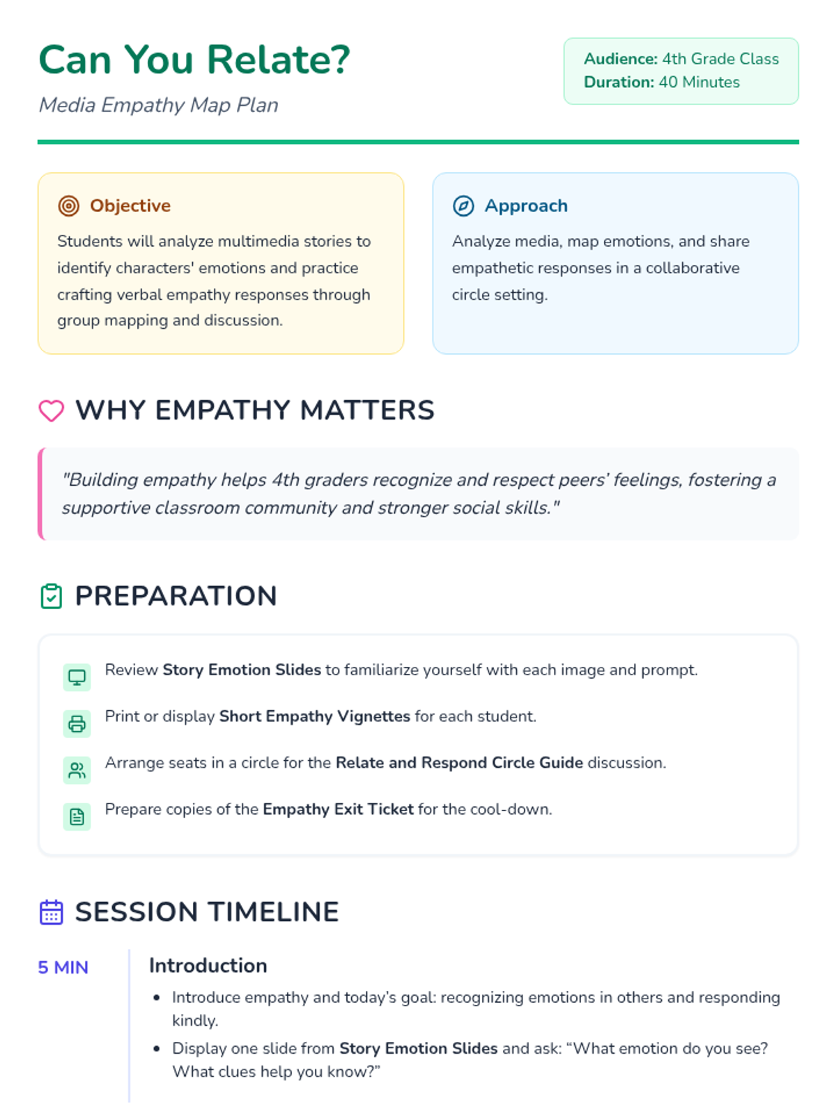 A whole-class interactive discussion using multimedia stories to identify emotions in others and practice verbal empathy responses. Students analyze media, map emotions, and engage in a circle discussion to build social awareness.