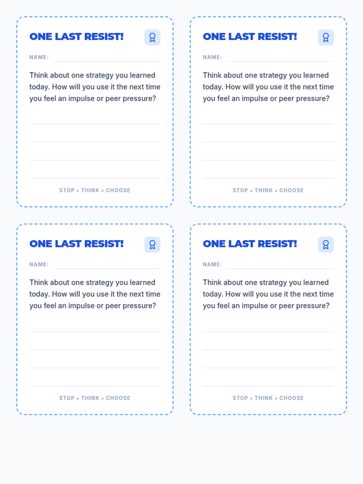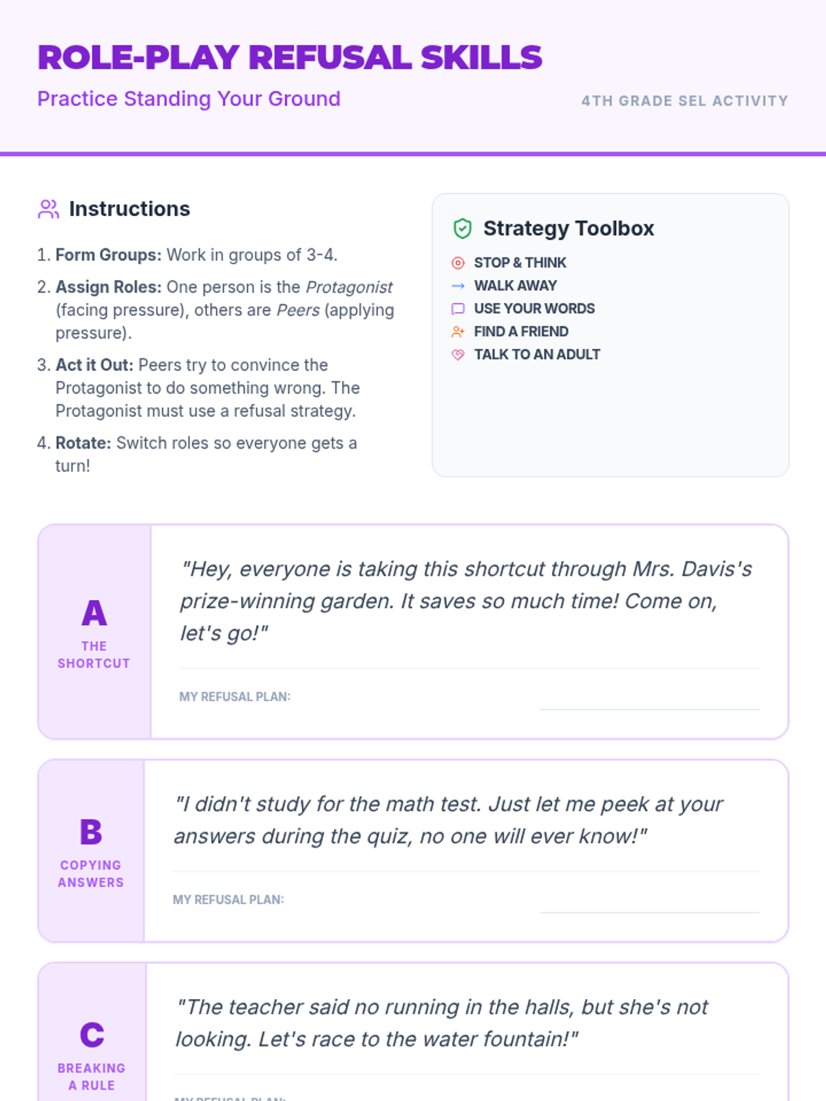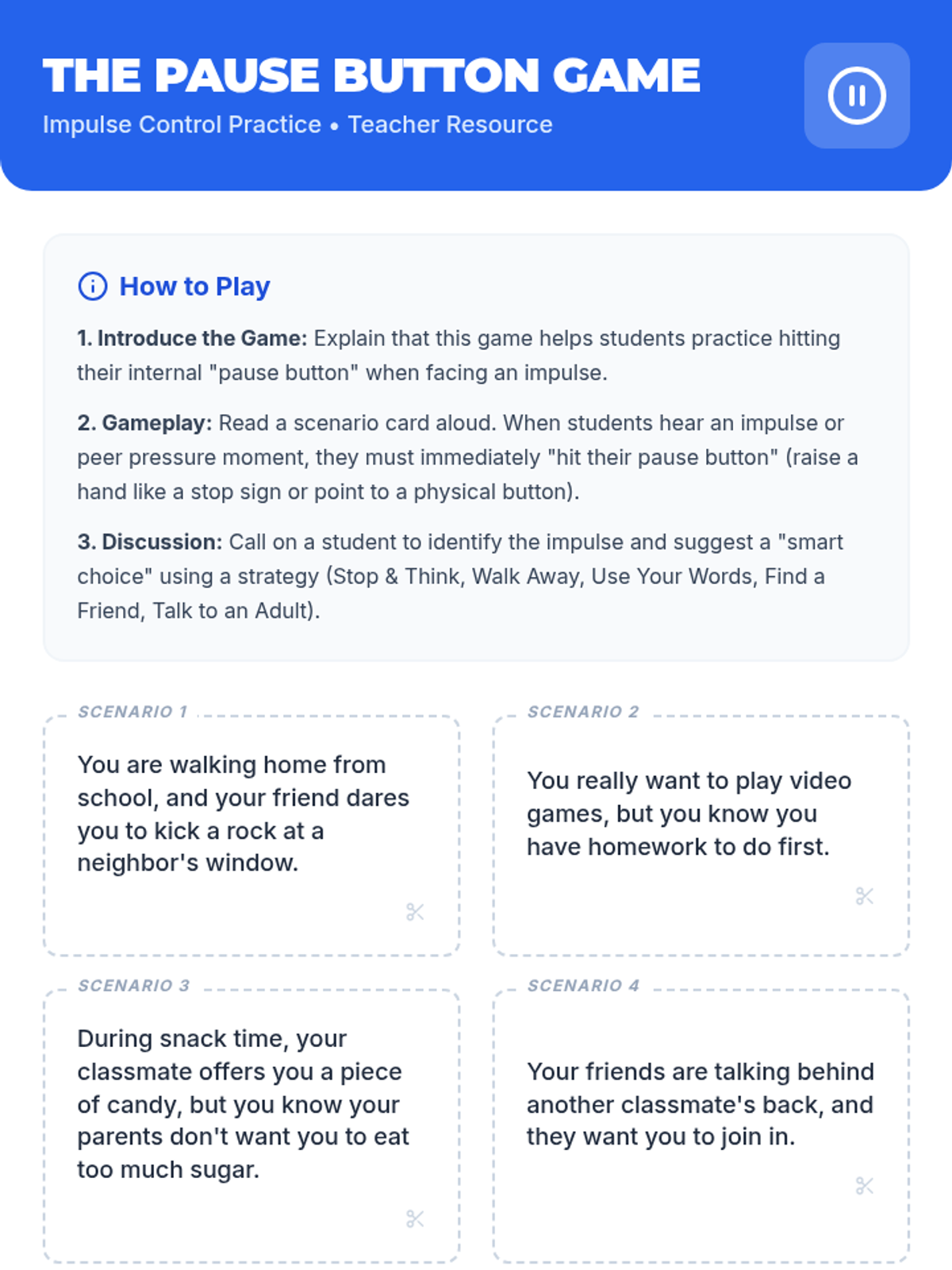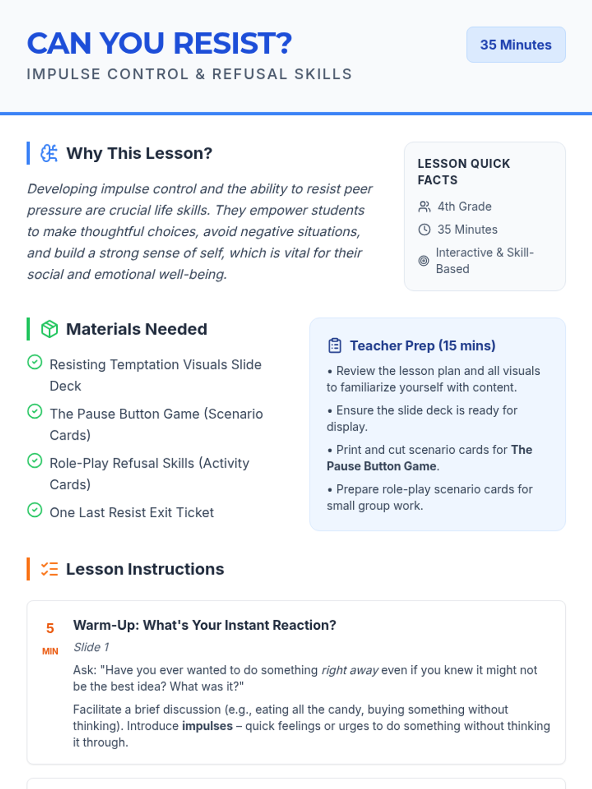 A social-emotional learning lesson for 4th graders focused on understanding impulses, resisting peer pressure, and practicing the 'Pause Button' strategy for better decision-making.