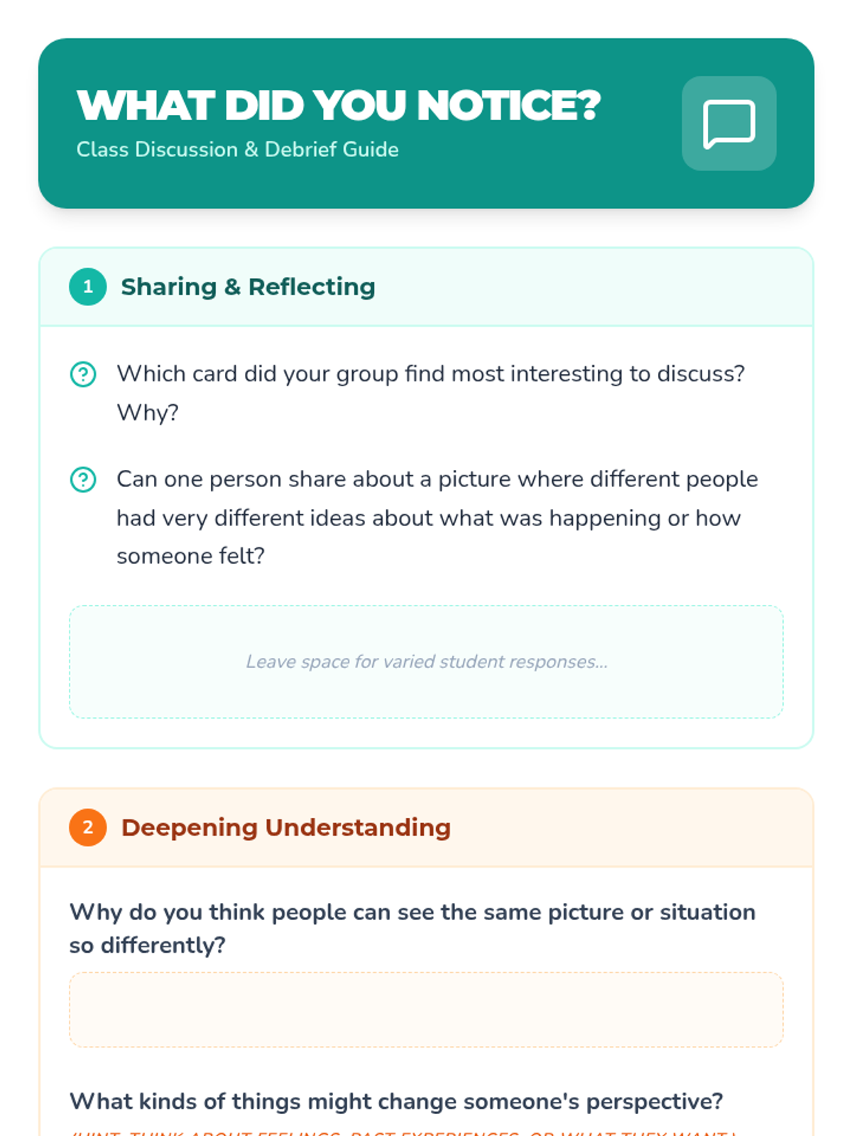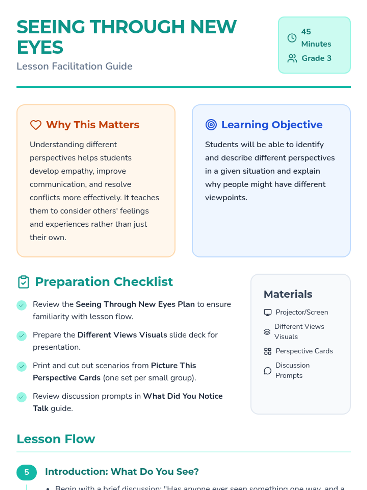 A 45-minute social-emotional learning lesson for 3rd graders that explores perspective-taking through visual scenarios, small group discussions, and empathy-building activities.