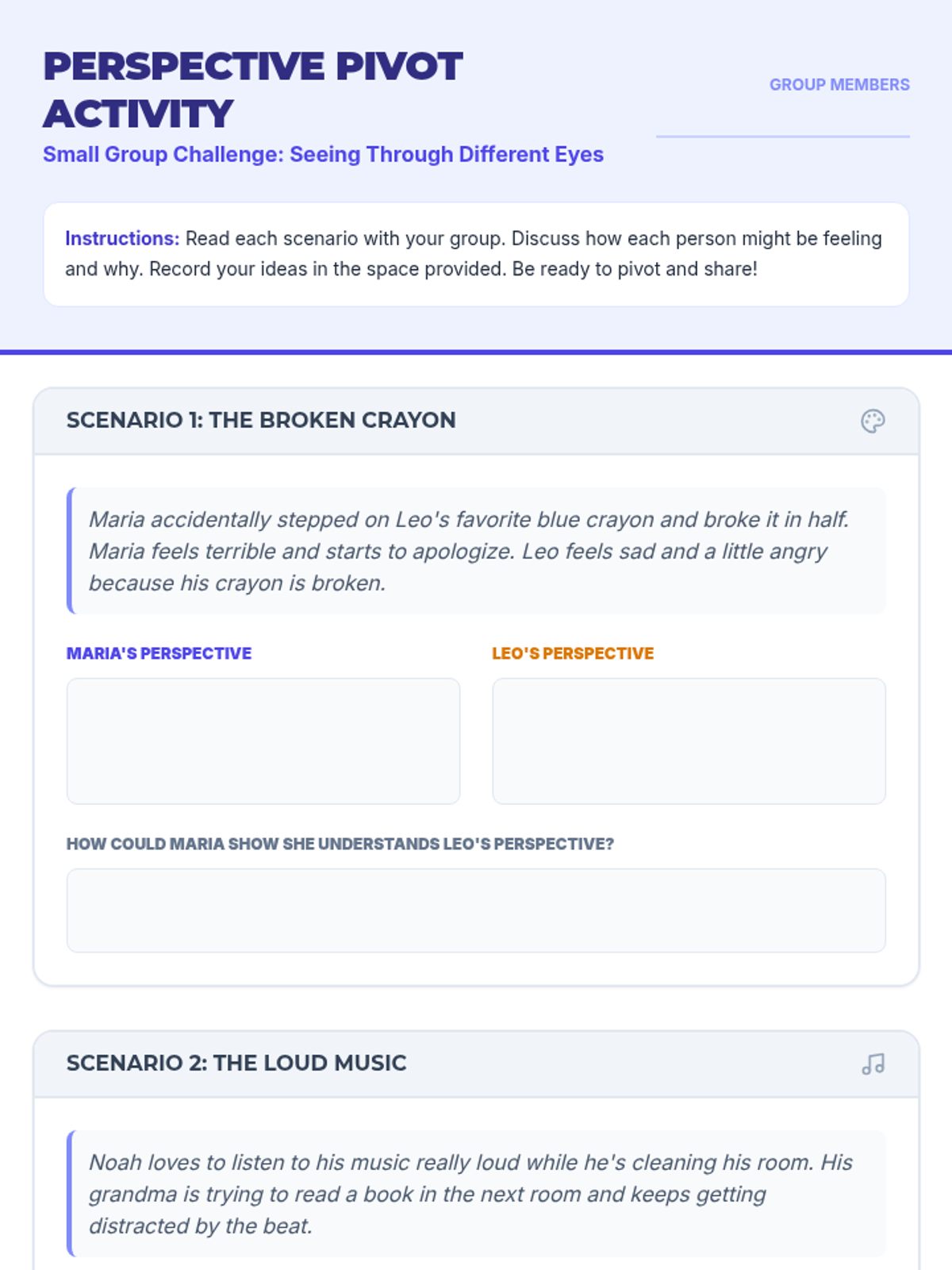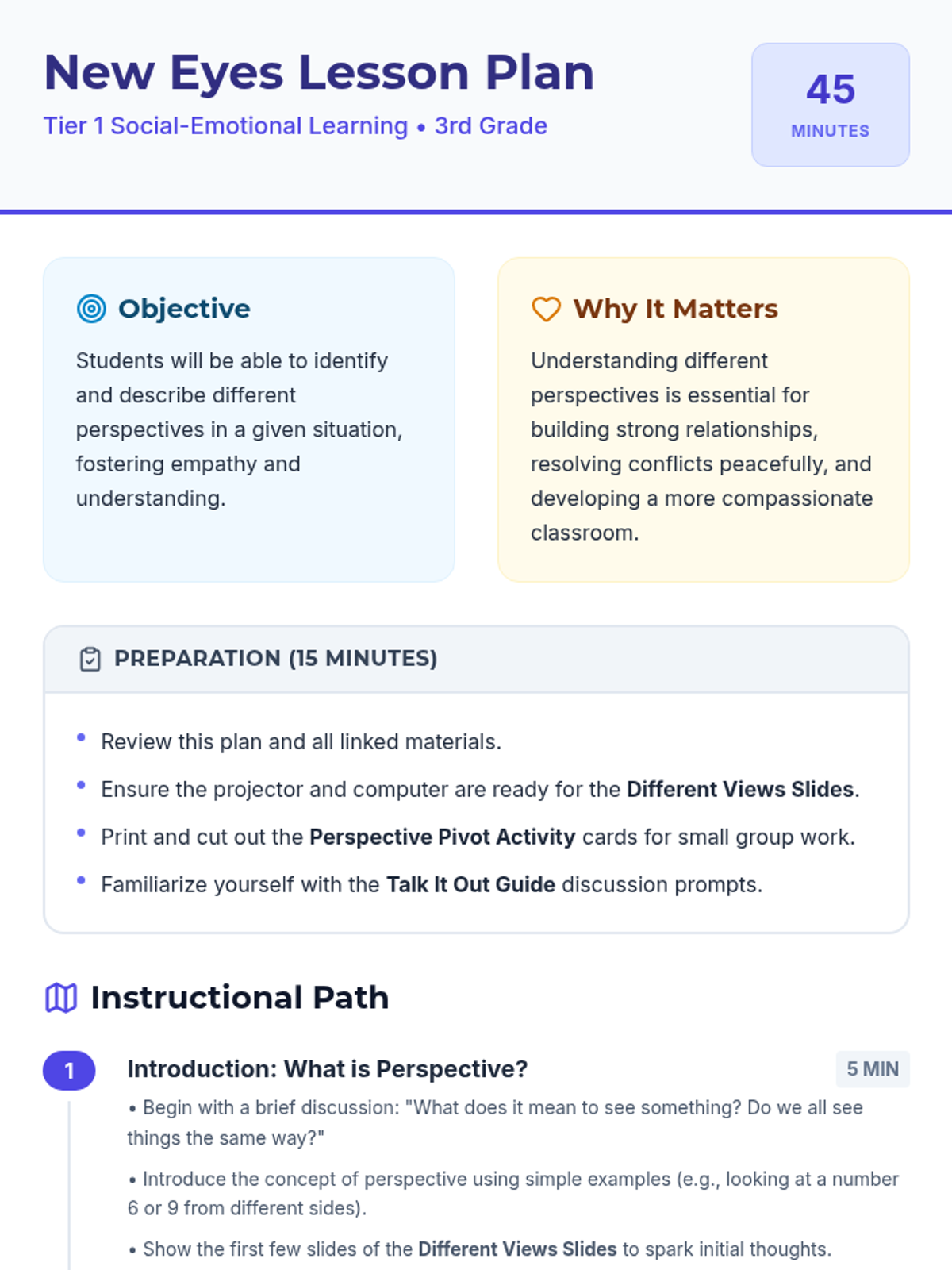 A 3rd-grade social-emotional learning lesson focused on understanding different perspectives and fostering empathy through visual scenarios and group discussion.