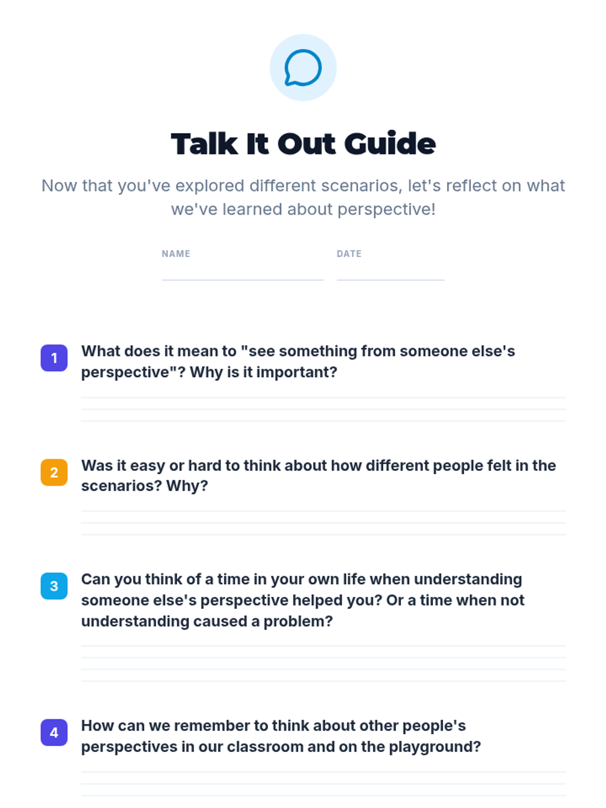A set of reflection tools for students in grades K-5 to process behavioral incidents through the lens of core values: Respect, Responsibility, and Regard for Others. Includes tiered versions for lower and upper elementary students.
