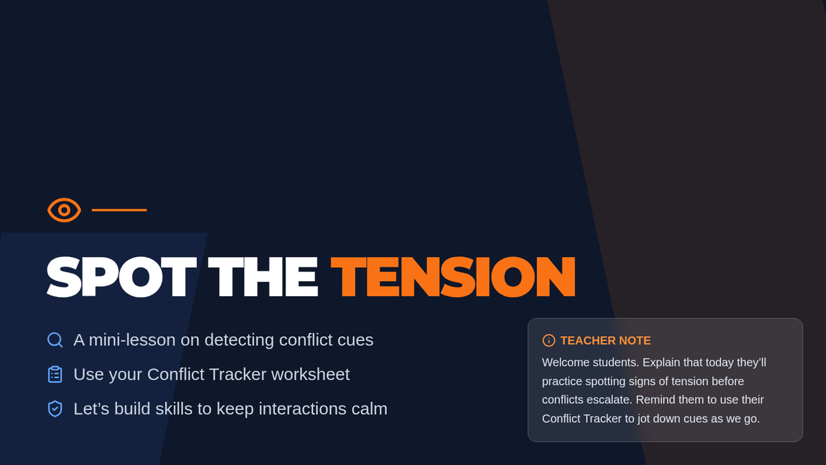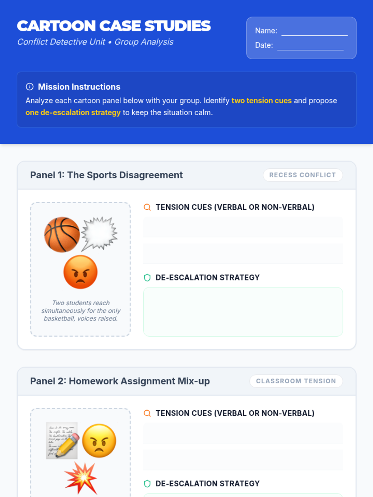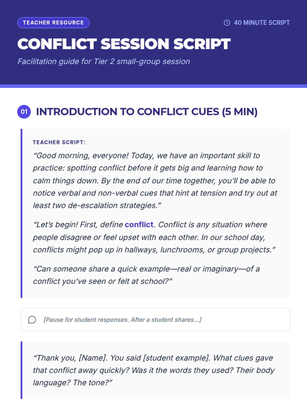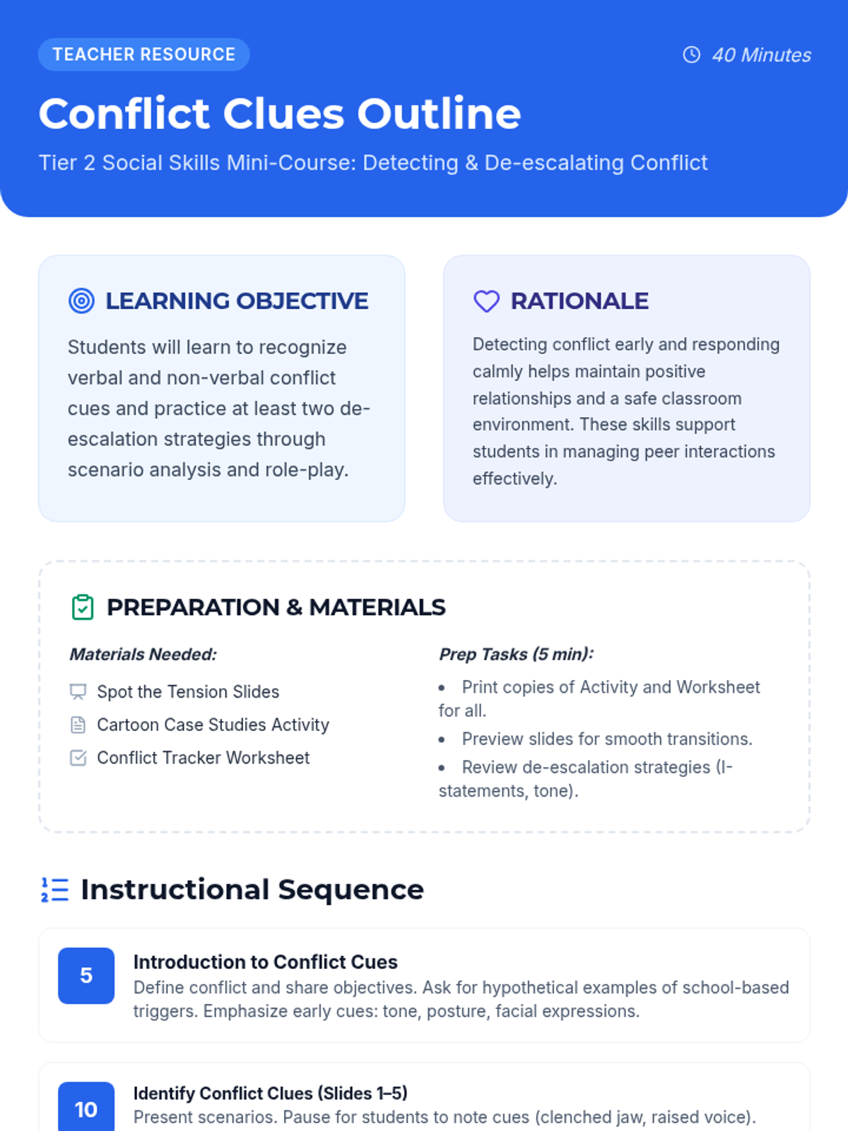 A 40-minute Tier 2 small-group session for 8th graders focused on identifying verbal and non-verbal conflict cues and practicing de-escalation strategies through scenario analysis and role-play.