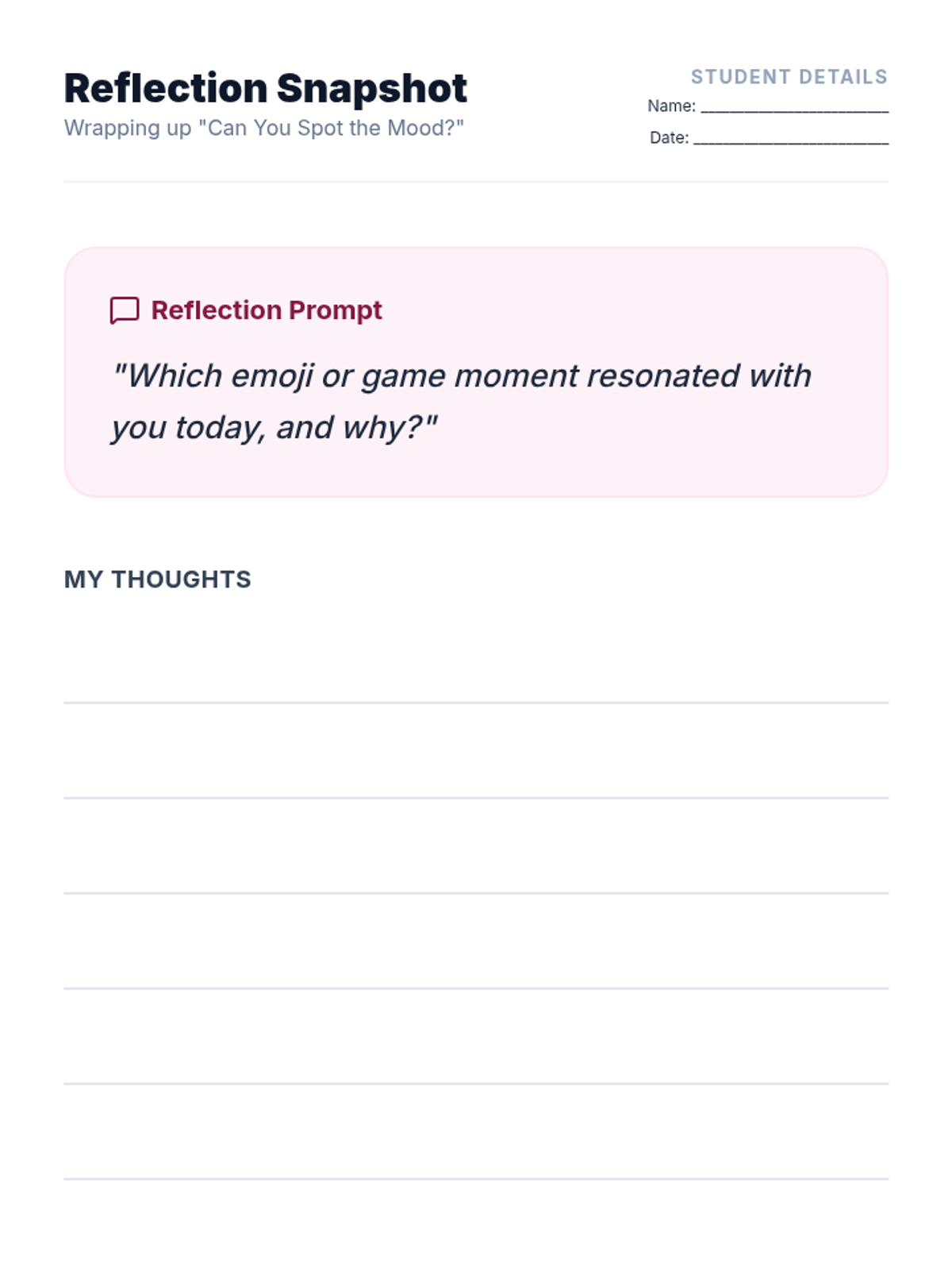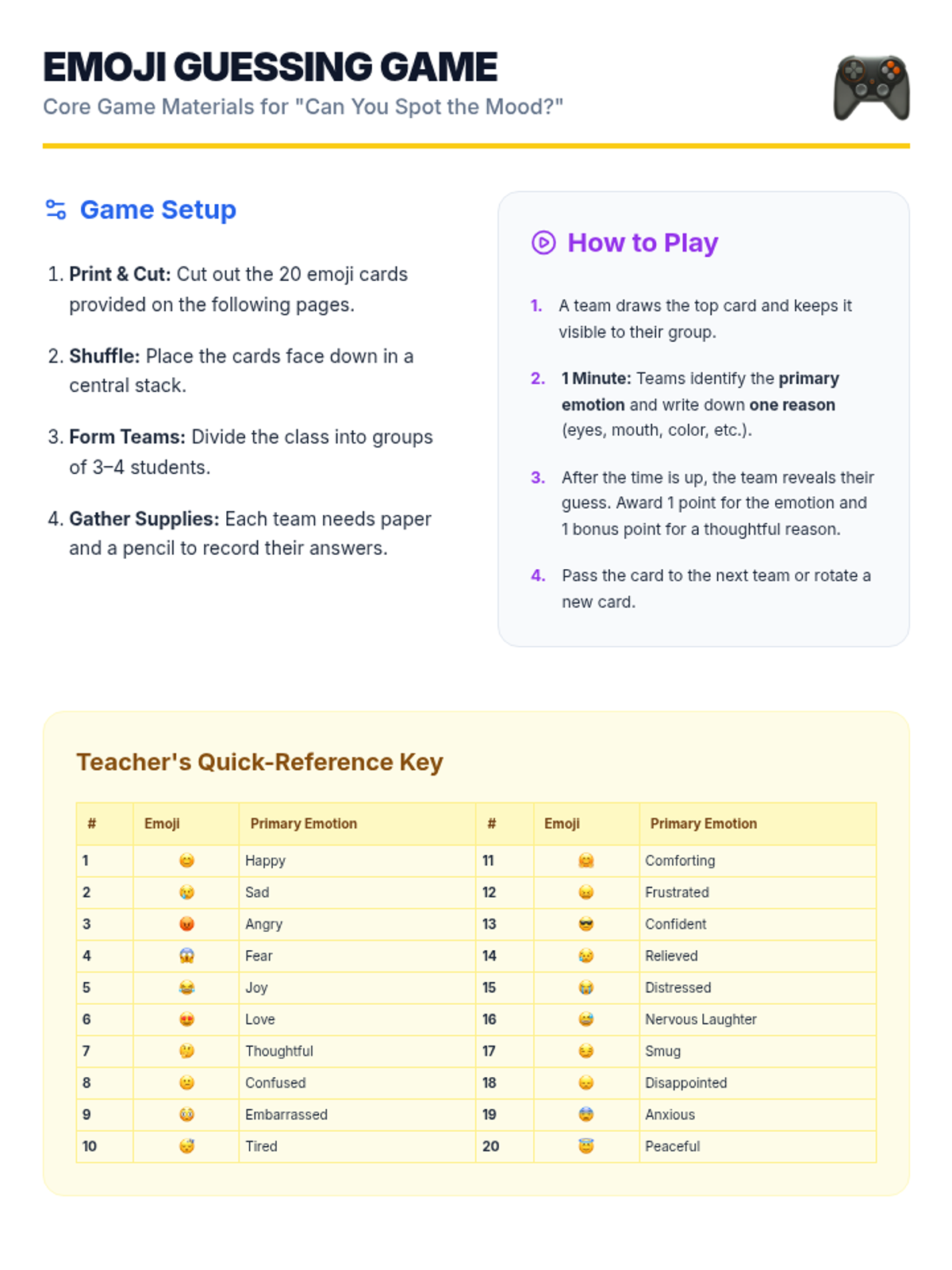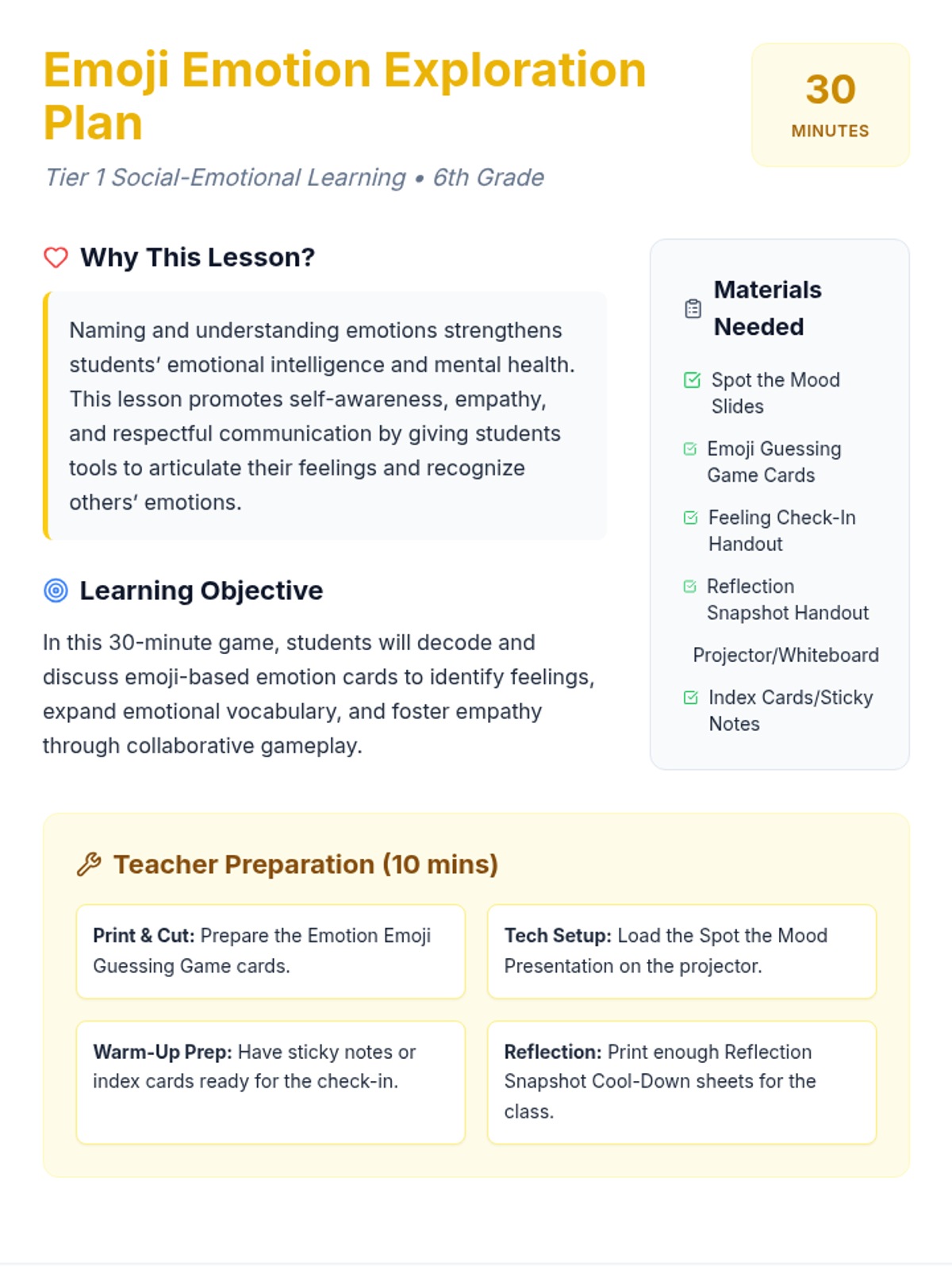 In this 30-minute Tier 1 classroom game for 6th graders, students decode emoji cards to identify and discuss emotions, building emotional vocabulary and empathy. This high-energy lesson uses interactive gameplay and reflection to promote mental and emotional health.