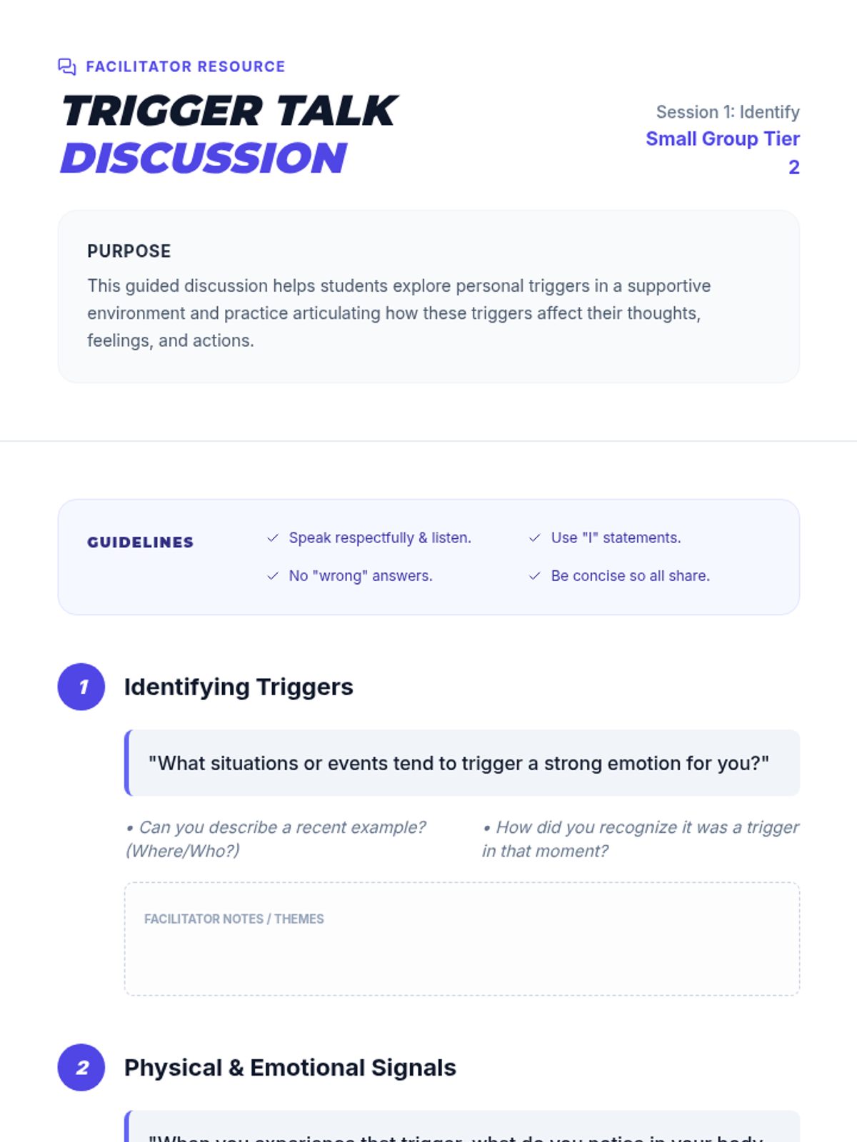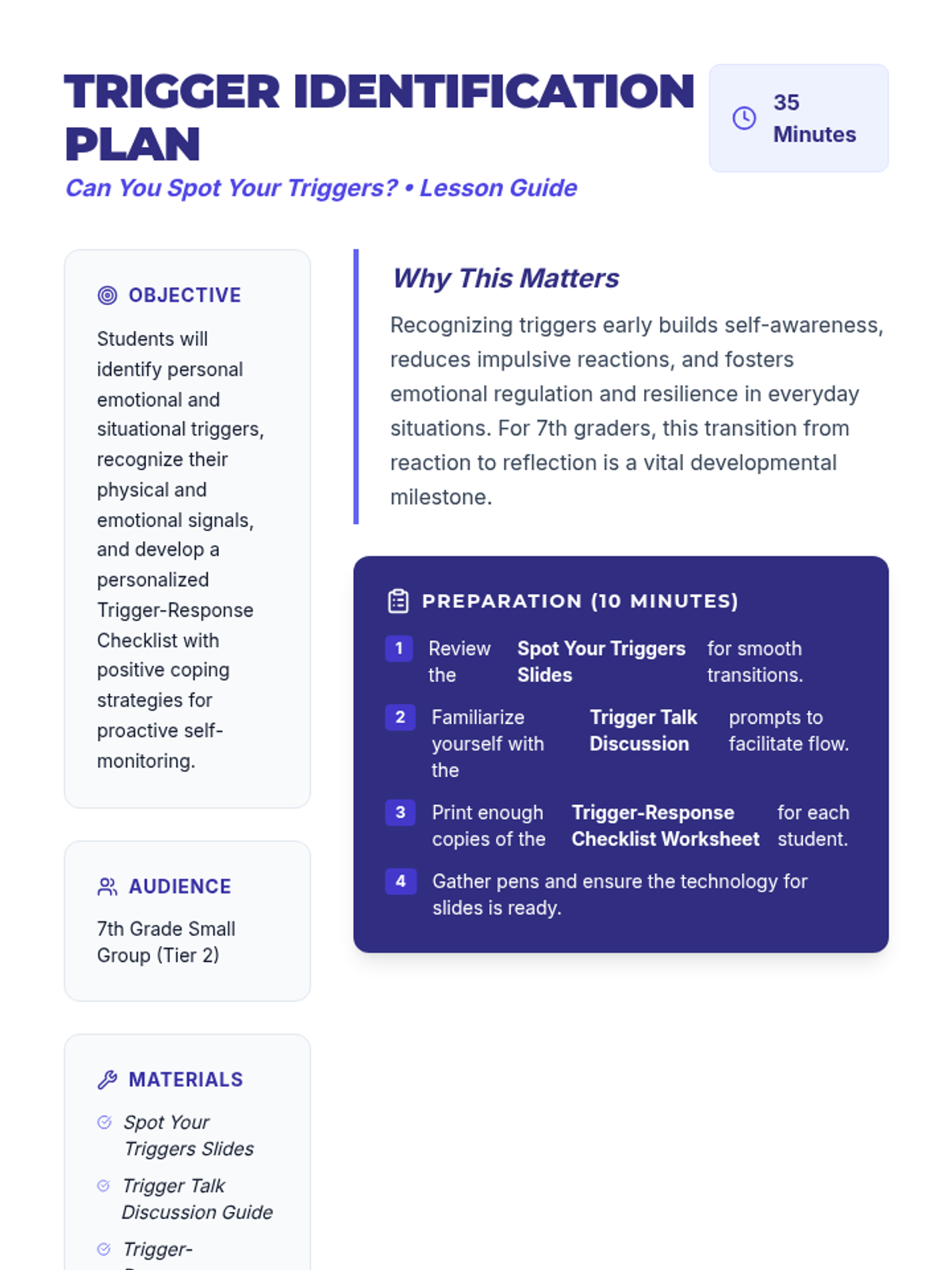 A Tier 2 social-emotional learning lesson for 7th graders focused on identifying personal triggers and developing proactive coping strategies. Students explore the science of emotional reactions and create a personalized monitoring tool.