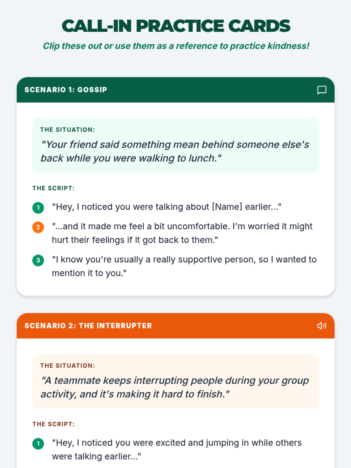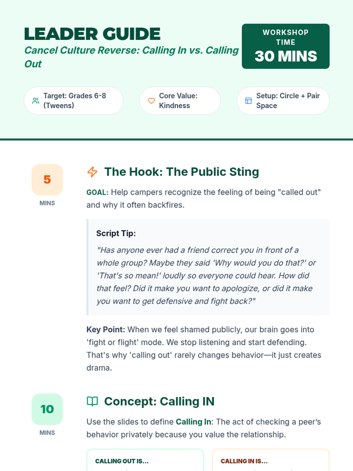 A 30-minute interactive workshop for camp counselors to lead with tweens (grades 6-8), focusing on the shift from public shaming (calling out) to private, kind correction (calling in). Students practice real-world role-plays to build a culture of kindness and accountability.