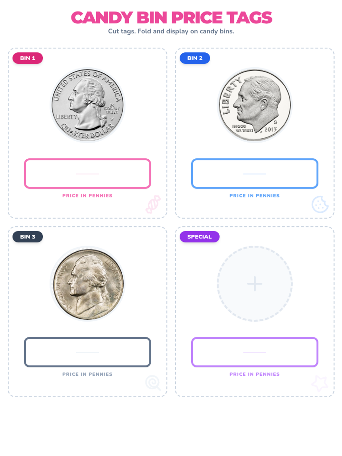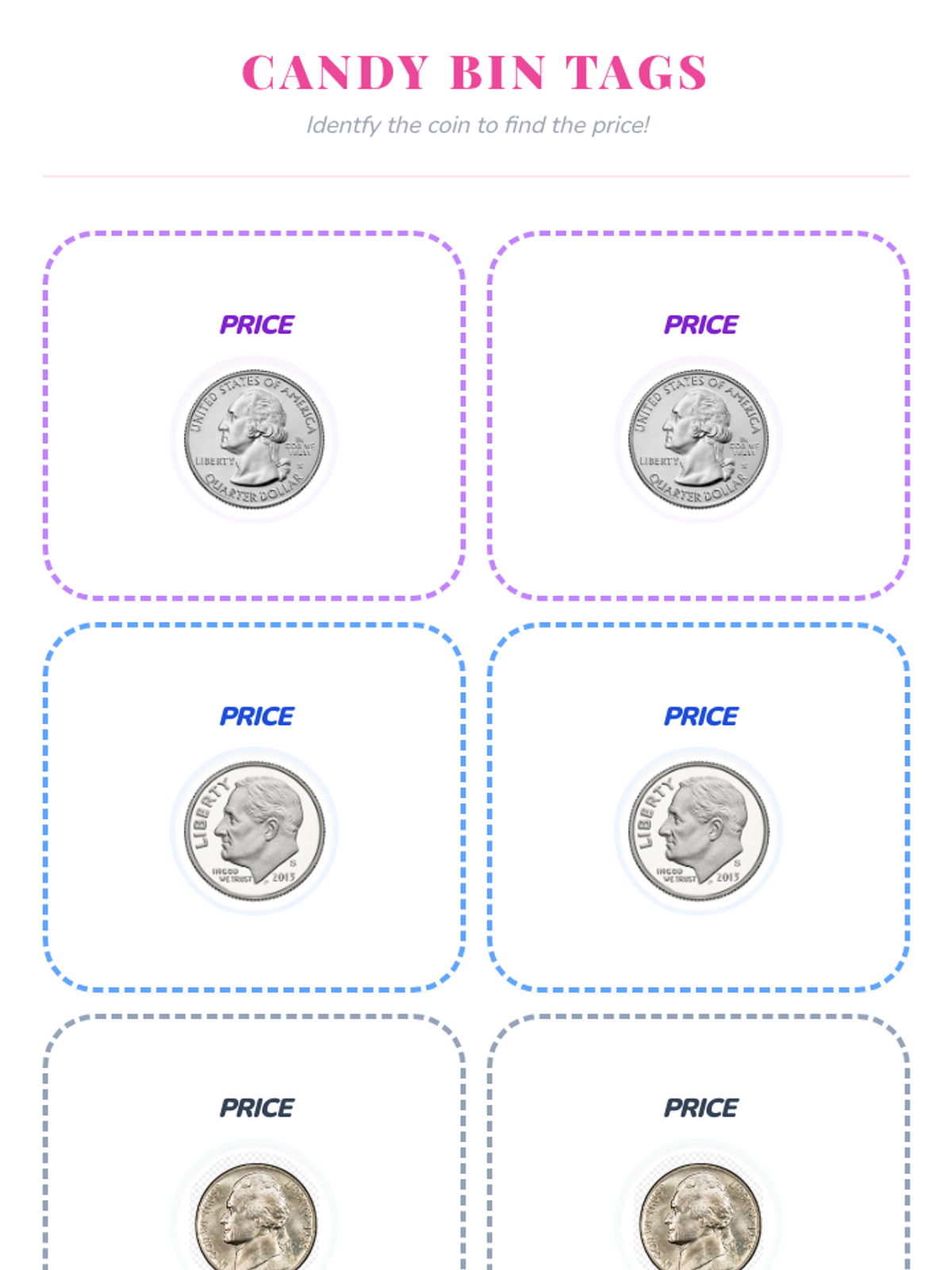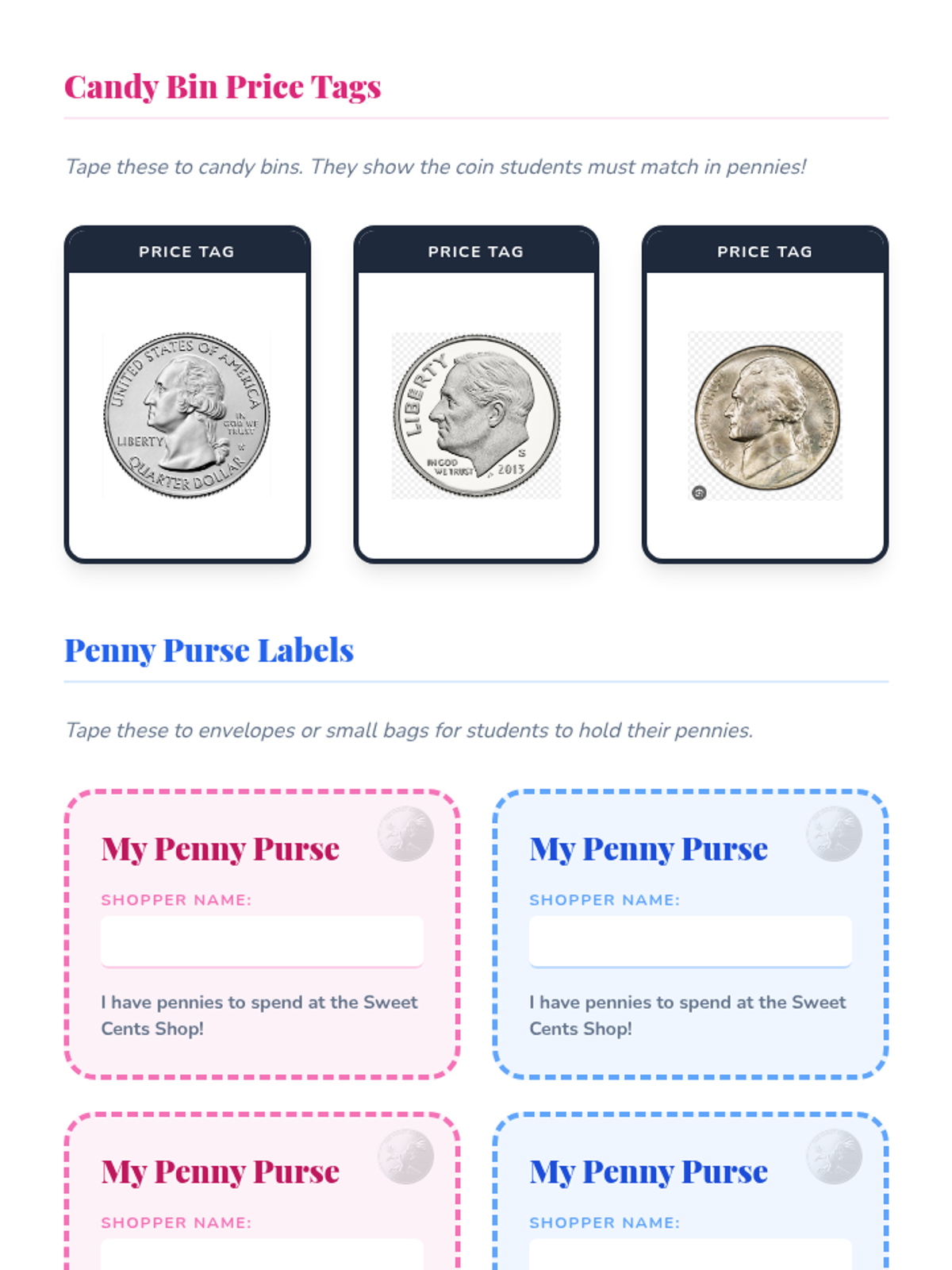 A candy-shop themed lesson where students identify pennies, nickels, dimes, and quarters and their values, culminating in a hands-on activity using pennies to 'buy' candy from price-labeled bins.