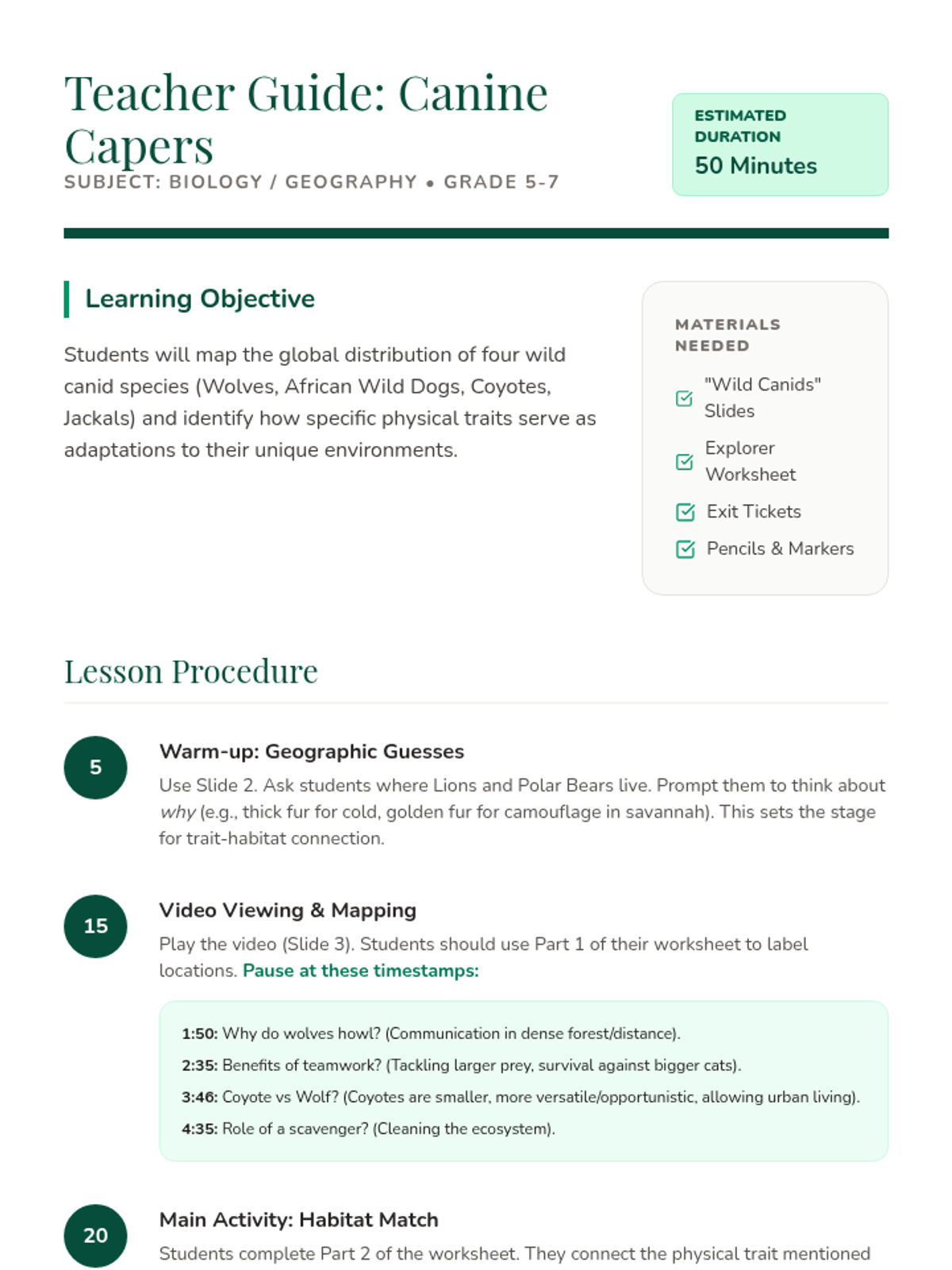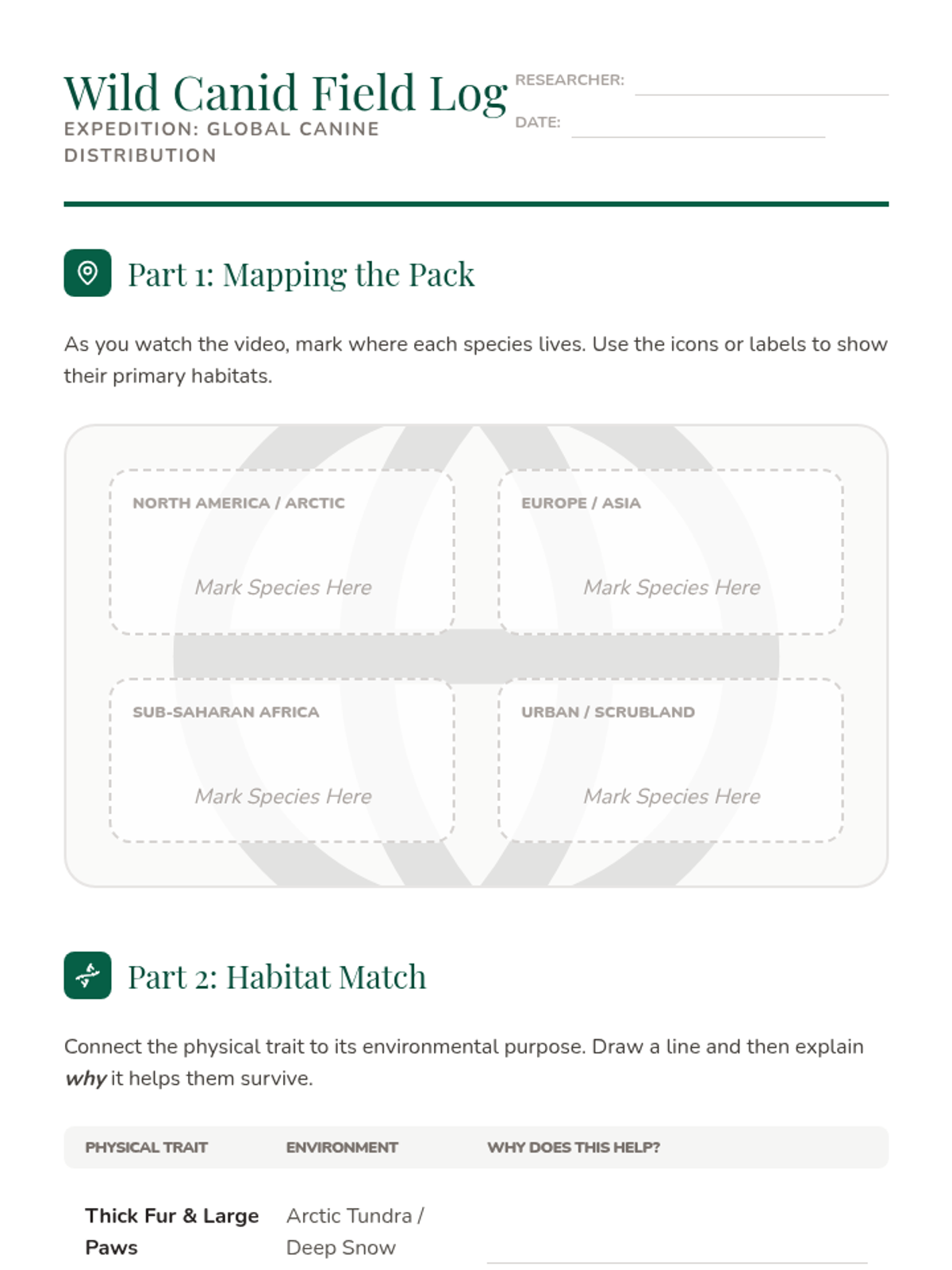 Students will explore the global distribution of wild canids, mapping their habitats and analyzing how physical traits like ear size and fur thickness are adaptations to specific environments.
