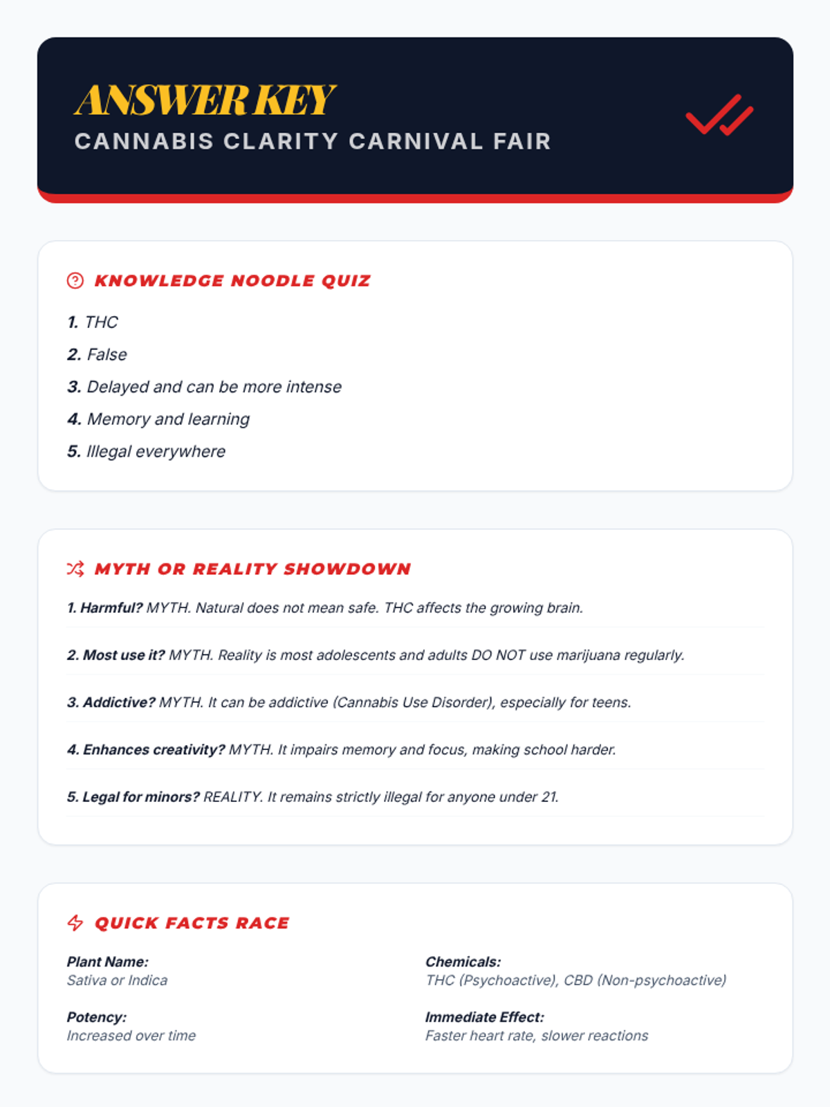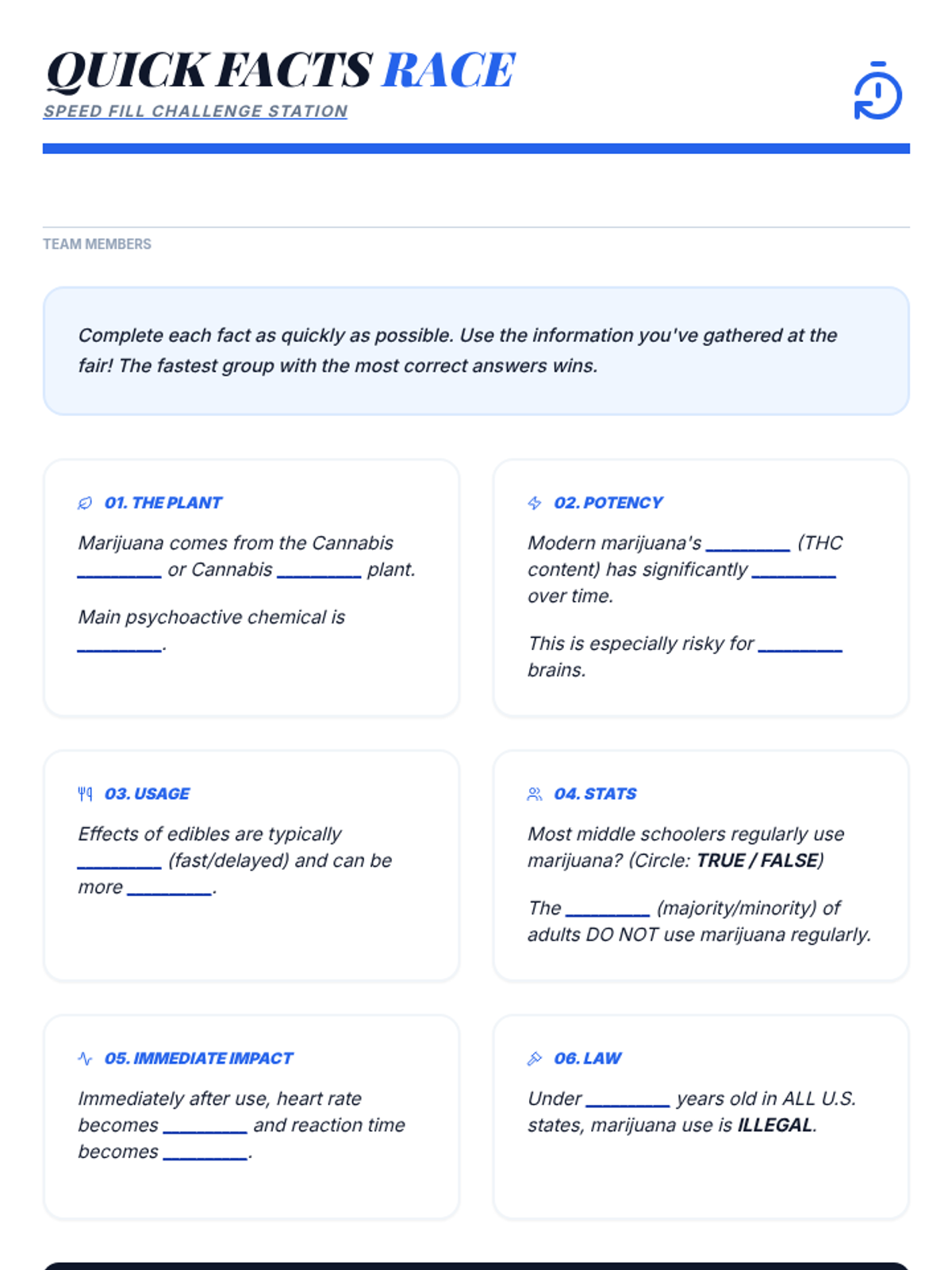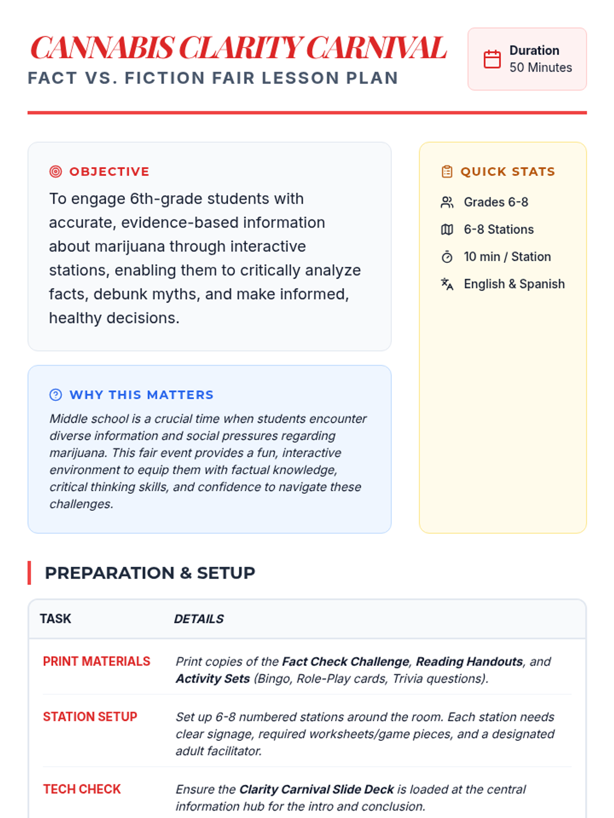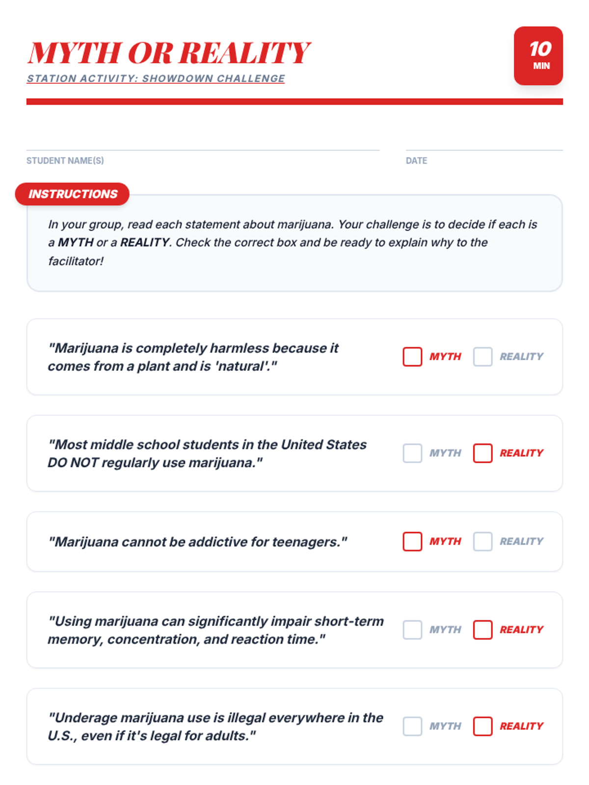 An interactive 50-minute fair where students rotate through various stations to learn the truth about marijuana. This lesson uses games, role-plays, and discussions to build critical thinking and healthy decision-making skills.