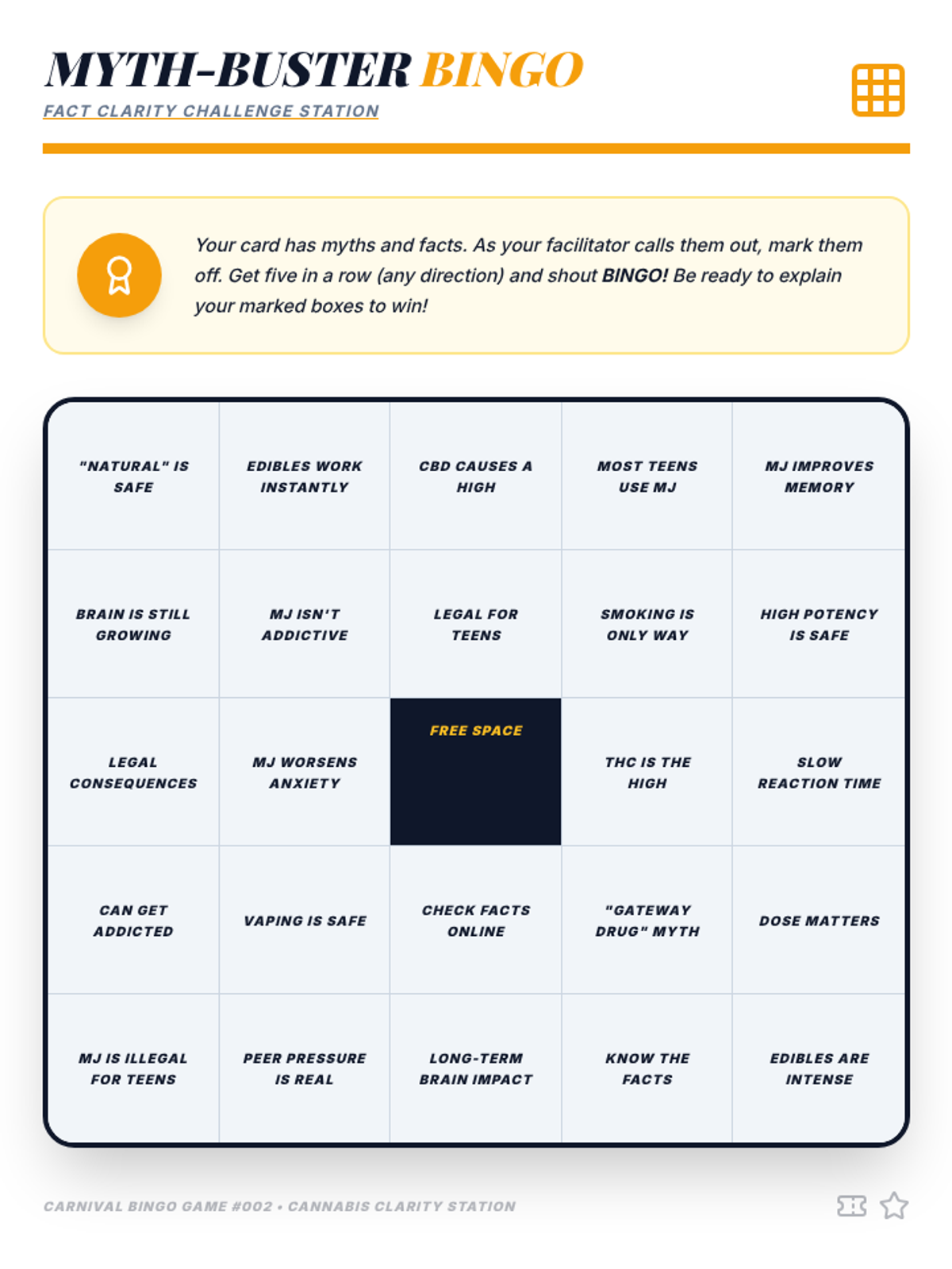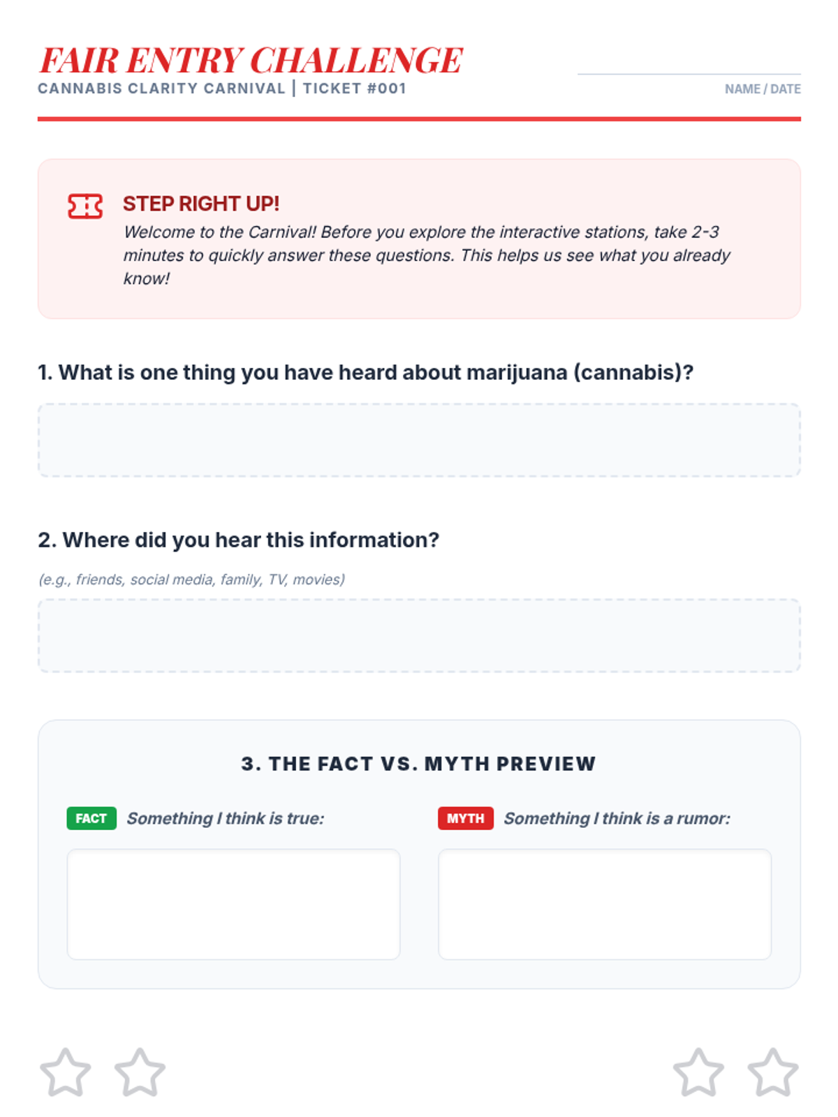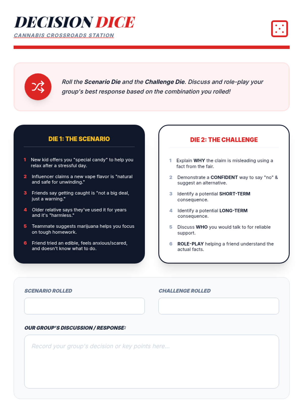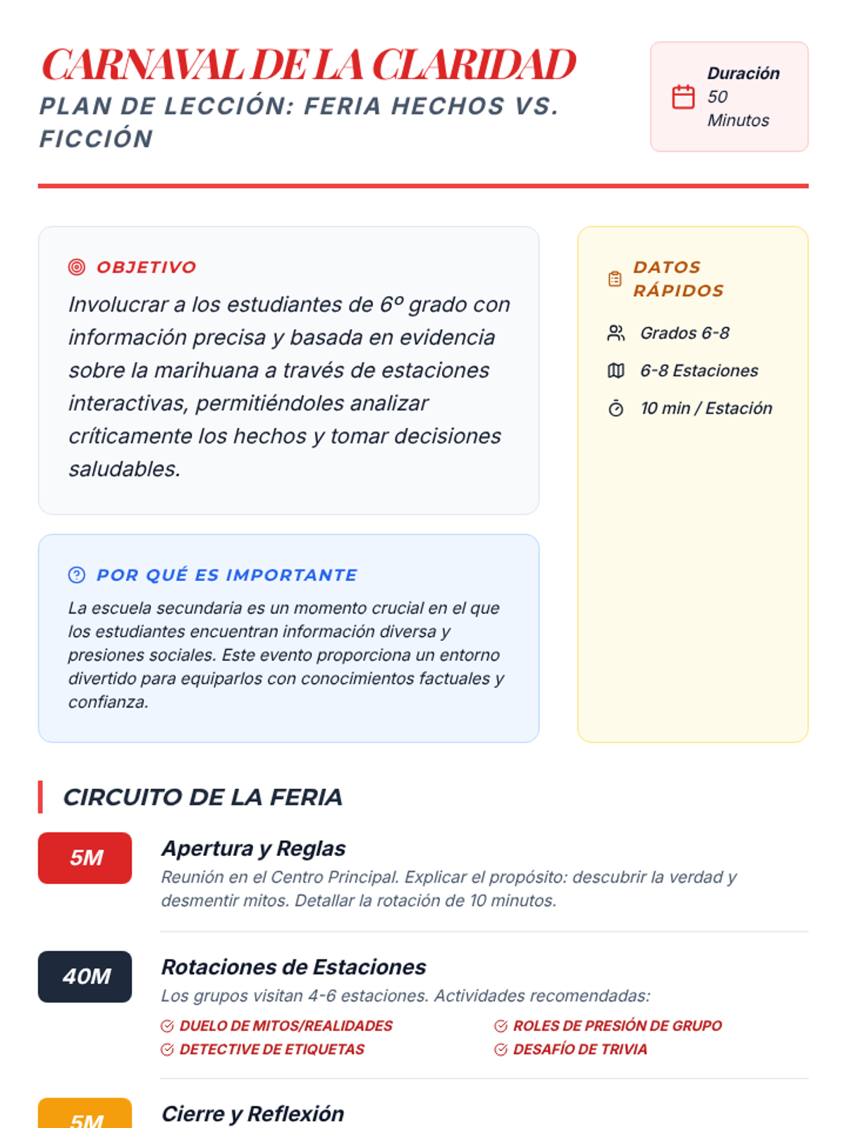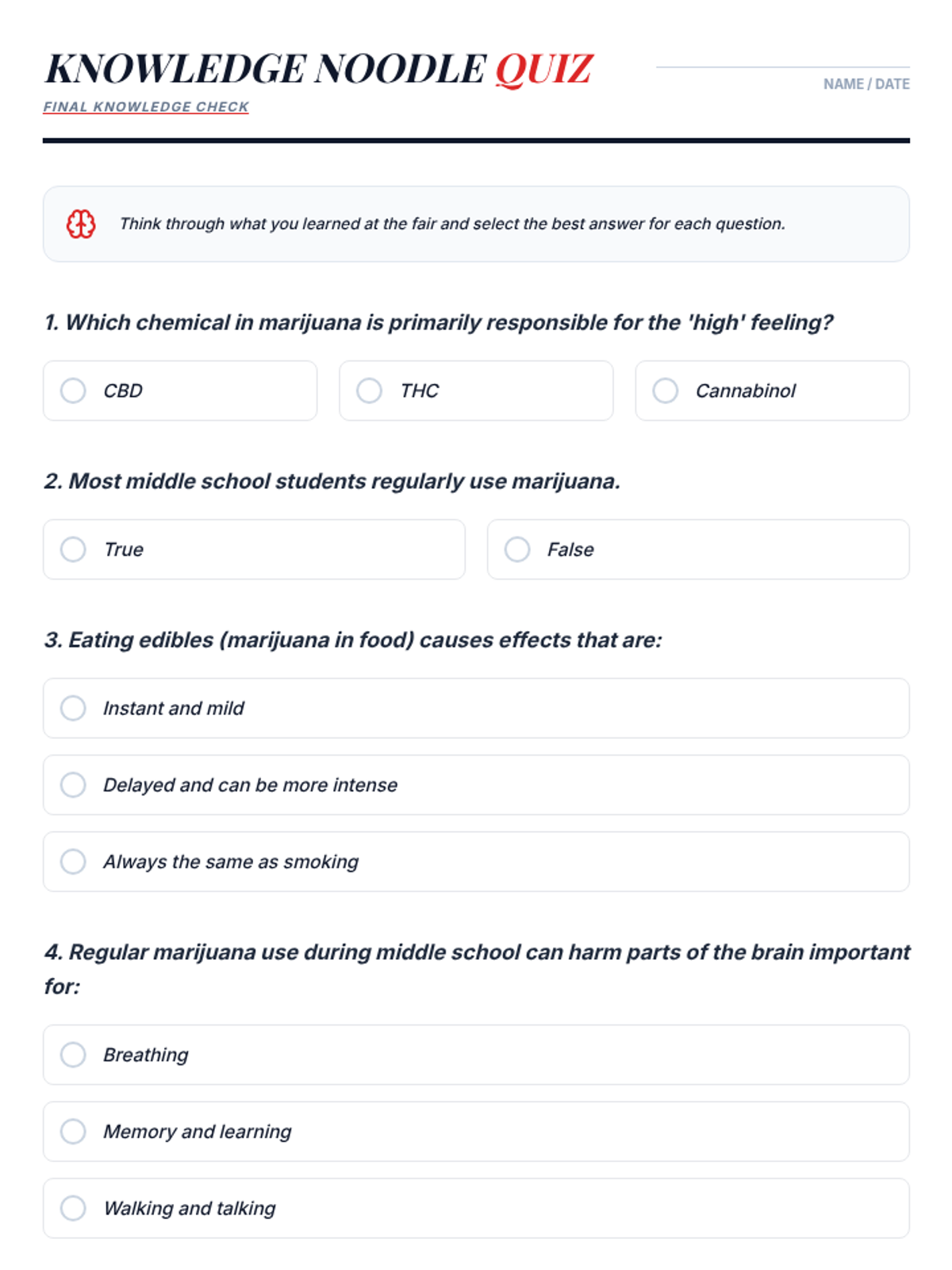 An interactive 50-minute fair where students rotate through various stations to learn the truth about marijuana. This lesson uses games, role-plays, and discussions to build critical thinking and healthy decision-making skills.