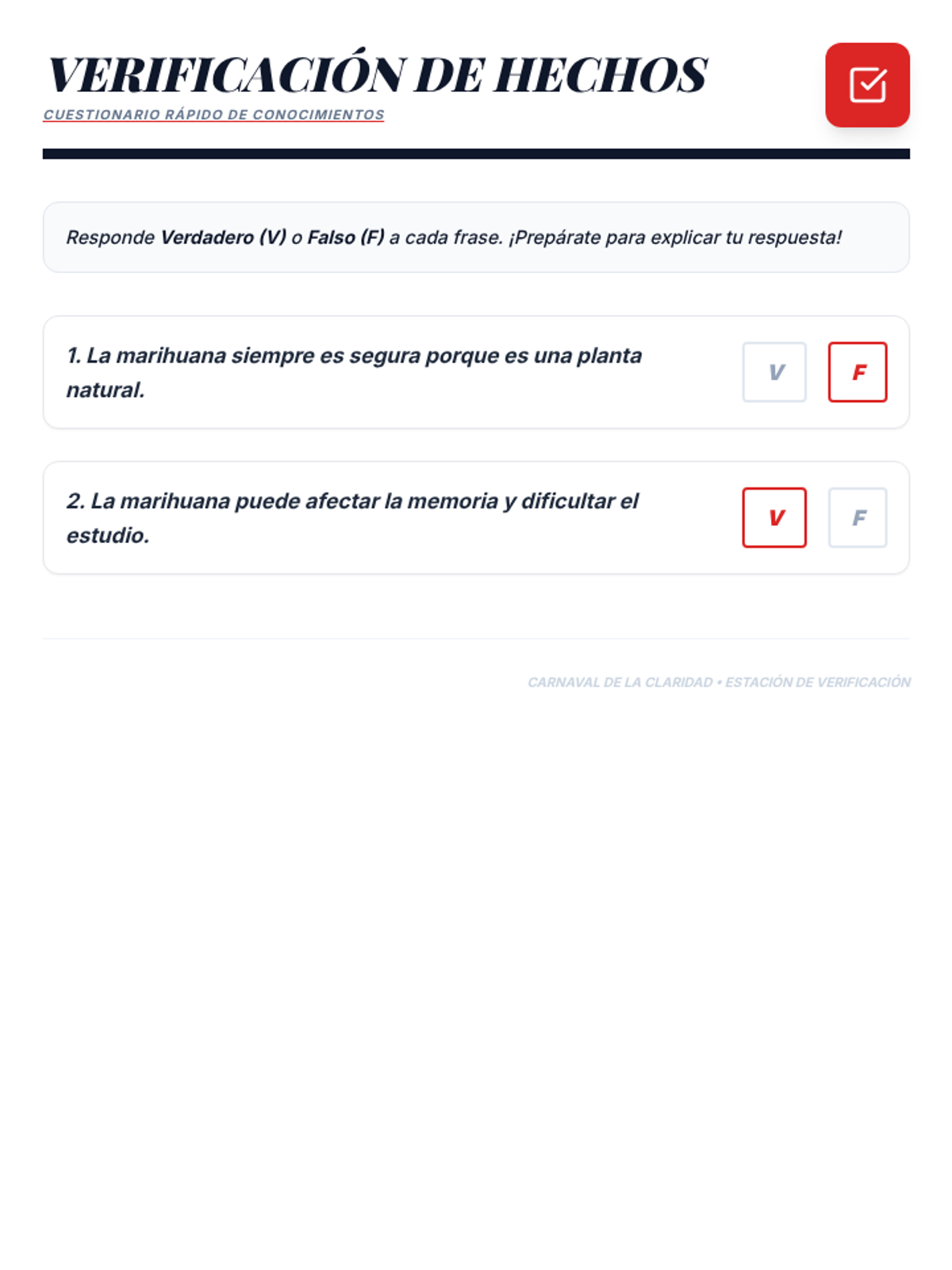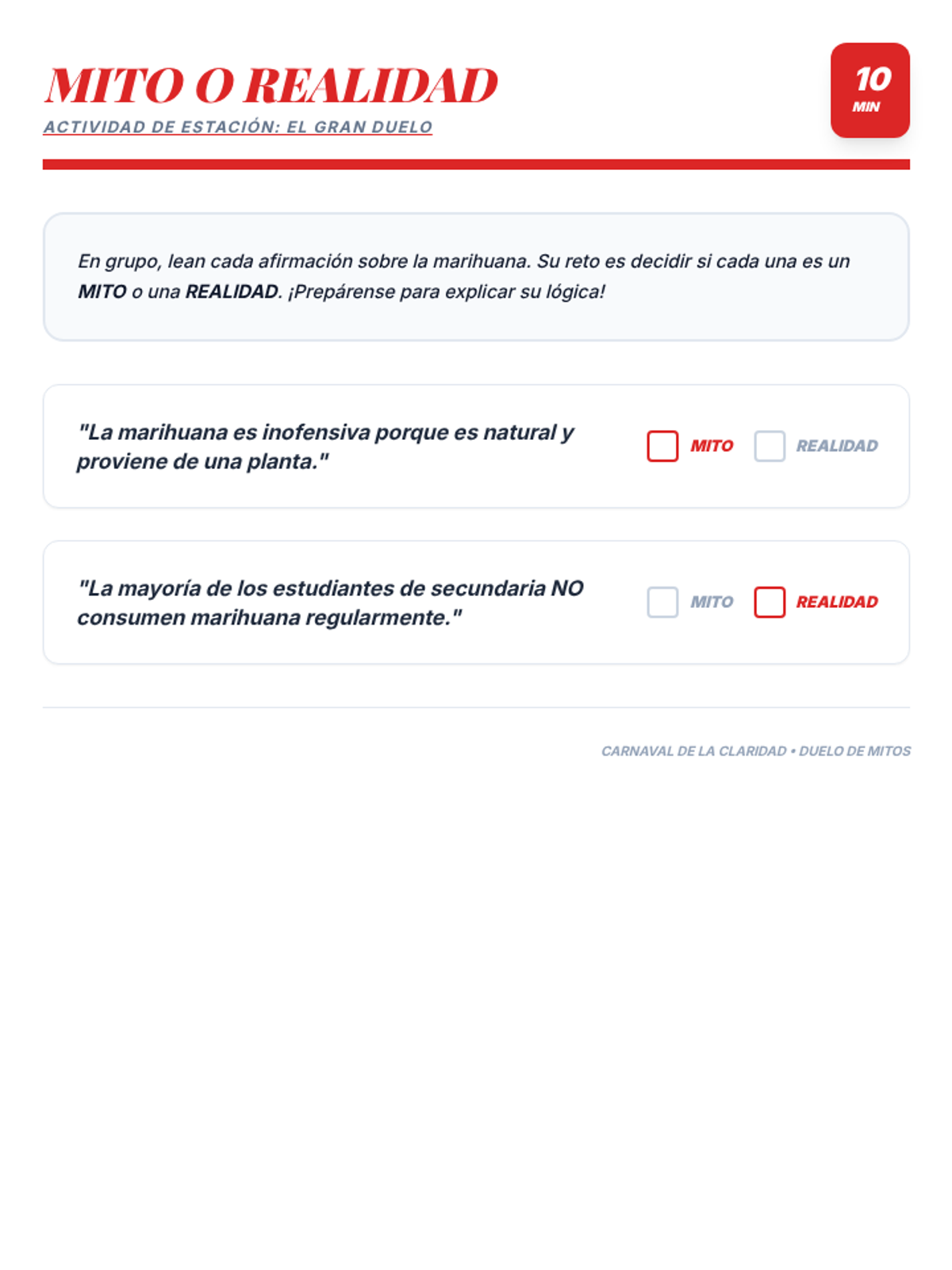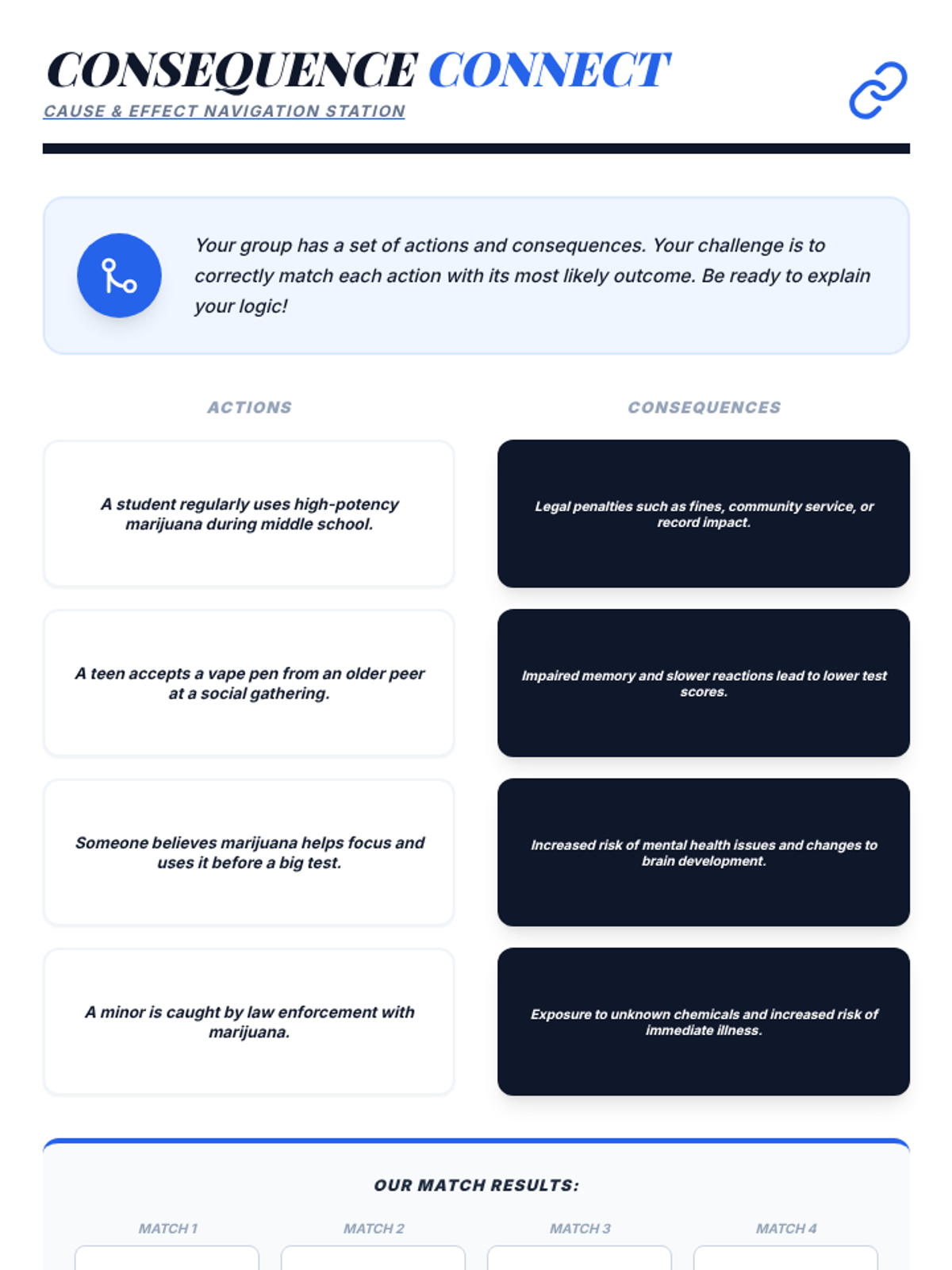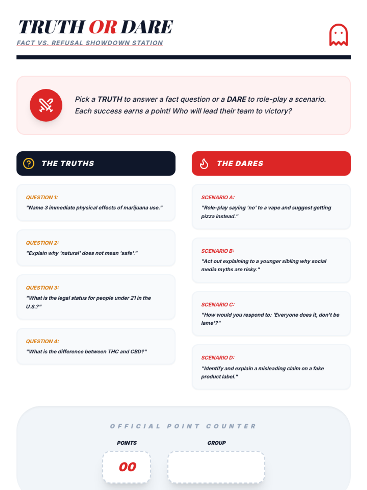 An interactive 50-minute fair where students rotate through various stations to learn the truth about marijuana. This lesson uses games, role-plays, and discussions to build critical thinking and healthy decision-making skills.