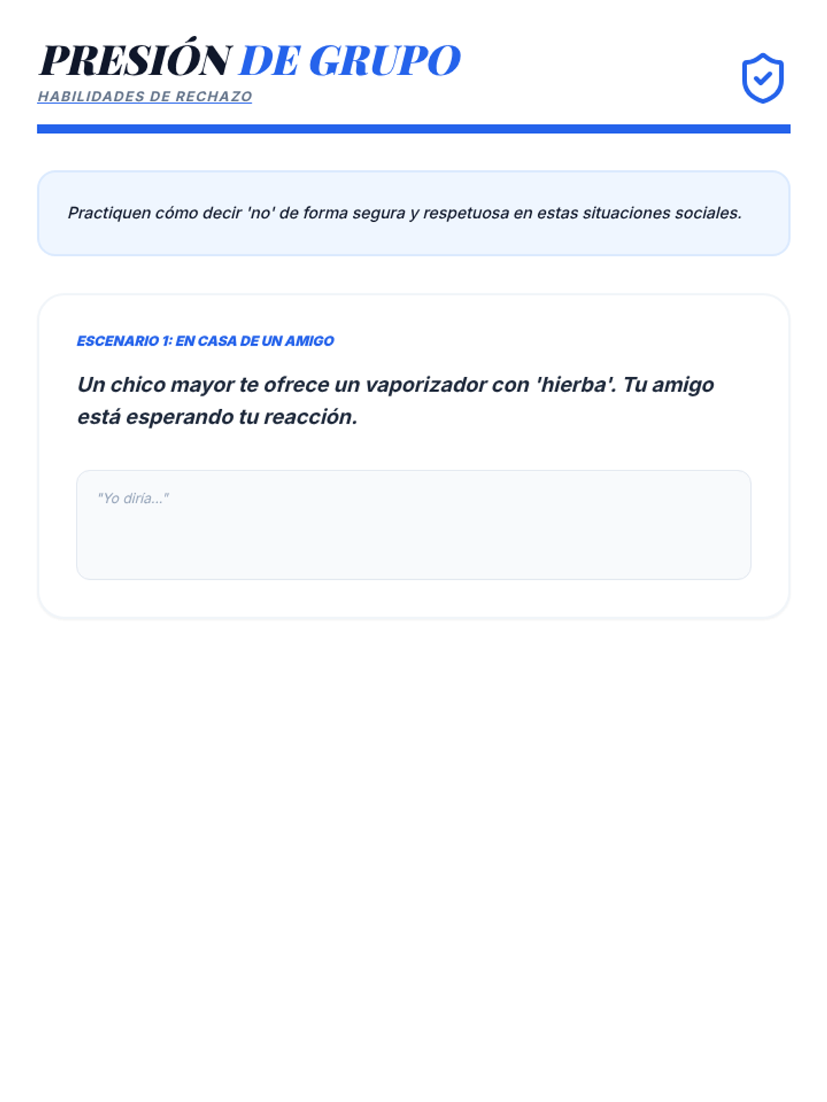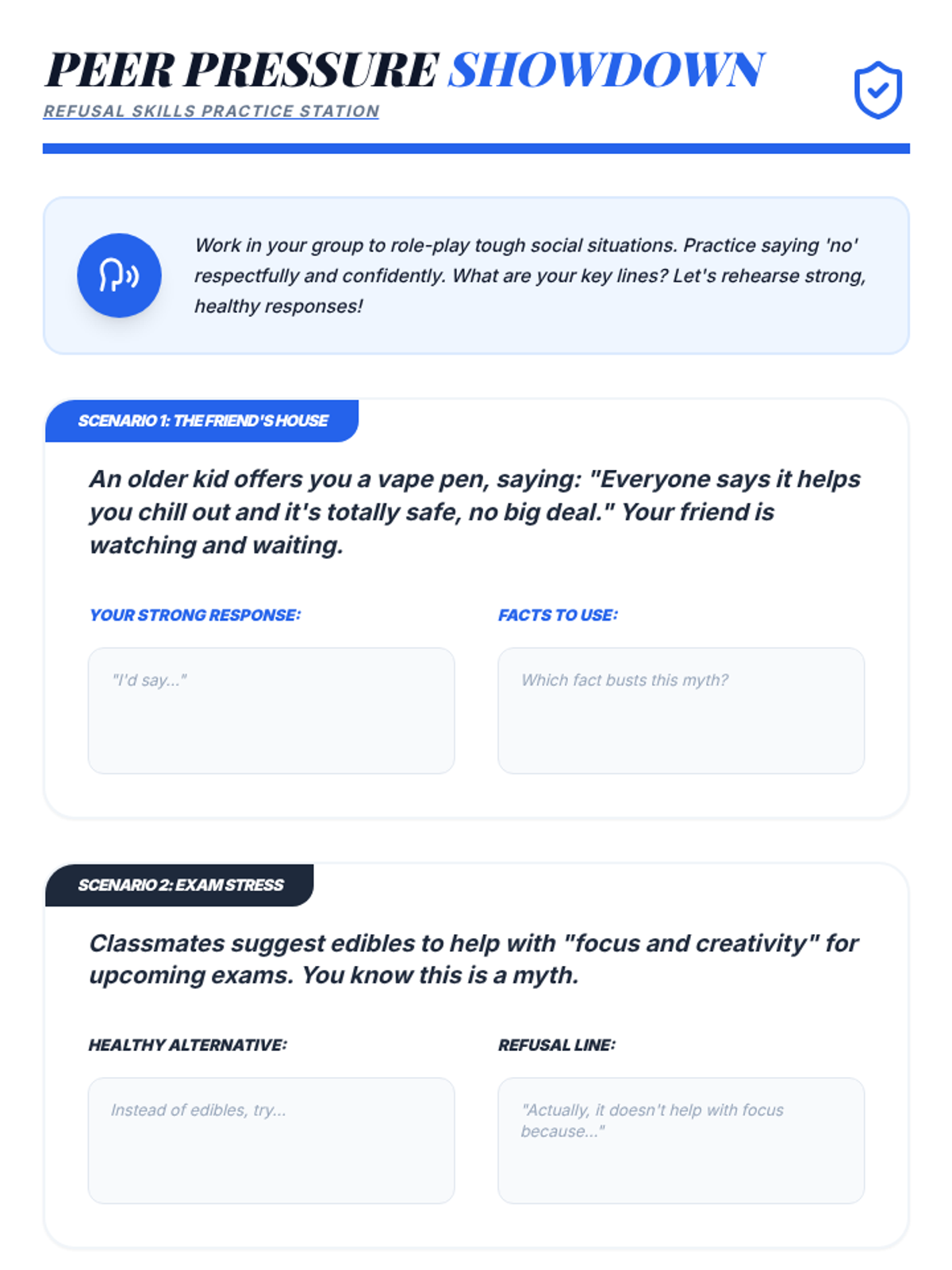 This lesson focuses on building practical refusal skills and strengthening the 'Shield Squad' (support systems). Students learn specific strategies to navigate high-pressure social contexts while acknowledging their inner feelings.