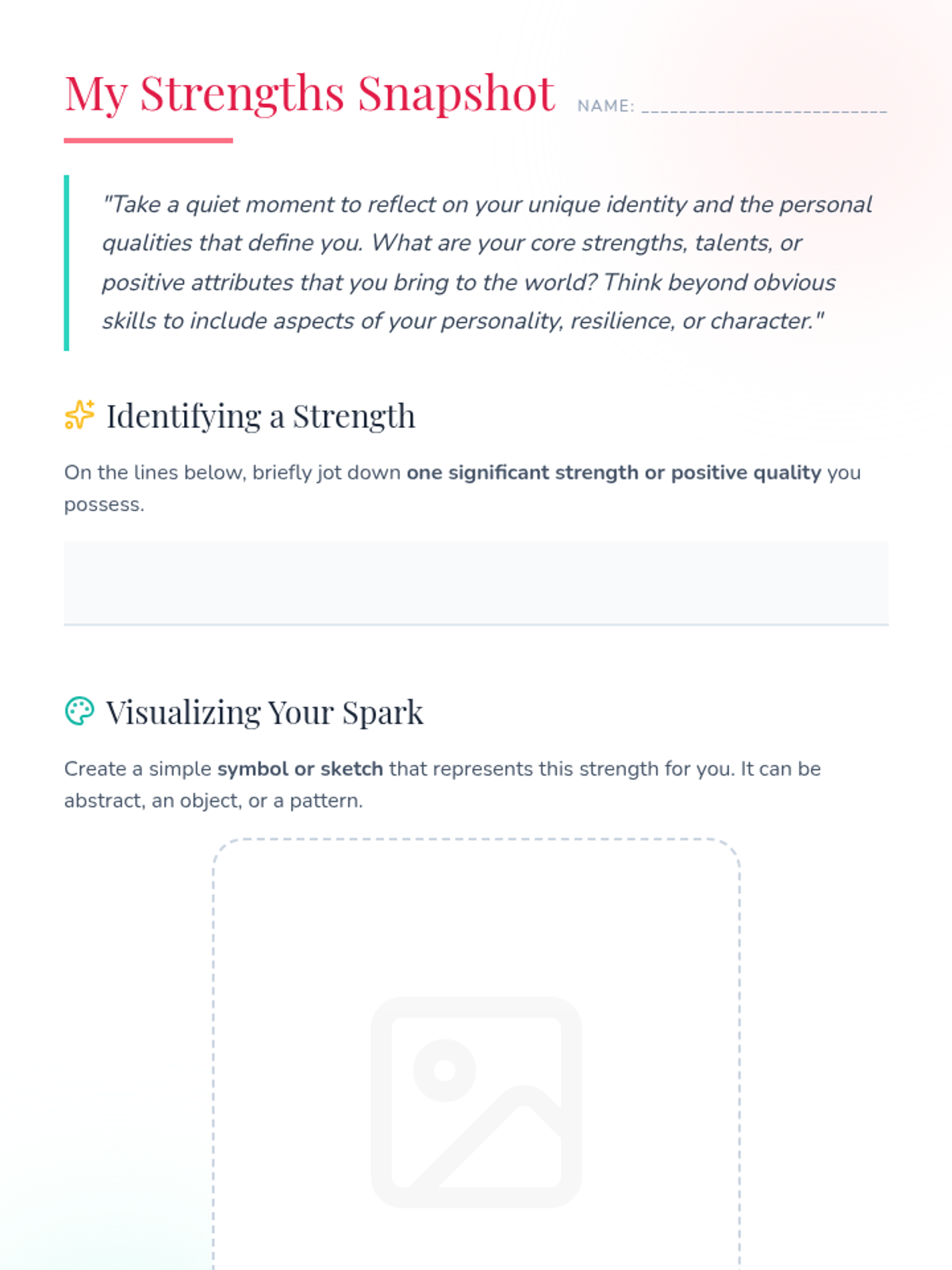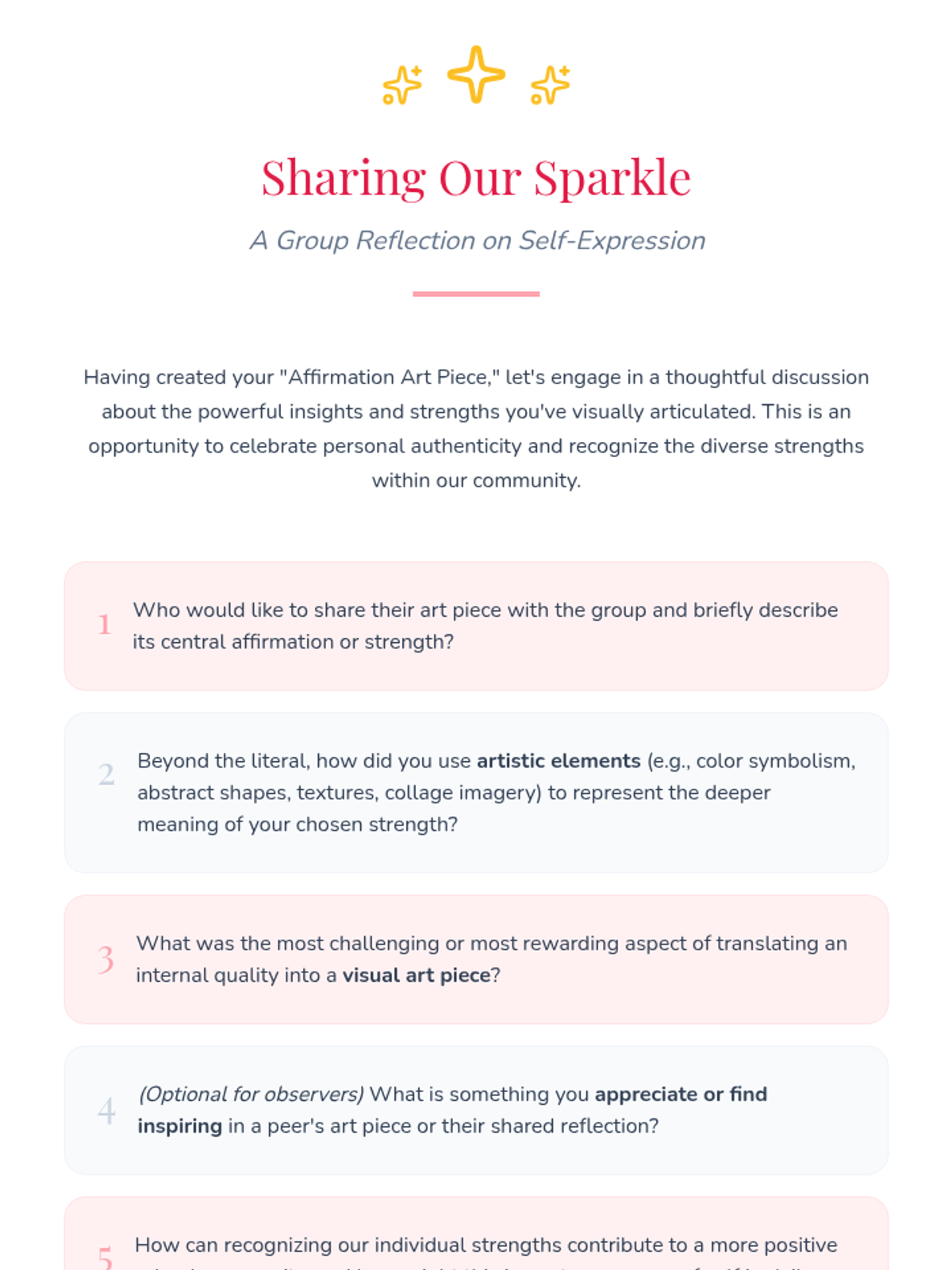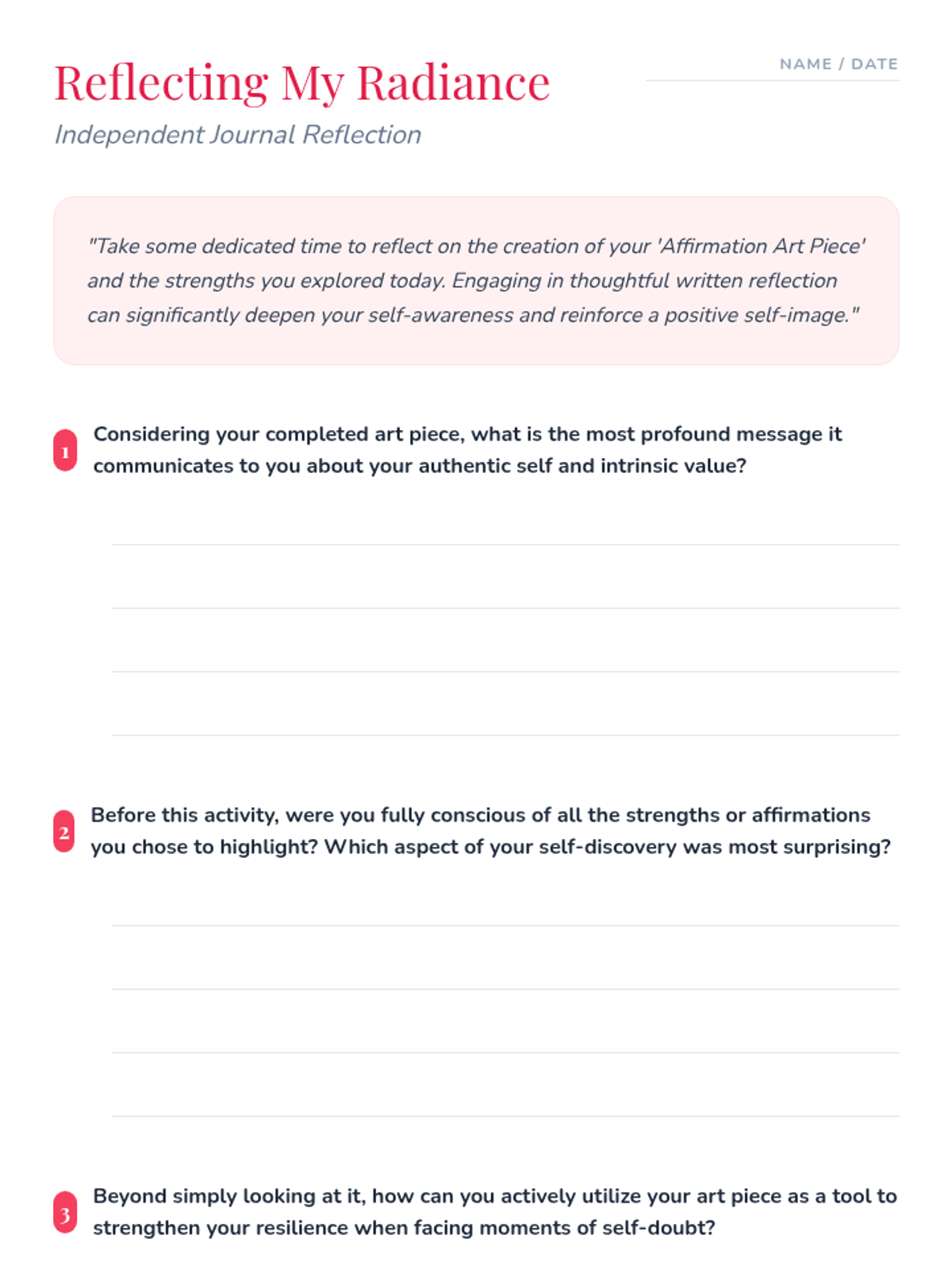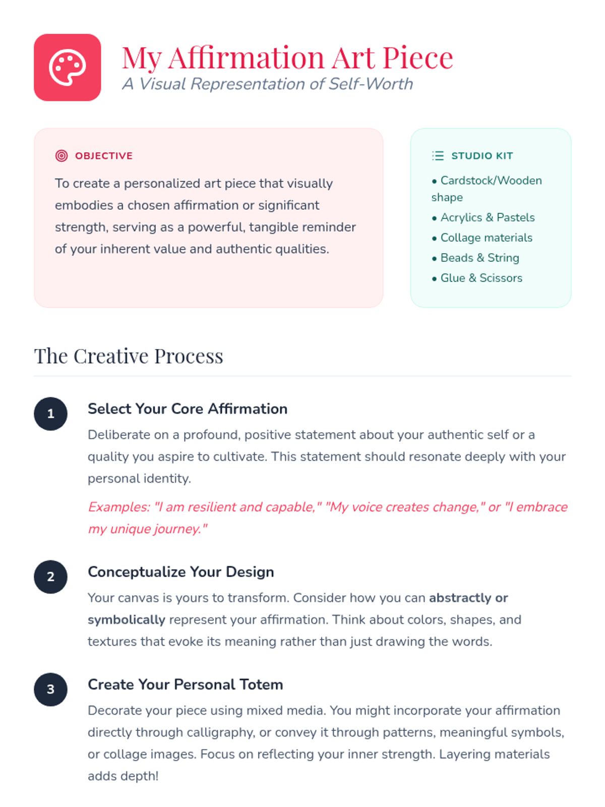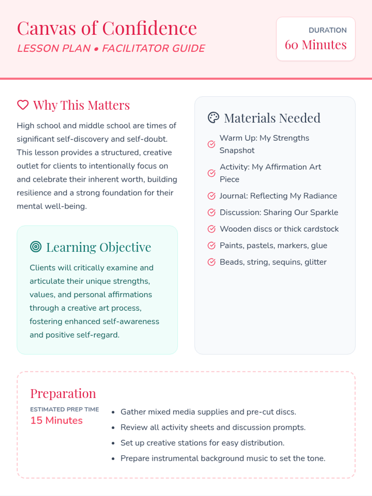 A creative art therapy session for 7th-grade girls (and high school students) to explore self-esteem through artistic expression, identifying core strengths and creating tangible affirmation art.