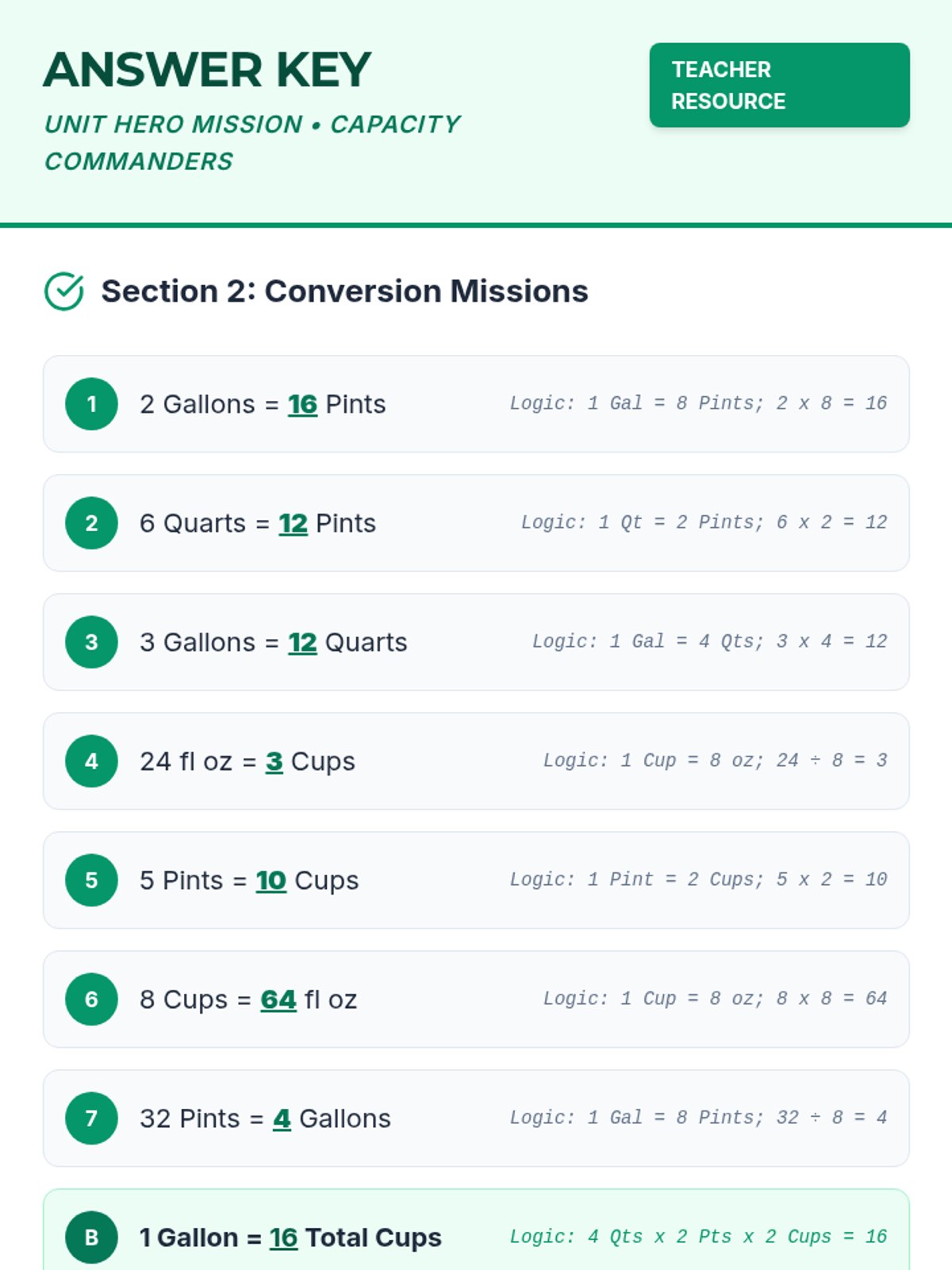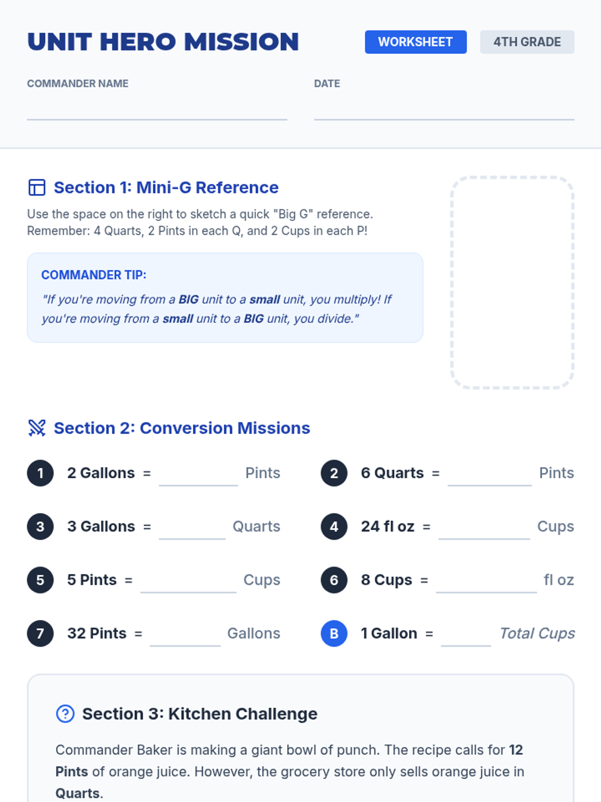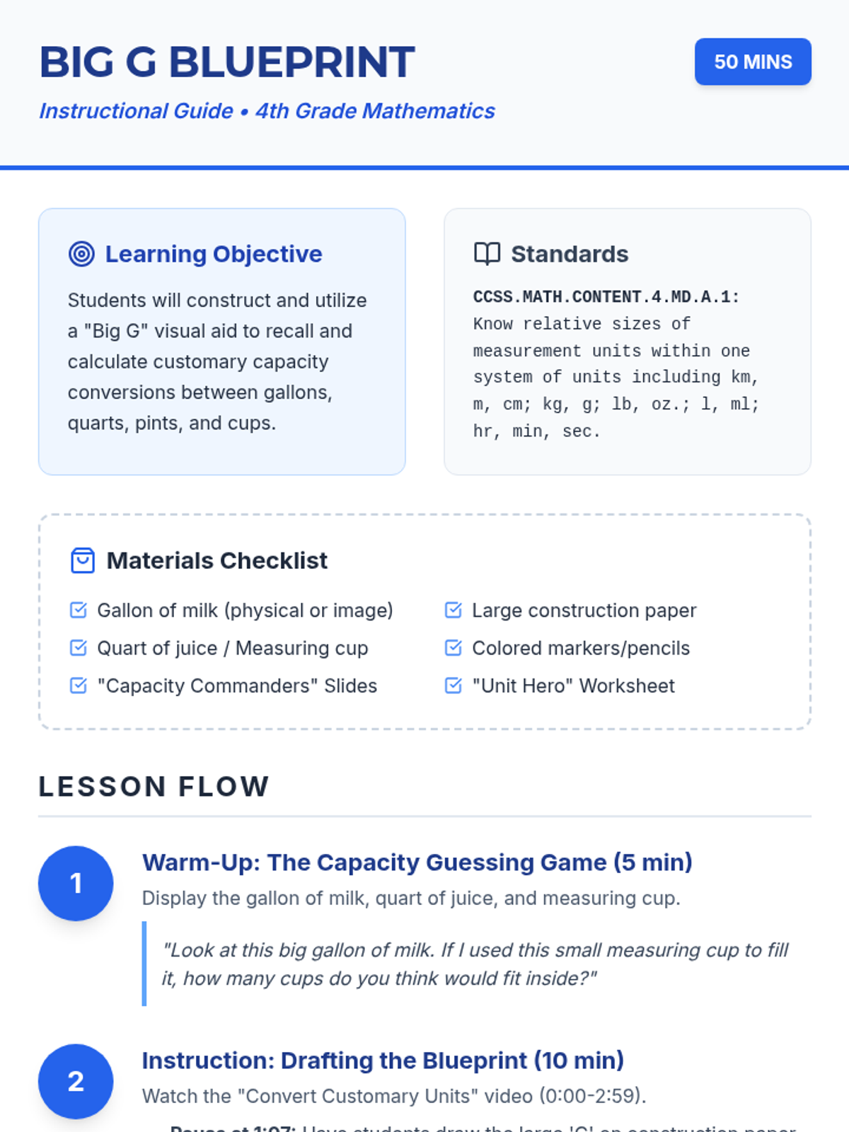 A hands-on lesson where 4th-grade students build and use the 'Big G' visual mnemonic to master customary capacity conversions (gallons, quarts, pints, and cups).