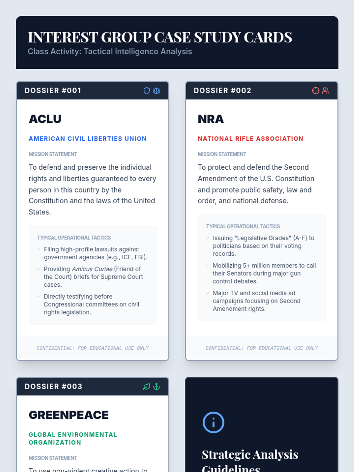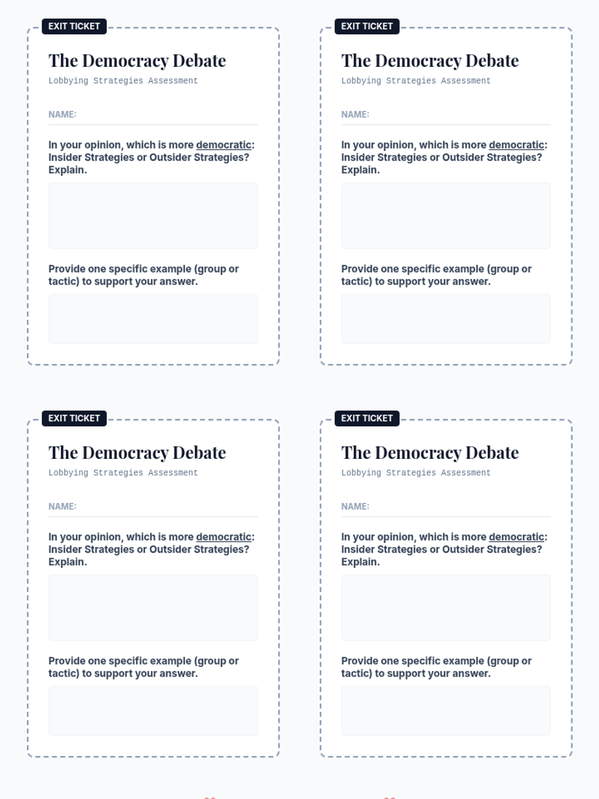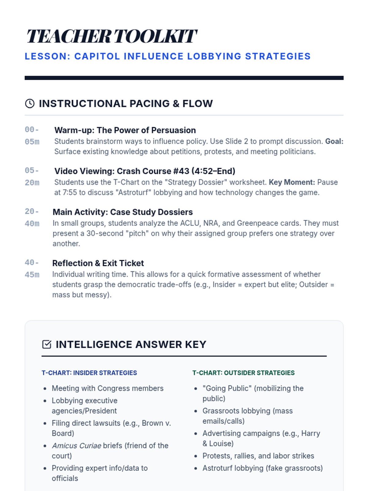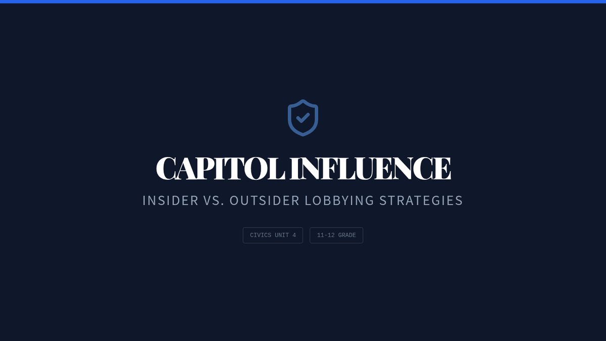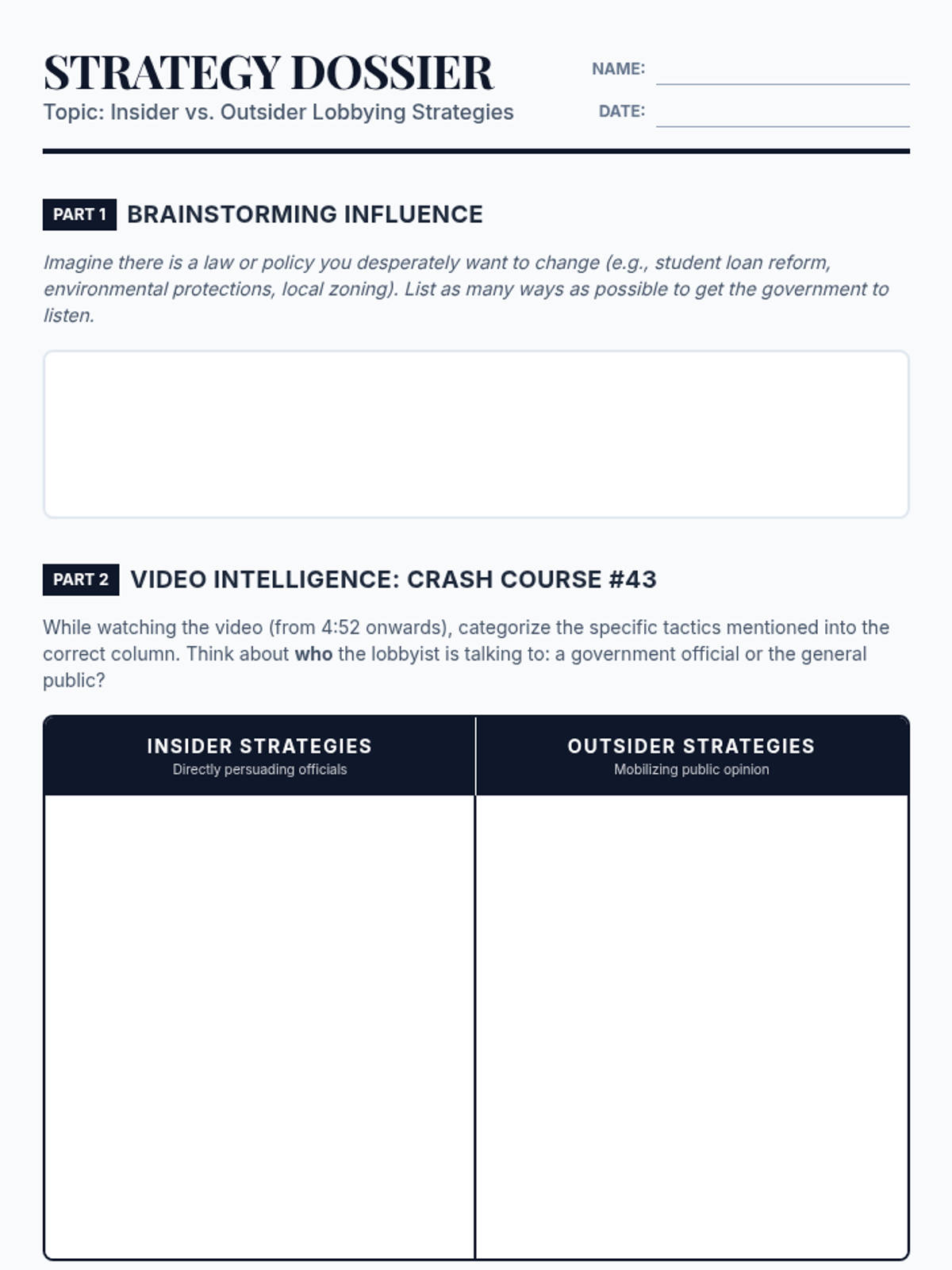 An 11th-12th grade Civics lesson exploring the distinction between insider and outsider lobbying strategies through video analysis and interest group case studies.