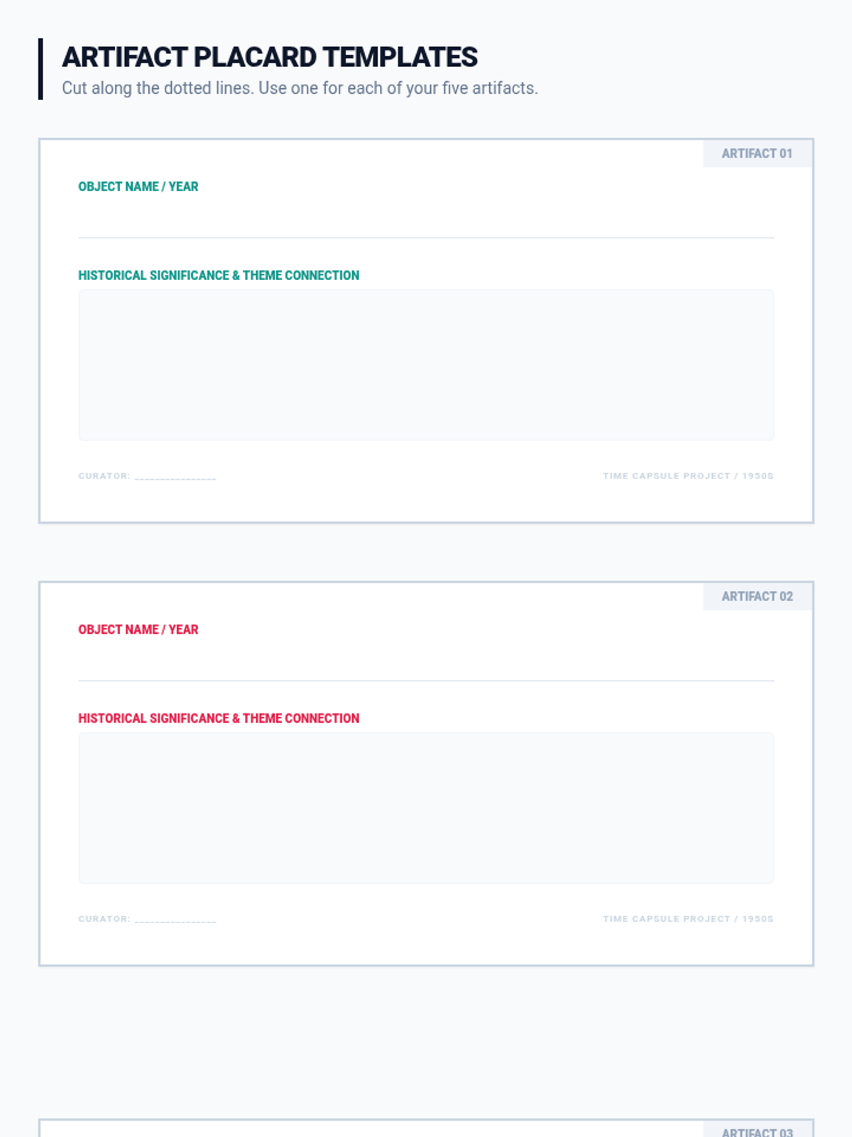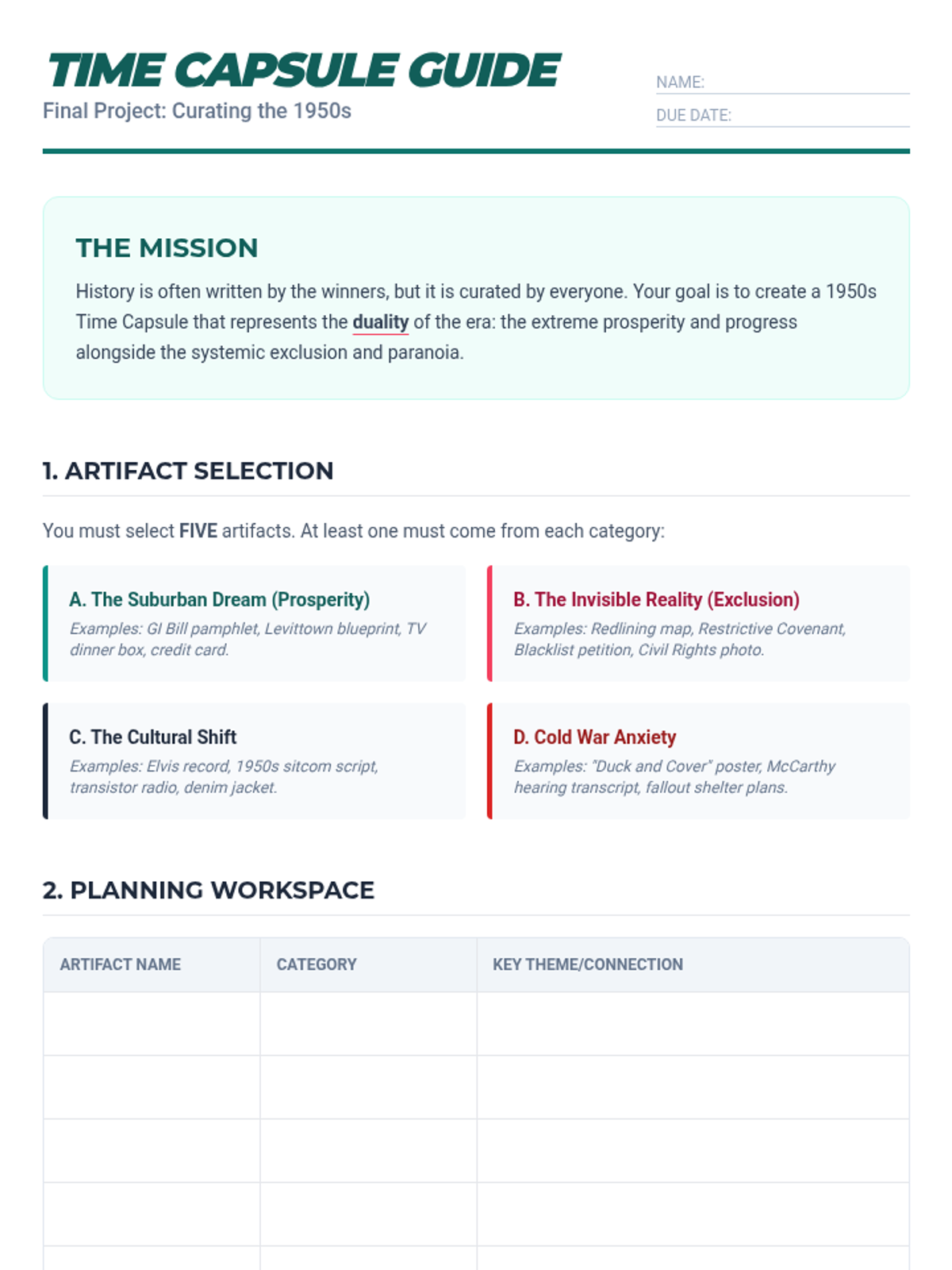 In this culminating workshop, students select artifacts representing the 1950s' duality and write explanations of their historical significance for a 'Time Capsule.'