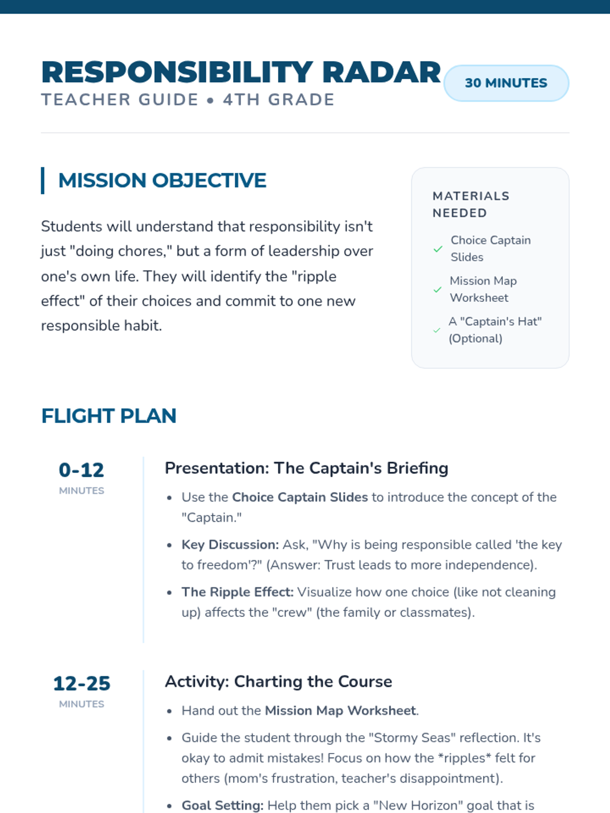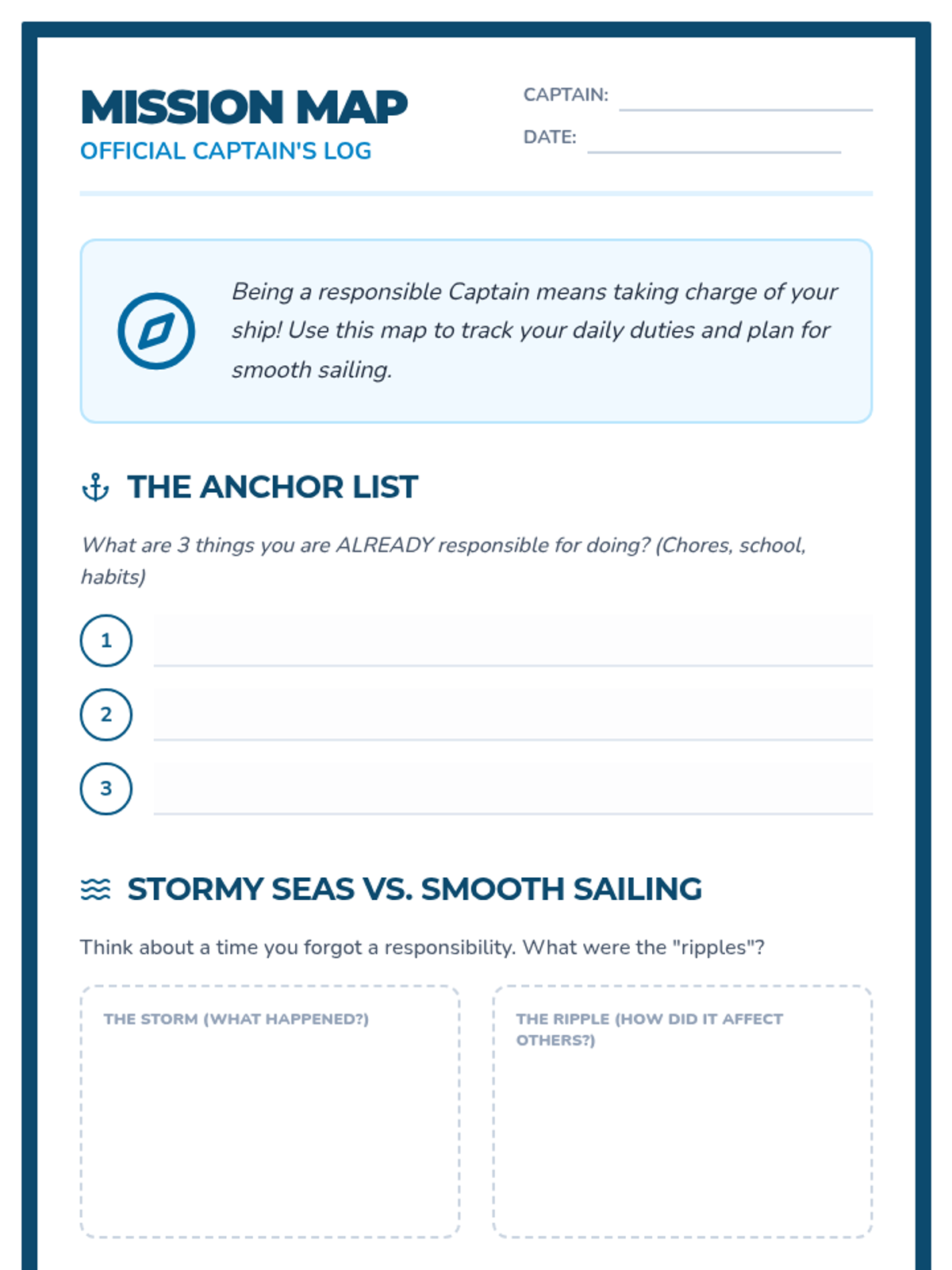 A 30-minute interactive lesson for a 4th grade student focused on personal responsibility, decision-making, and the 'ripple effect' of their actions using a nautical 'Captain of My Choice' theme.
