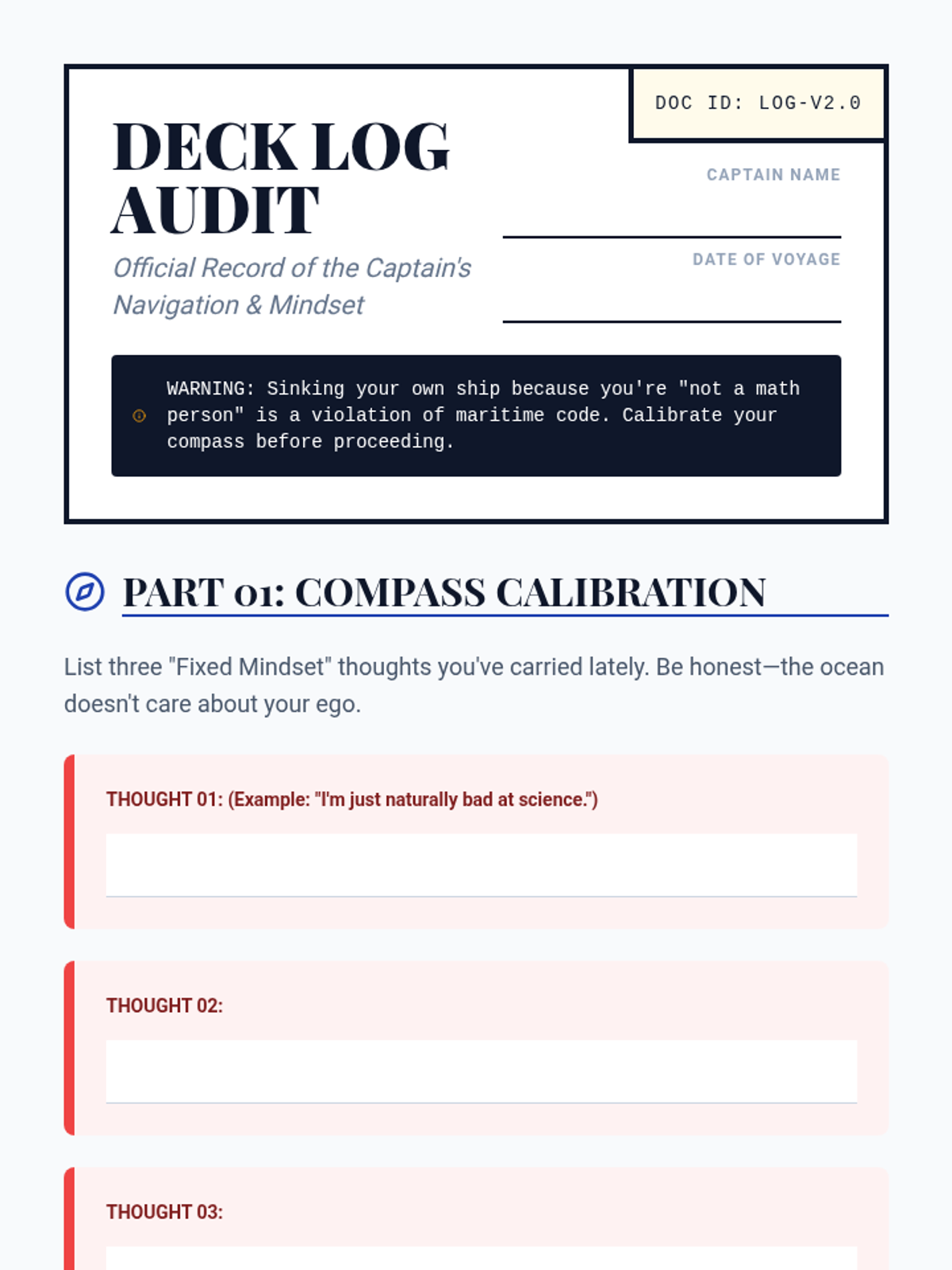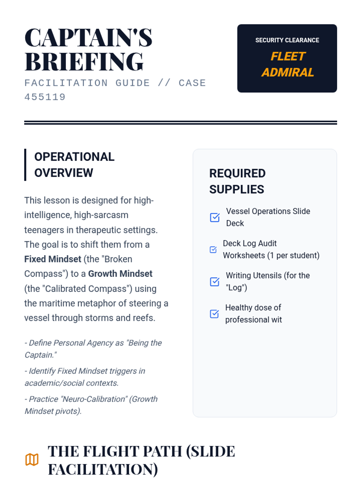 A nautical-themed, witty exploration of growth mindset for high schoolers in therapeutic settings. This lesson uses the metaphor of a ship's manual to teach personal agency as the Captain and mindset as the Compass.