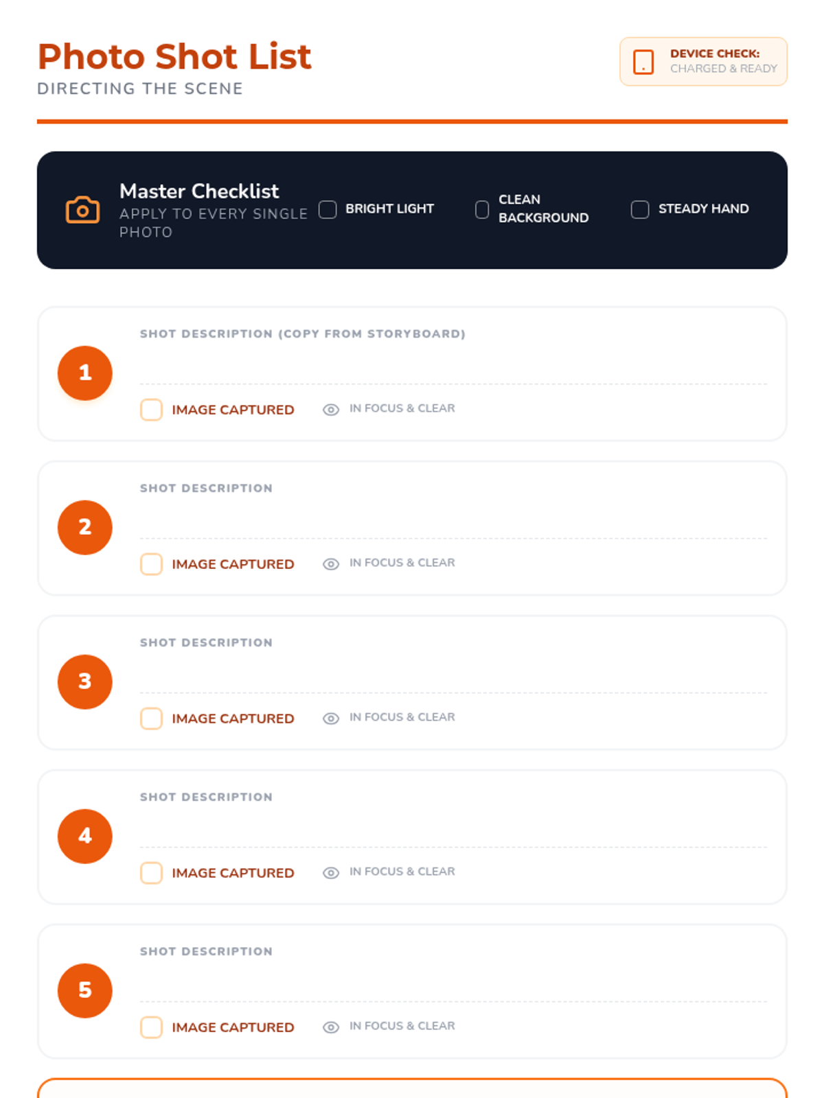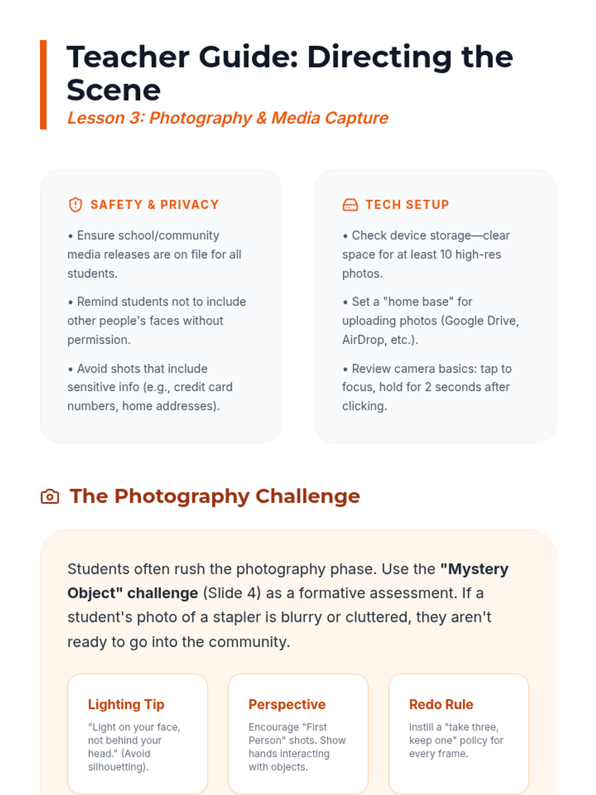 Students use digital tools to capture clear, purposeful images or video clips that illustrate each step of their social script.