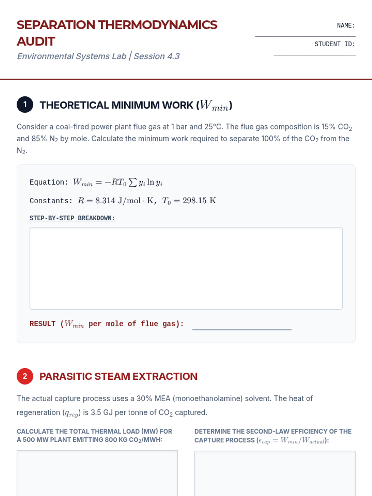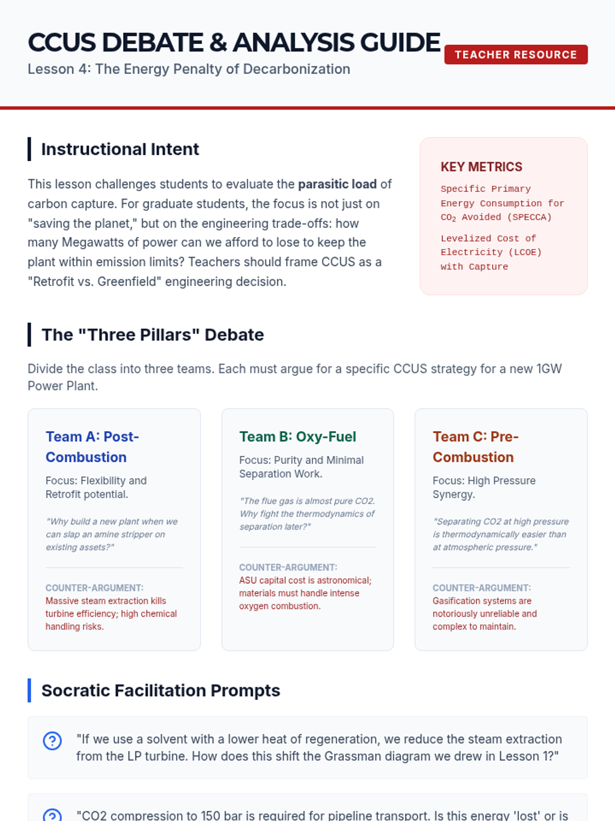 This lesson analyzes the energy penalty associated with post-combustion capture and oxy-fuel combustion. Students calculate the thermodynamic costs of separating CO2 and compressing it for sequestration.