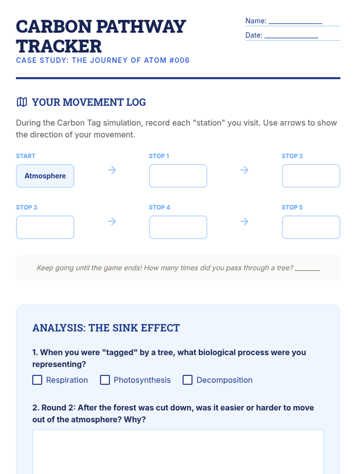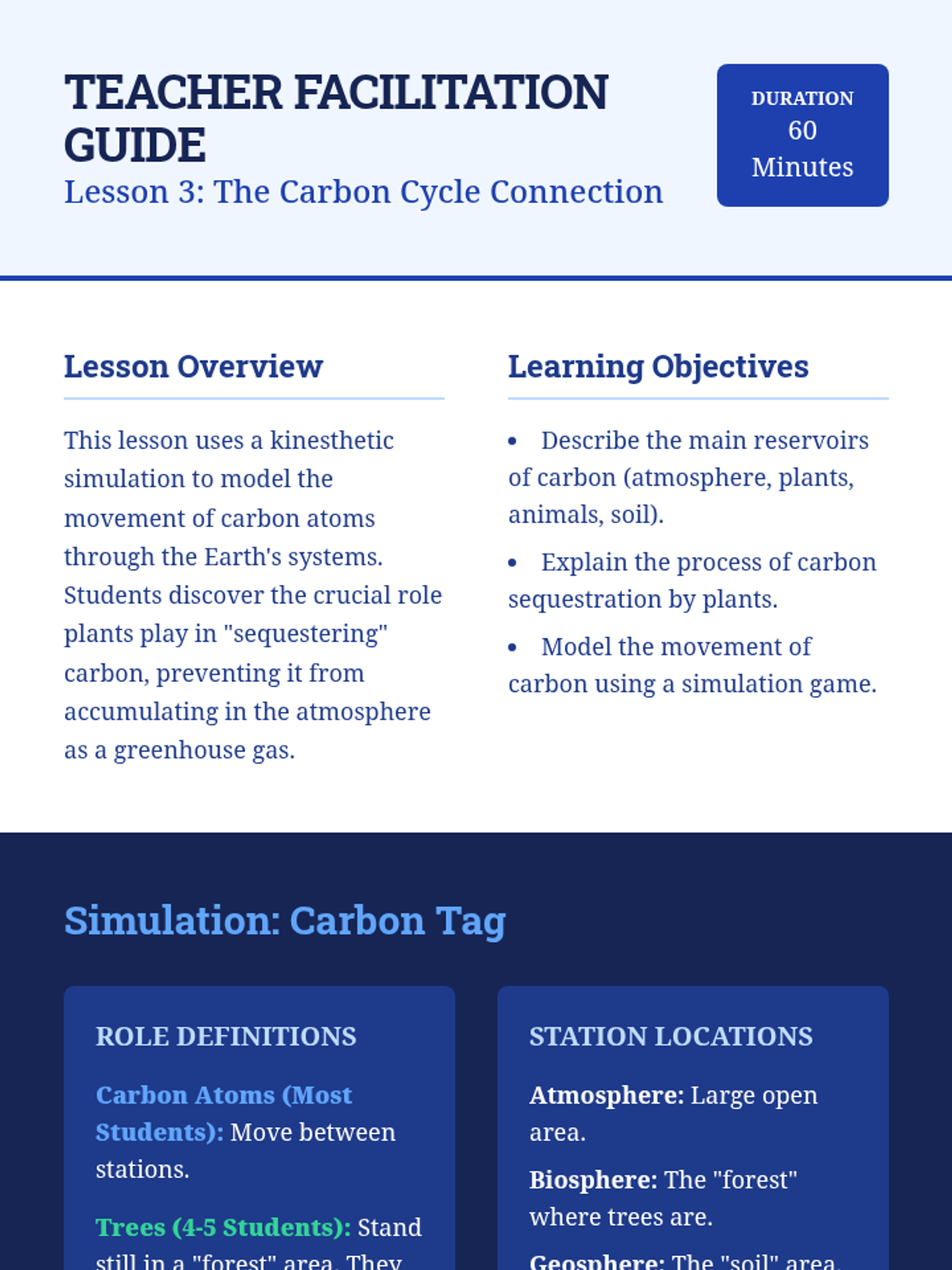 A simulation-based lesson where students model the movement of carbon through plants, animals, the atmosphere, and the soil to understand carbon sequestration.
