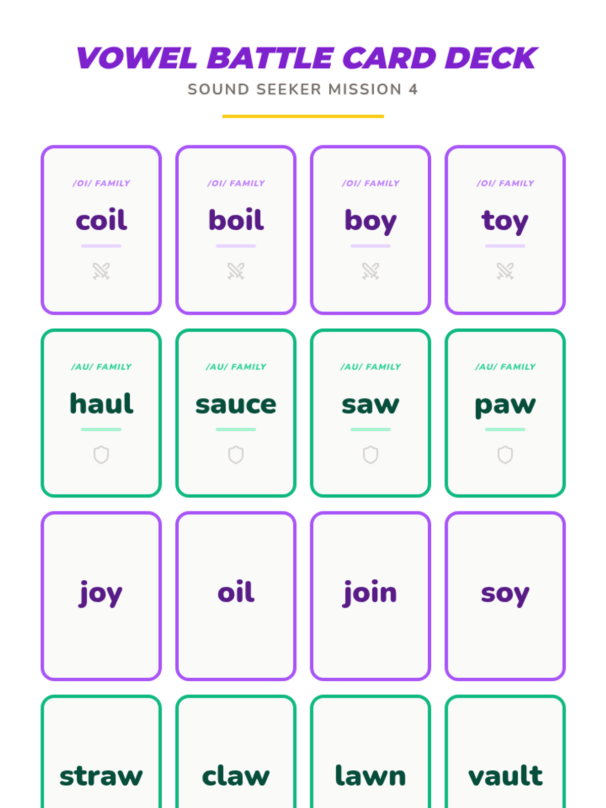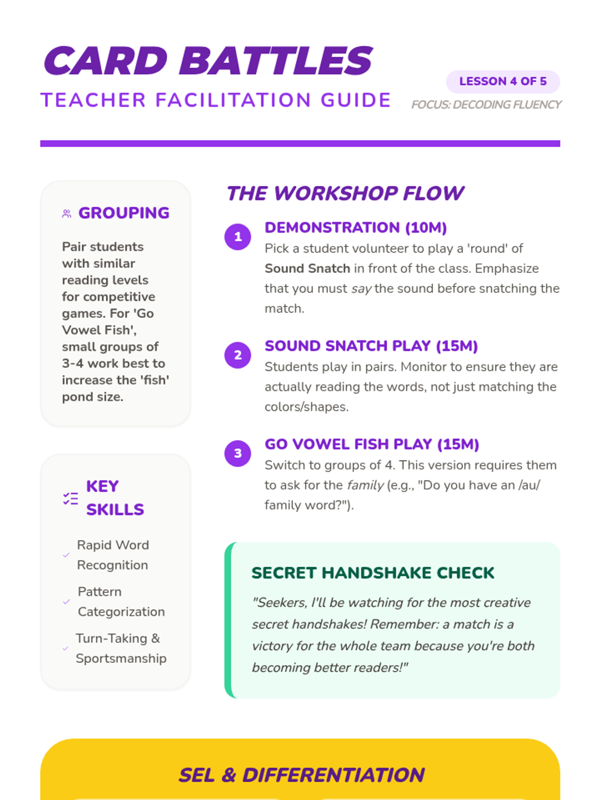 Competitive card games focused on rapid decoding and social-emotional skills using variant vowel word decks.