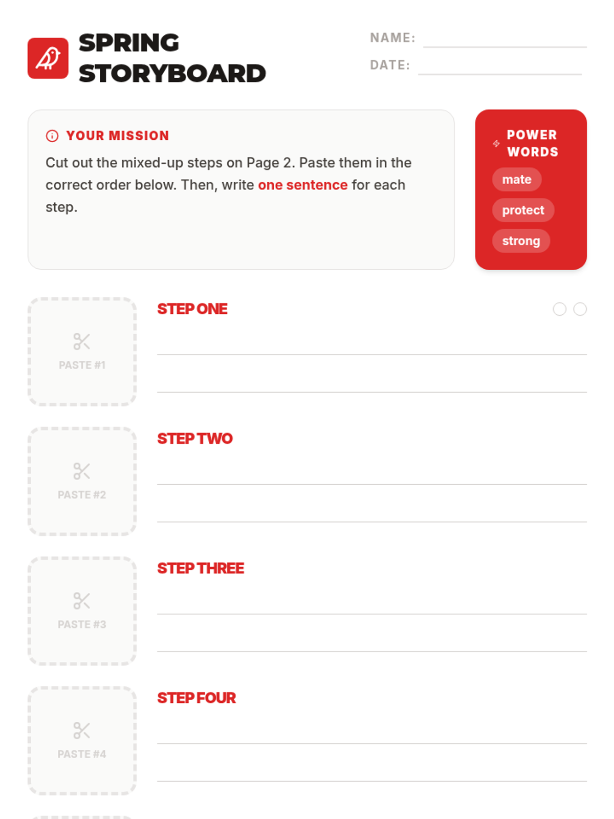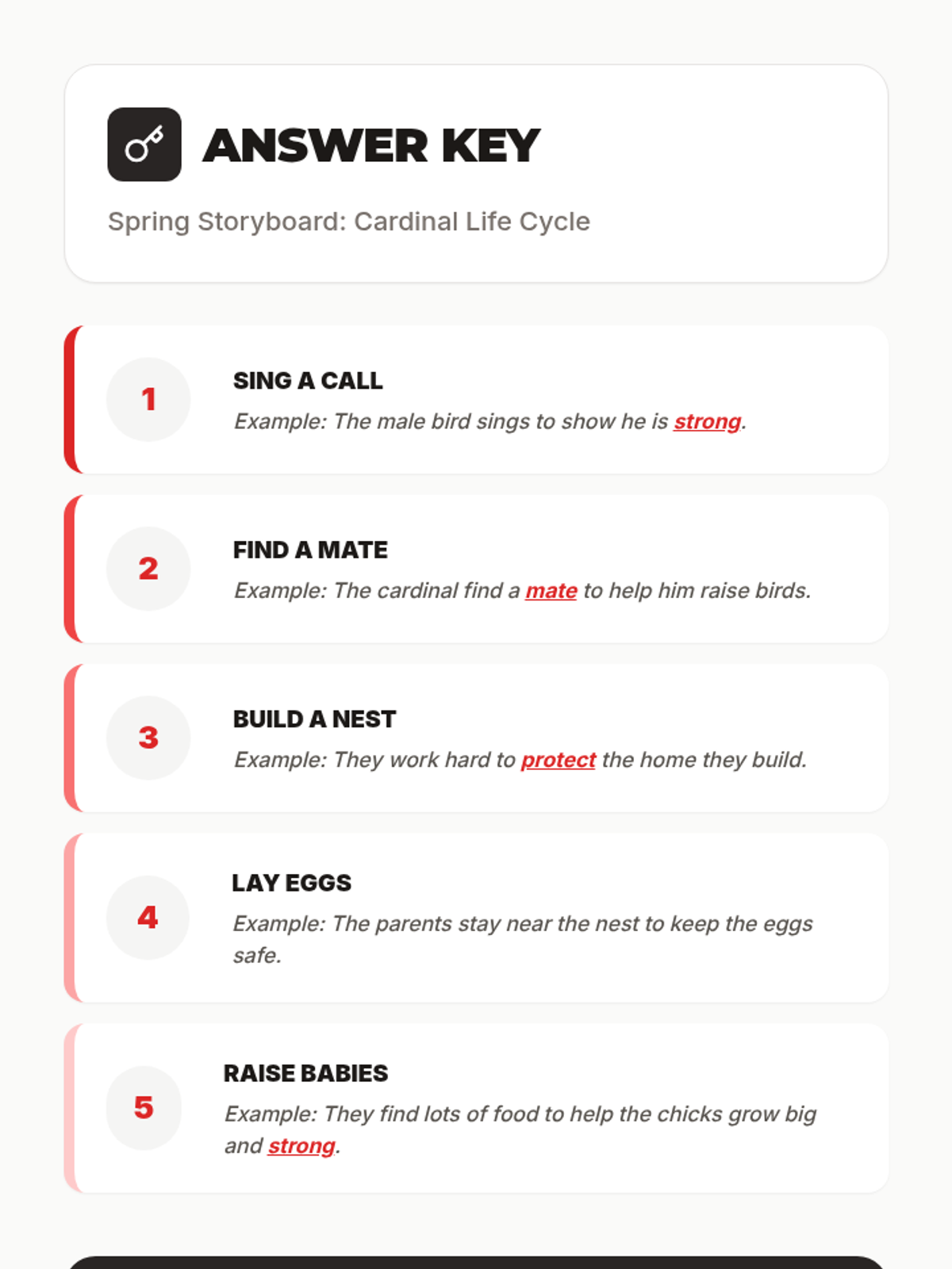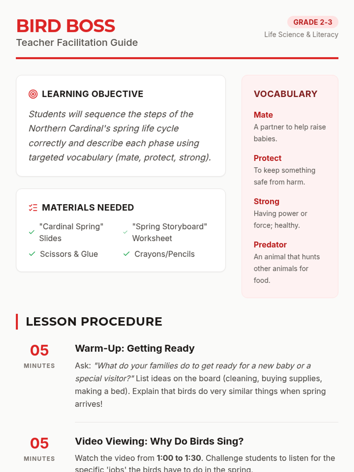 A 1-day lesson for 2nd-3rd grade students on the life cycle of cardinals in spring, focusing on sequencing, storytelling, and vocabulary development through video observation and a cut-and-paste activity.