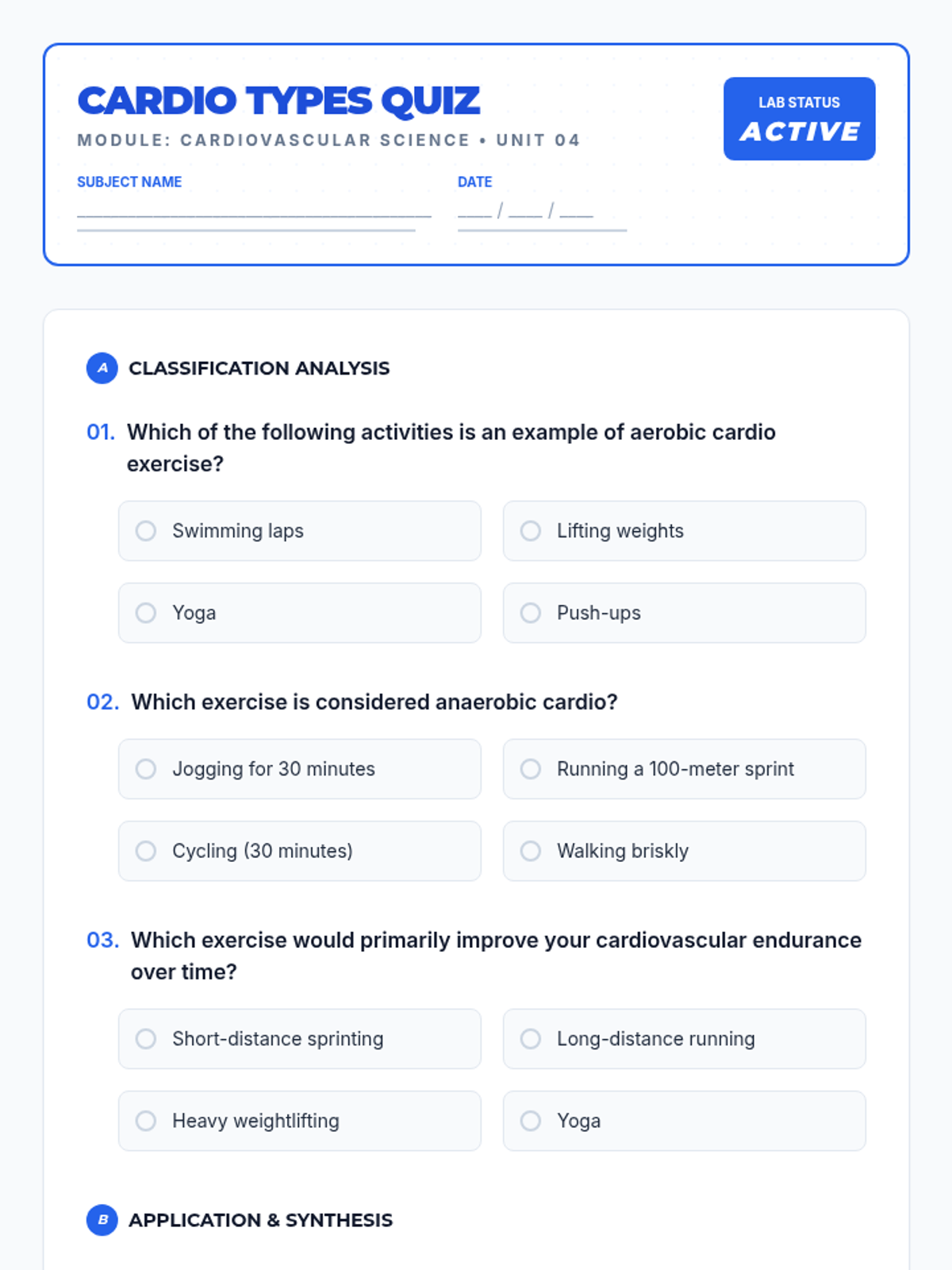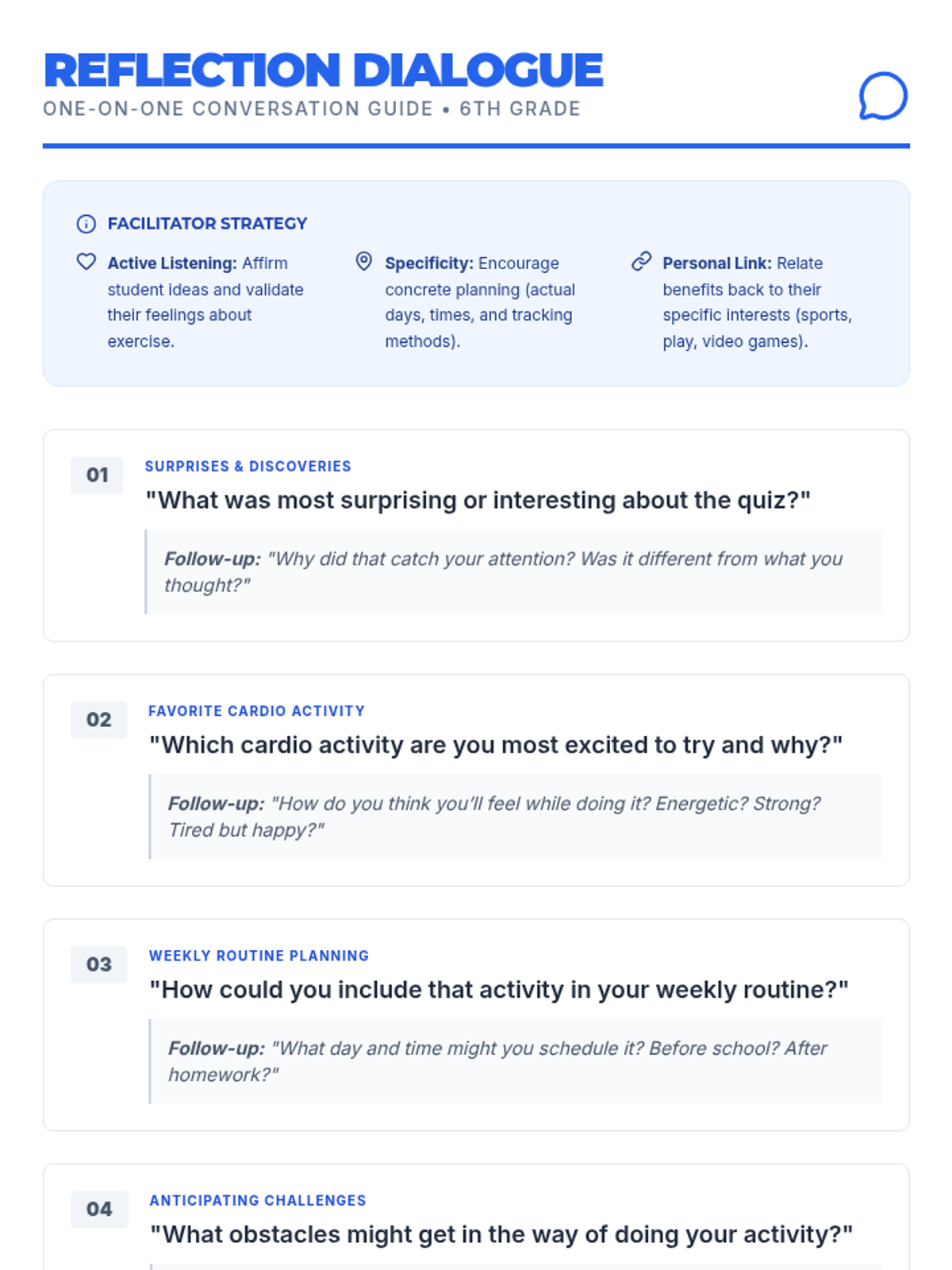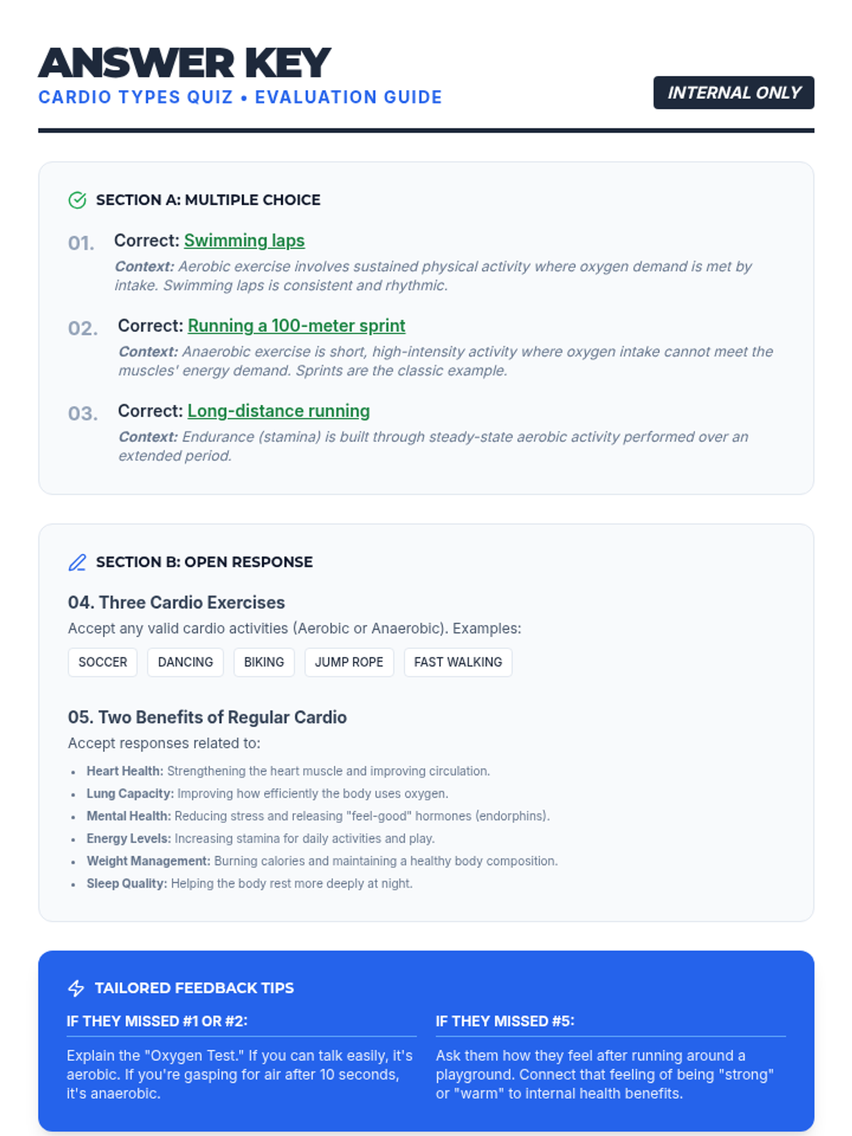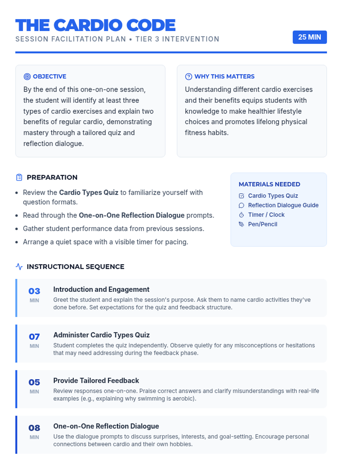 An individualized quiz and reflection session unlocking students’ understanding of cardio exercise types and benefits. Includes tailored feedback for a 6th grader in a 25-minute Tier 3 session.