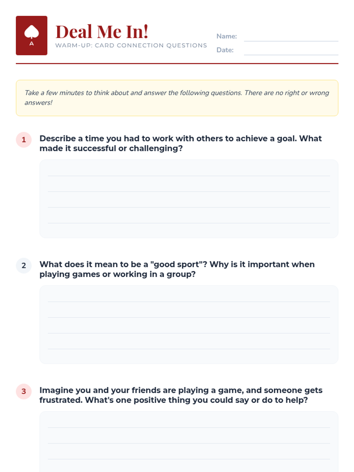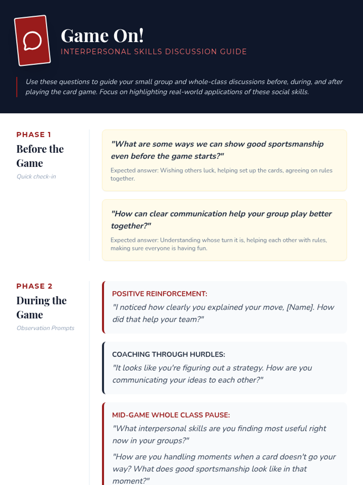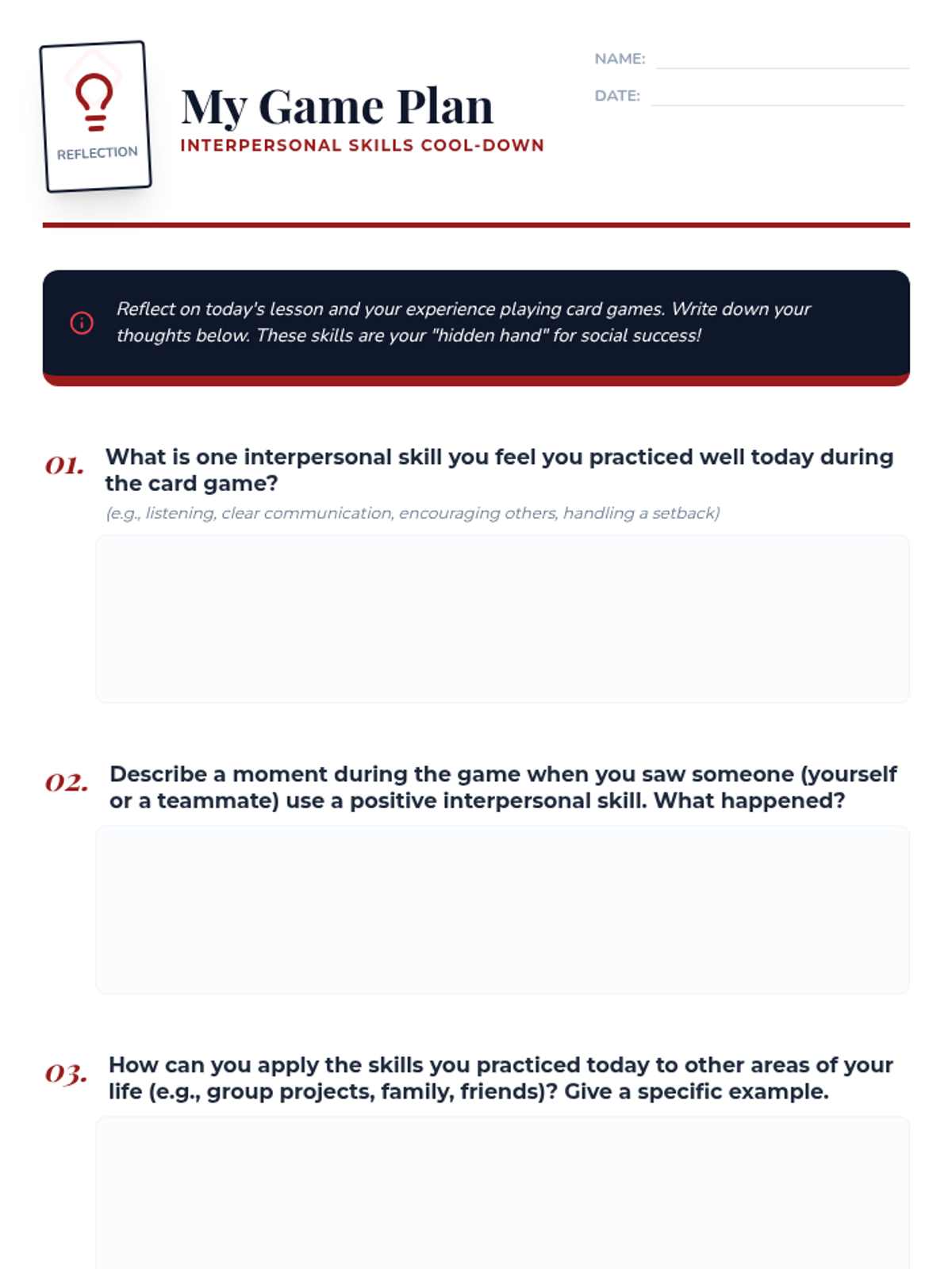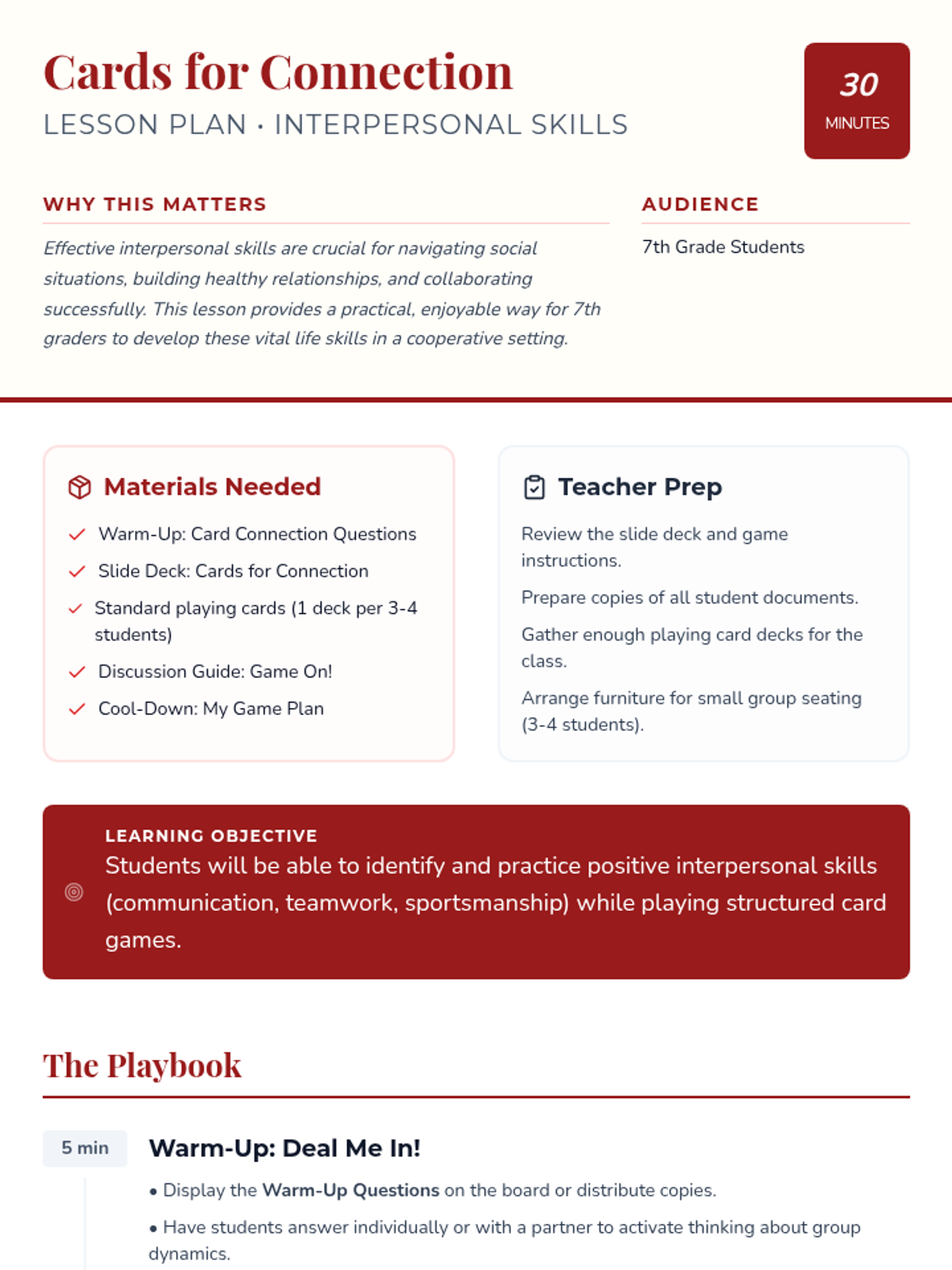 A 30-minute lesson for 7th graders to develop interpersonal skills through cooperative card games, focusing on communication, teamwork, and sportsmanship.