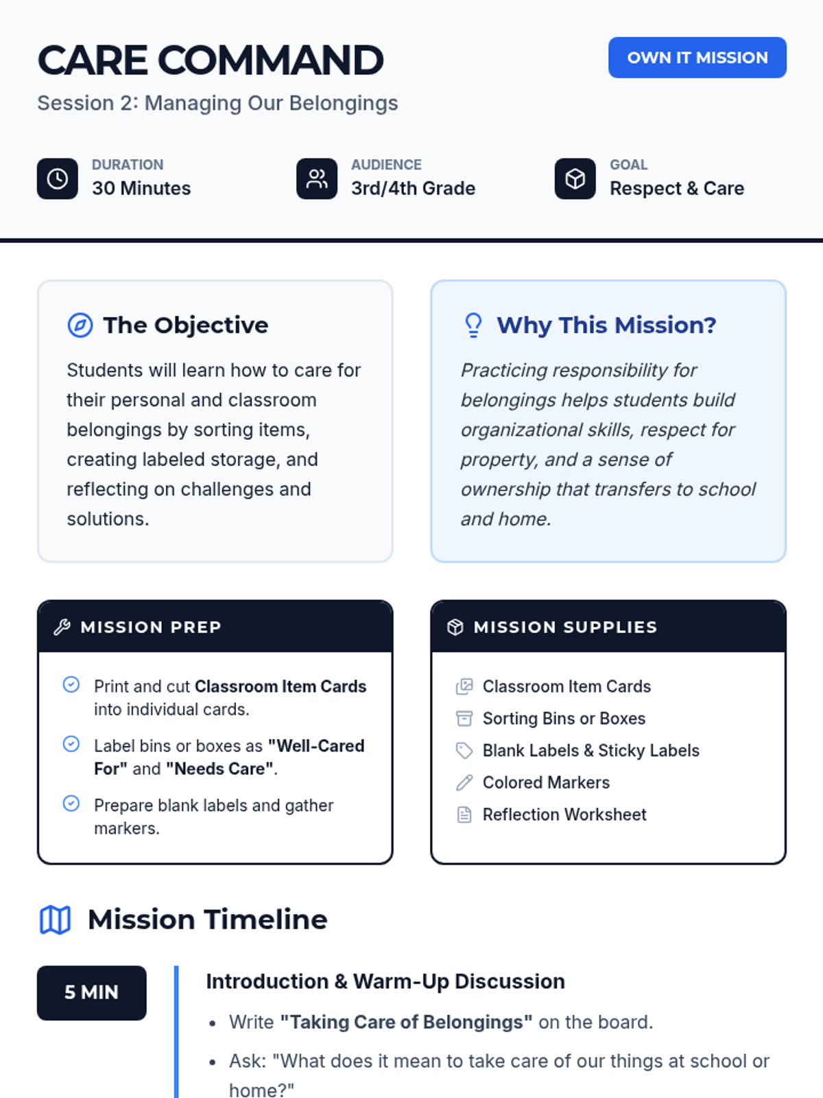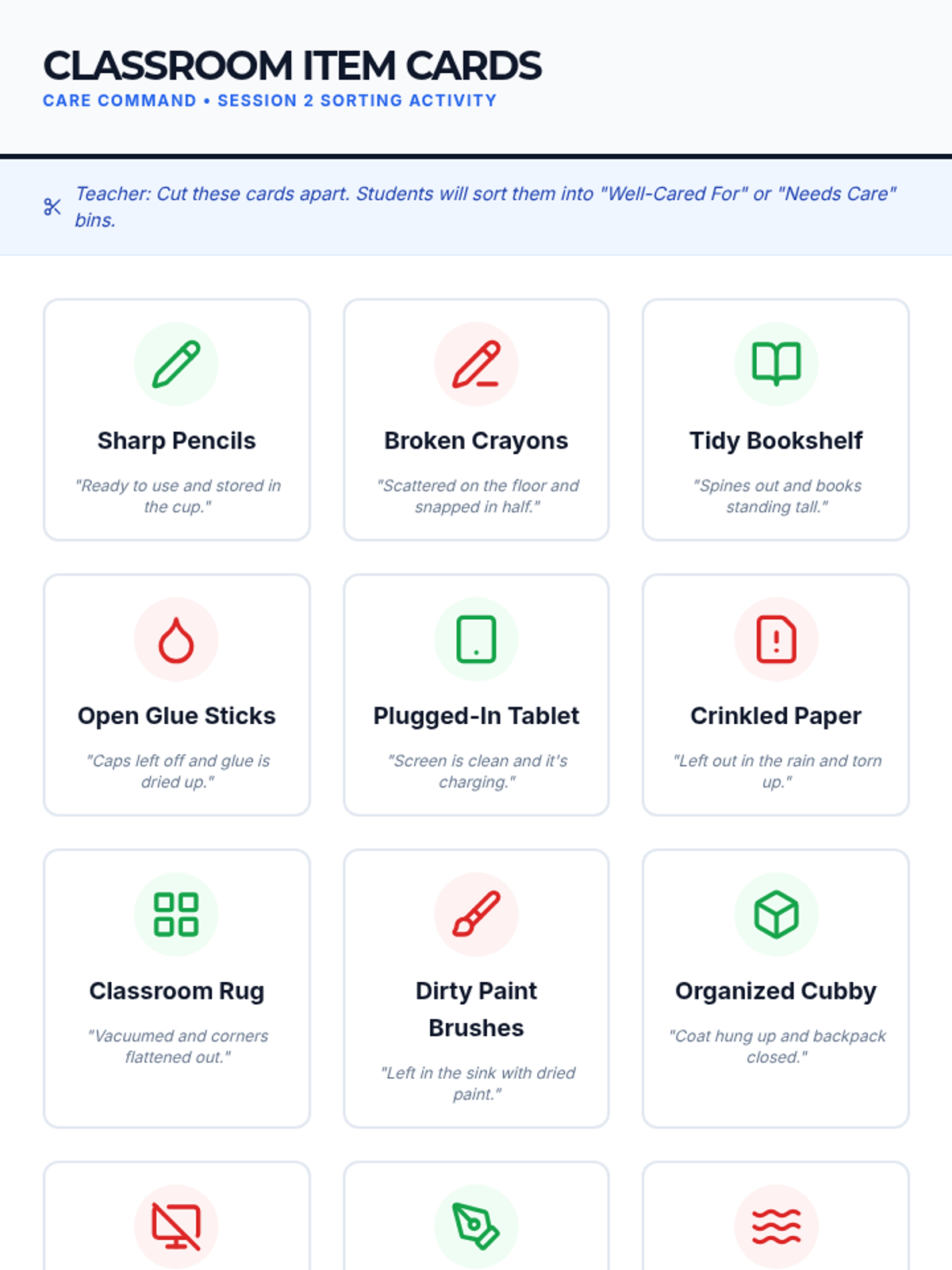 Students learn to care for personal and classroom belongings through hands-on sorting and labeling activities, fostering respect for property.