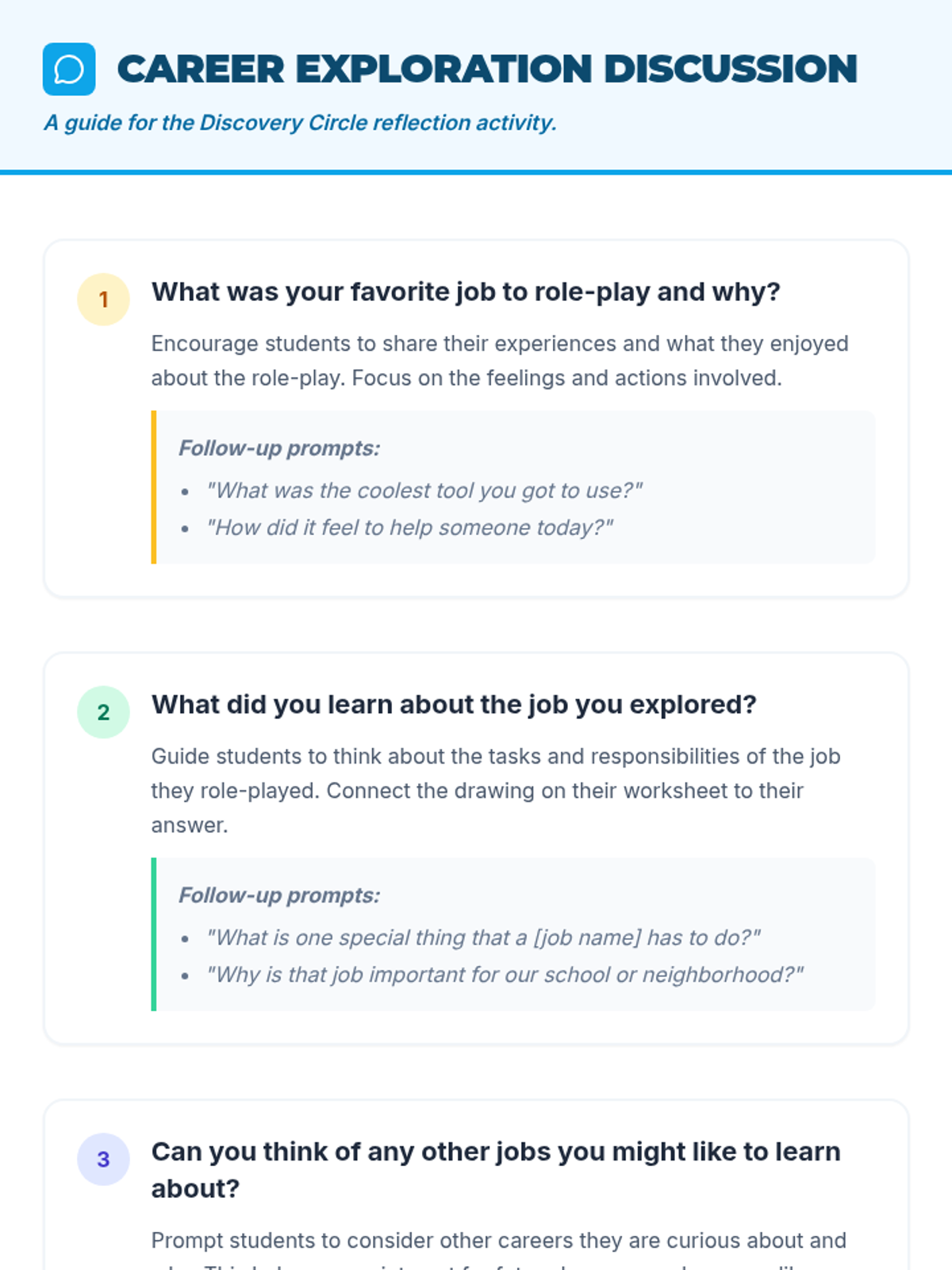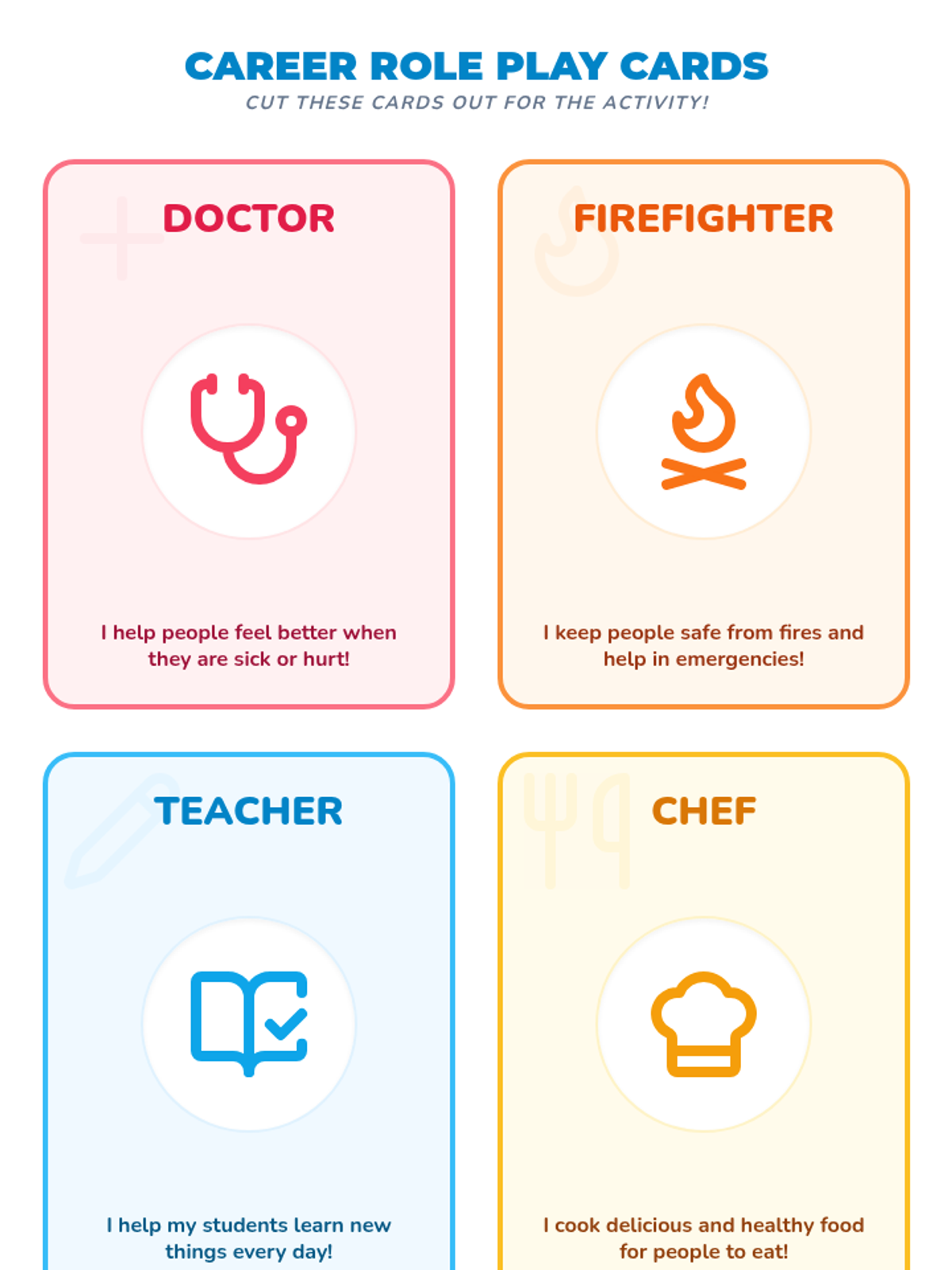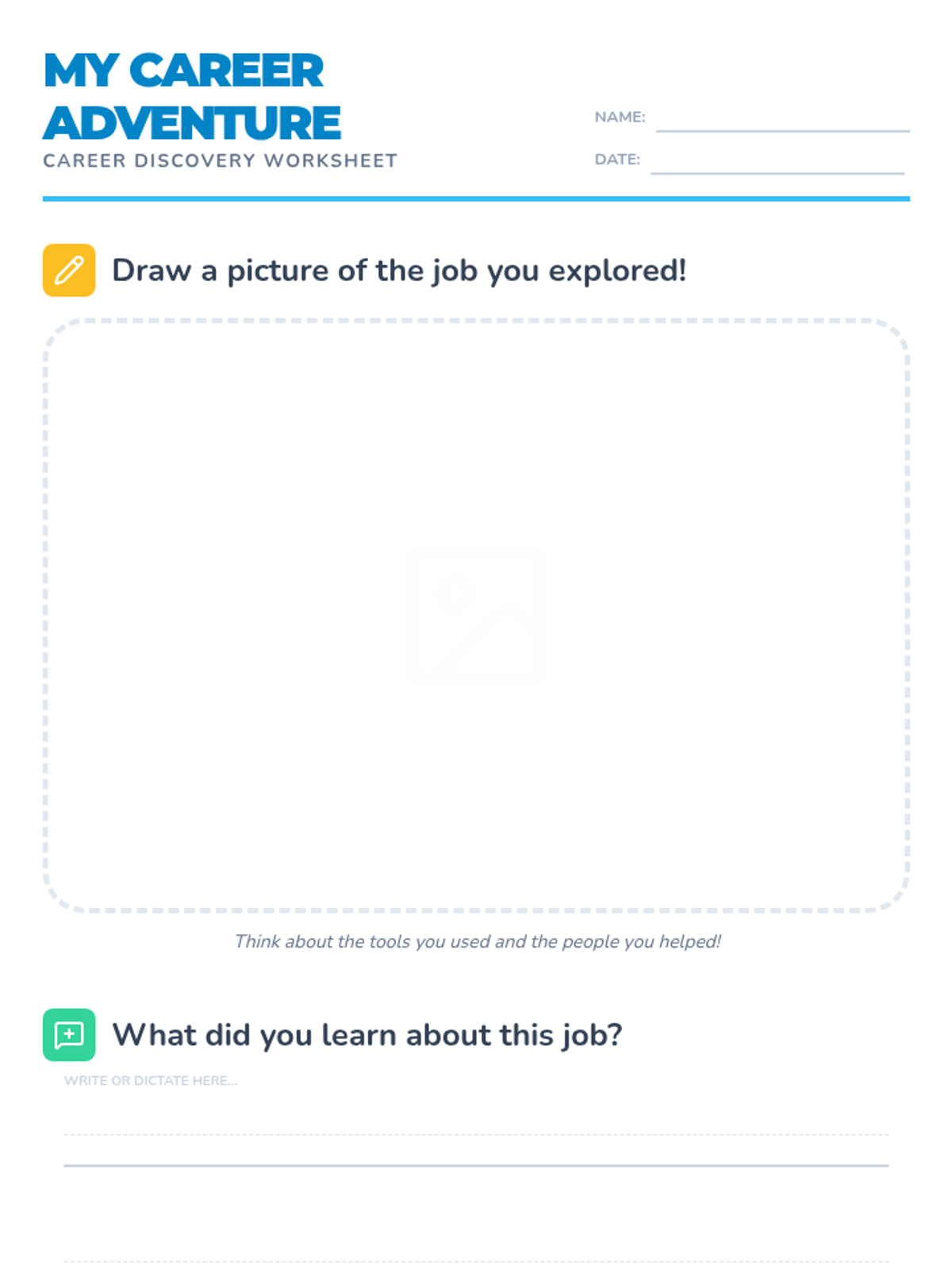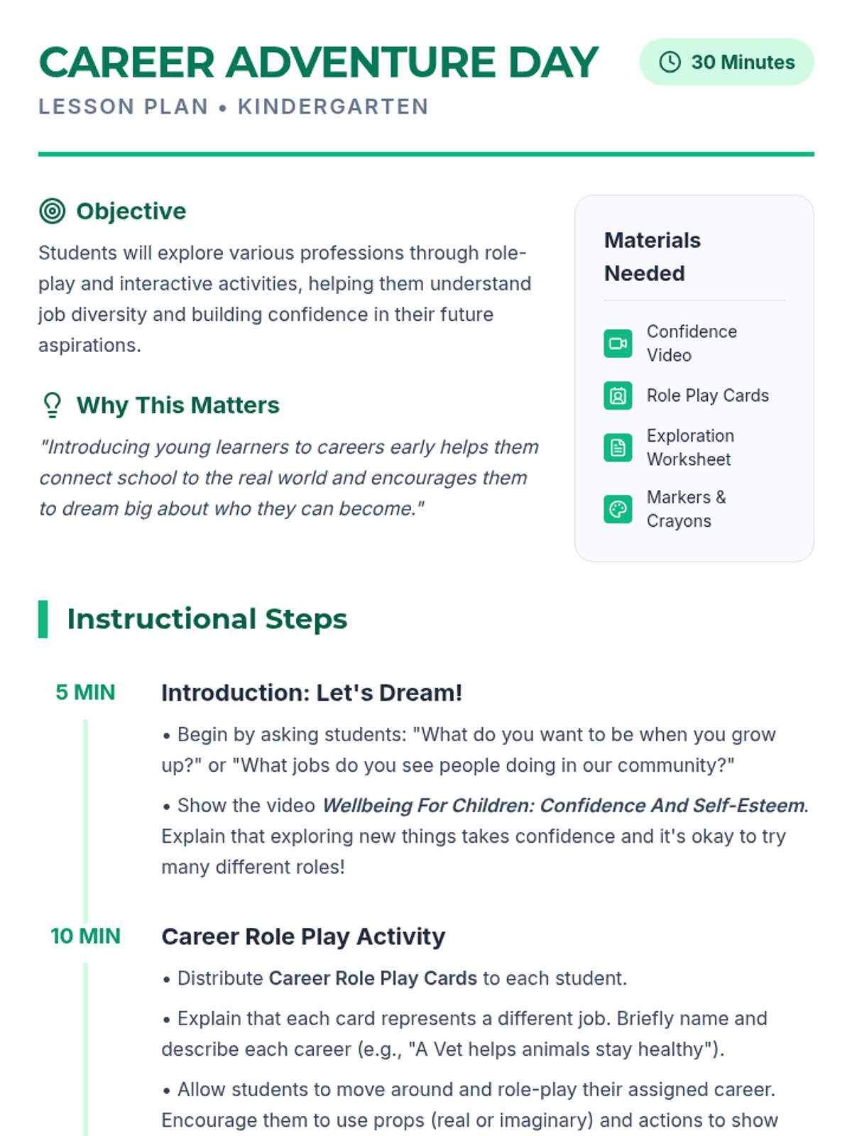 A career exploration lesson for kindergarteners where they use role-play and drawing to discover different professions and build confidence in their future aspirations.
