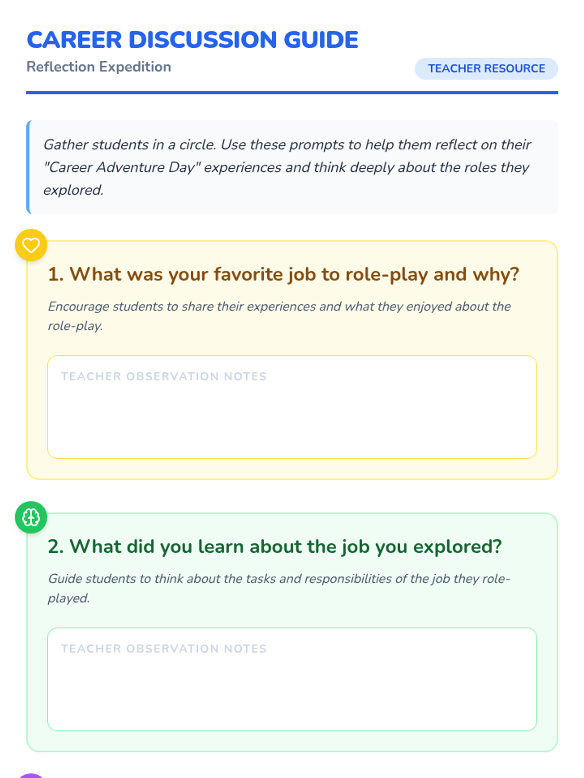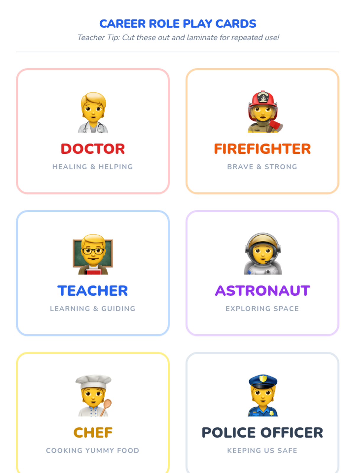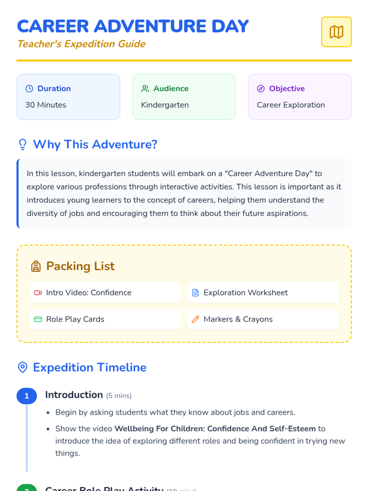 In this lesson, kindergarten students will embark on a 'Career Adventure Day' to explore various professions through interactive activities. This lesson is important as it introduces young learners to the concept of careers, helping them understand the diversity of jobs and encouraging them to think about their future aspirations.