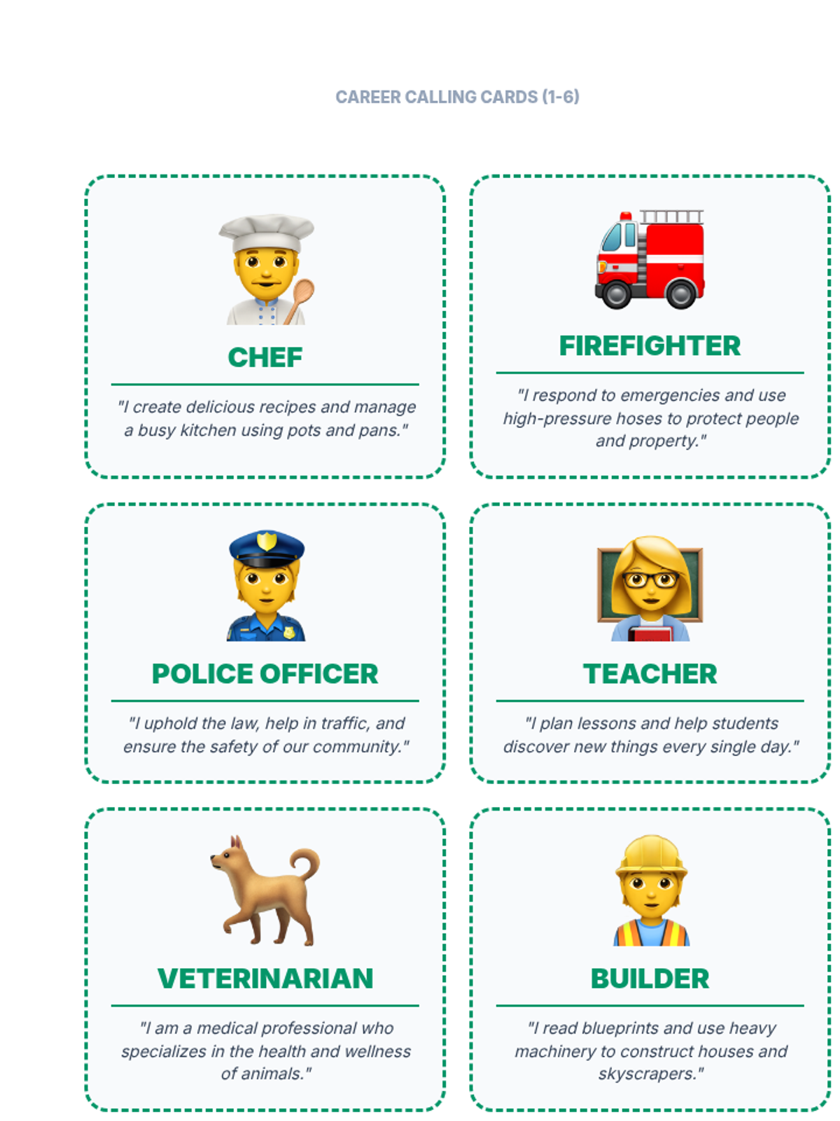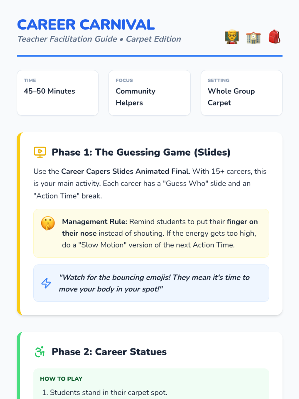 A high-energy, movement-based lesson for Kindergarten students to explore community helpers and various careers through interactive carpet games and visual storytelling.