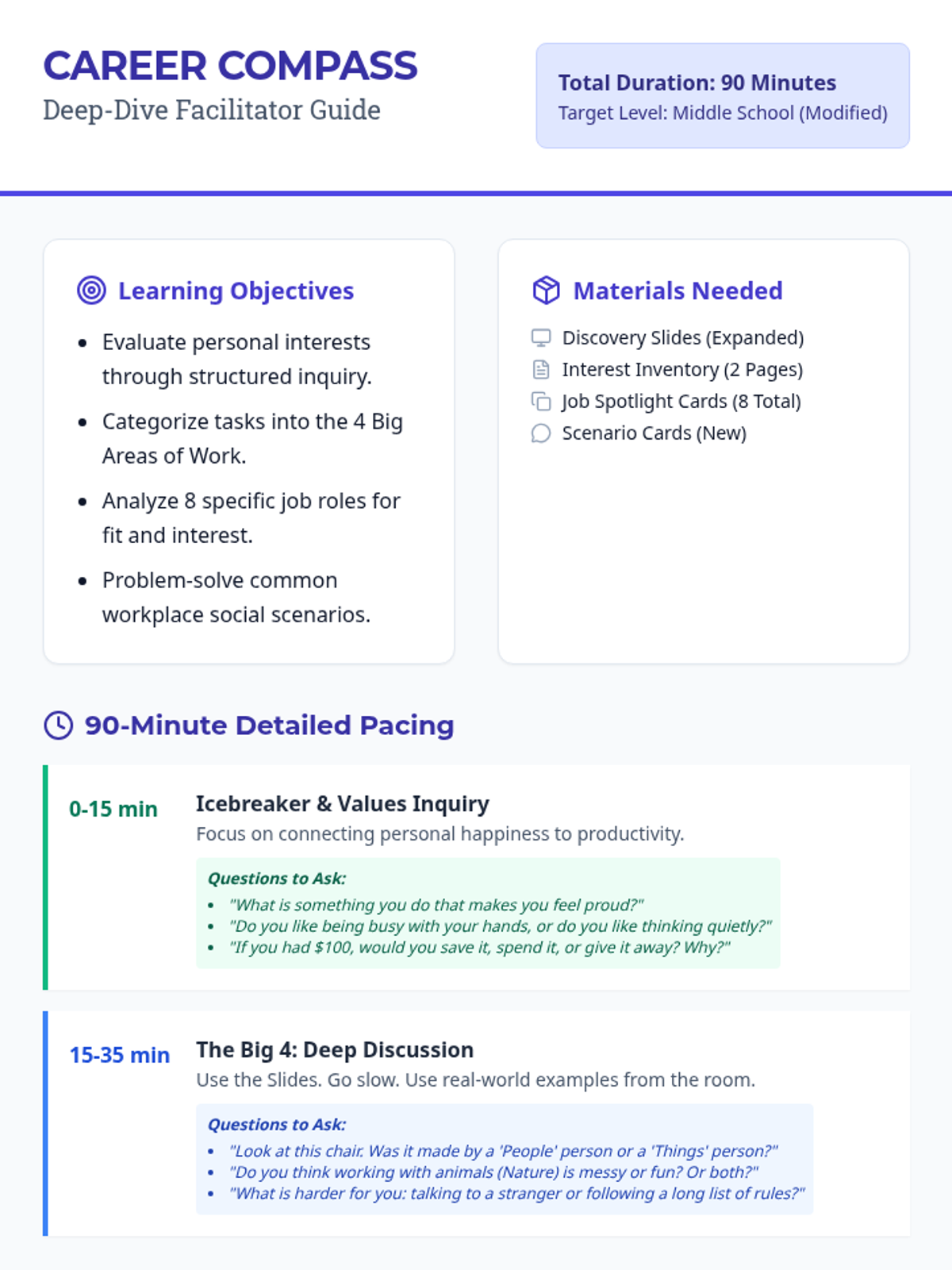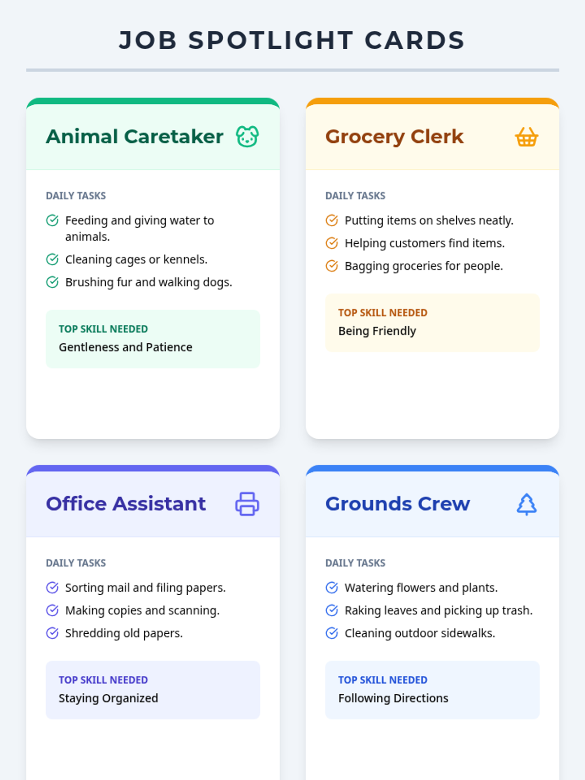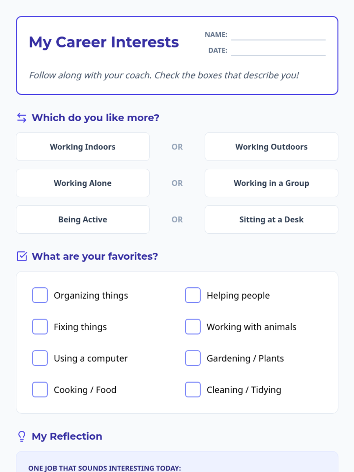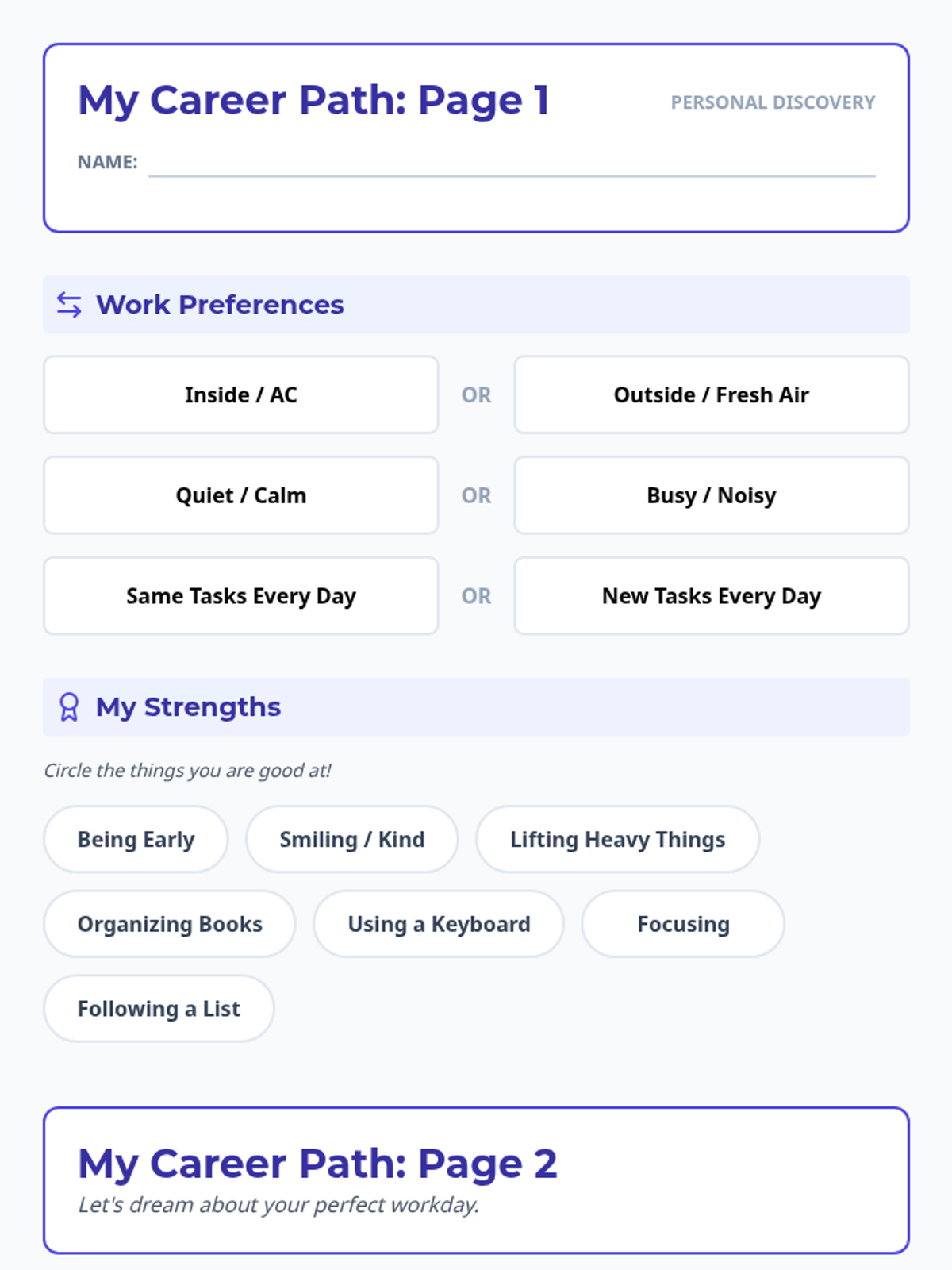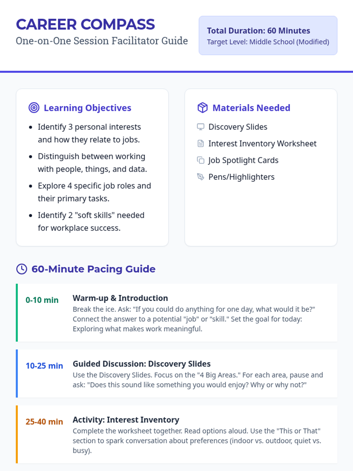 A comprehensive 60-minute one-on-one session designed to help an adult learner with disabilities explore potential career paths, identify personal interests, and understand the basic requirements of different work environments.