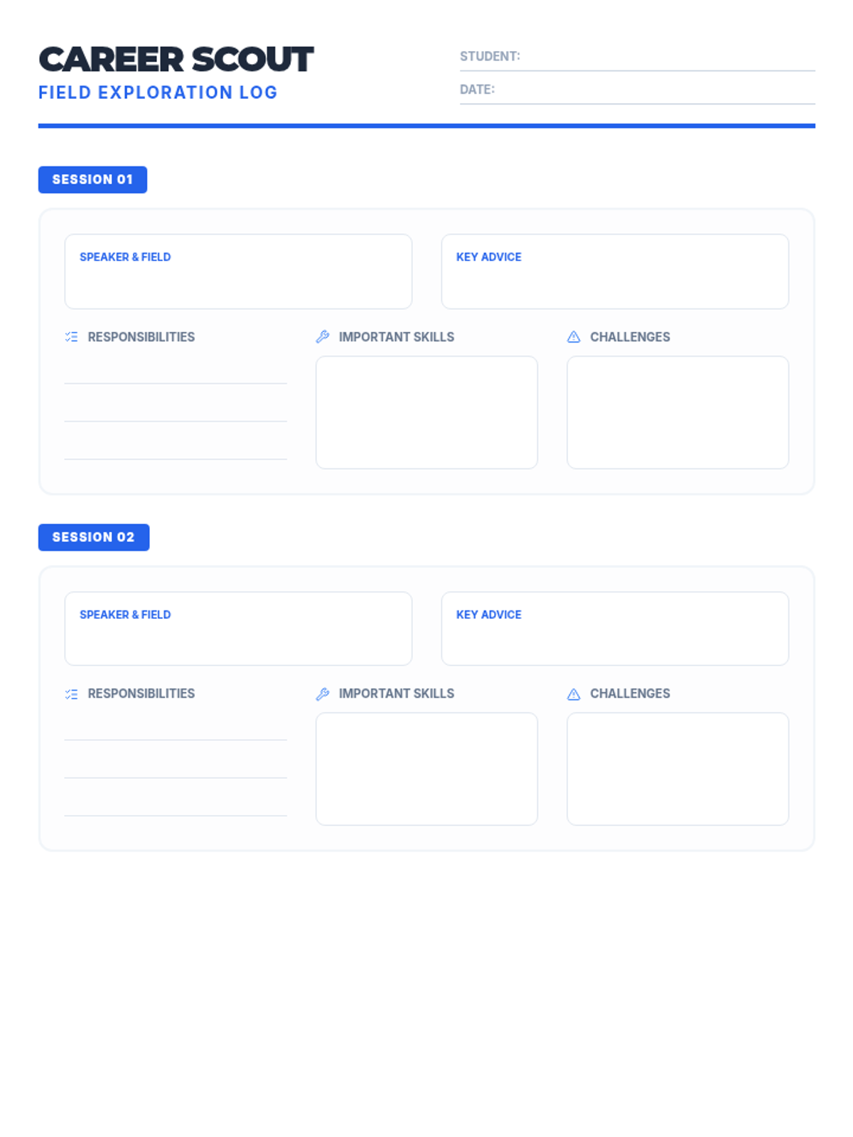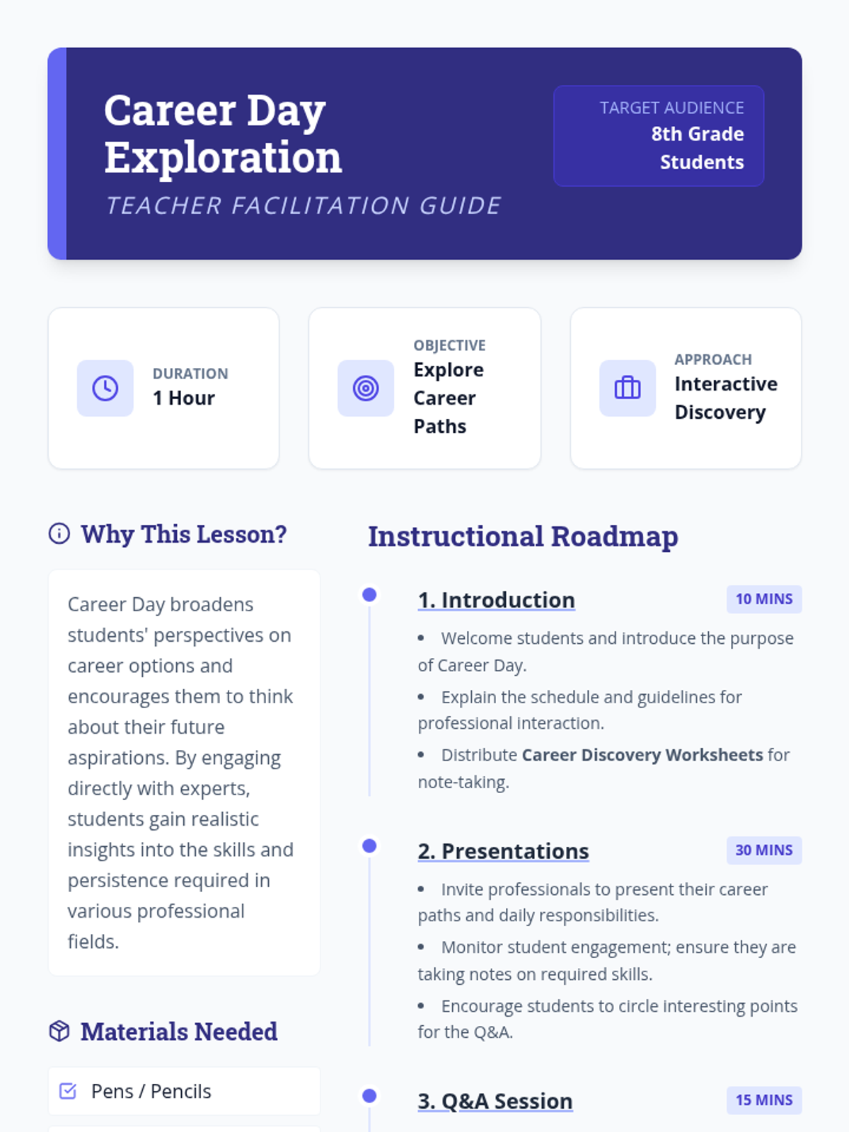 An interactive Career Day session where 8th-grade students engage with professionals to explore various career paths, understand required skills, and reflect on their future aspirations.