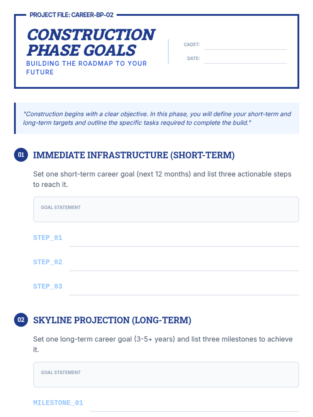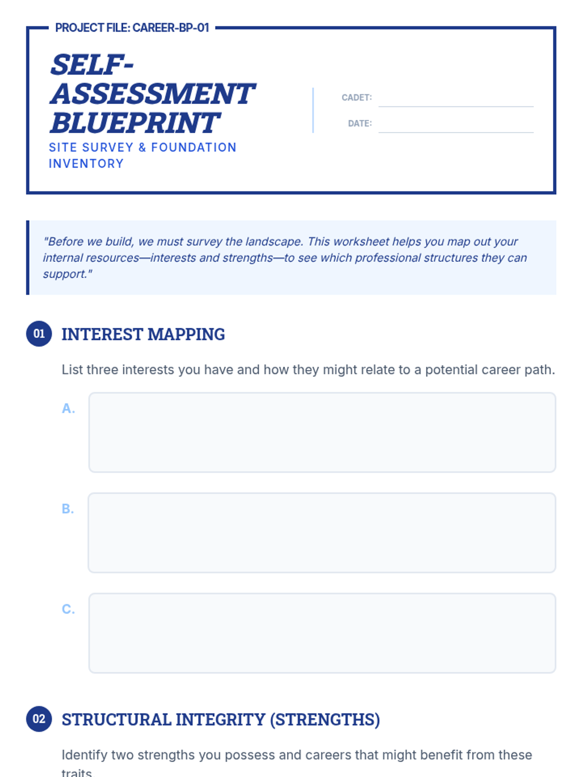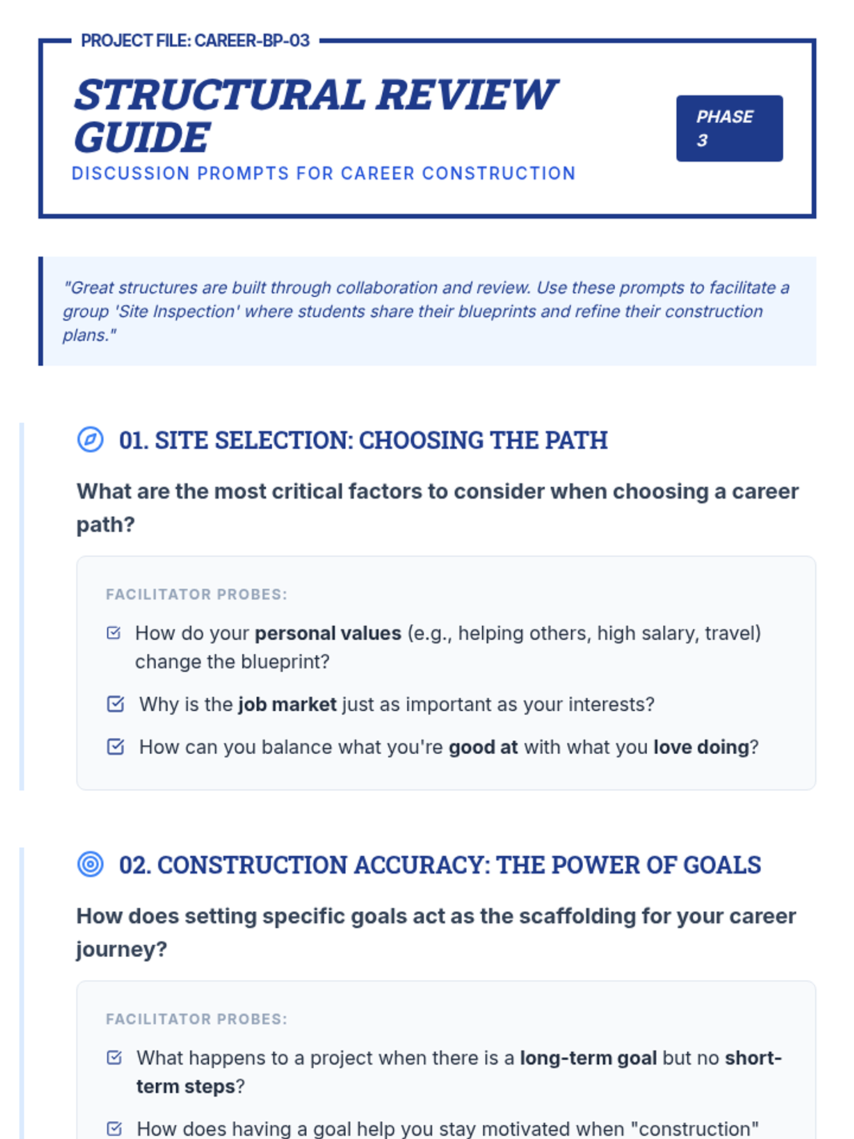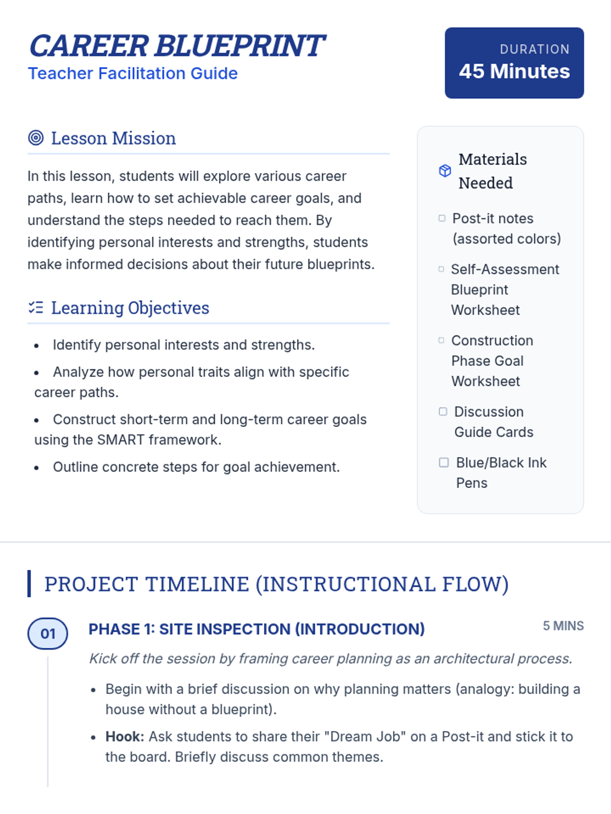 A comprehensive lesson for 9th-grade students to explore career paths through self-assessment, group discussion, and goal-setting activities using a blueprint-inspired planning theme.