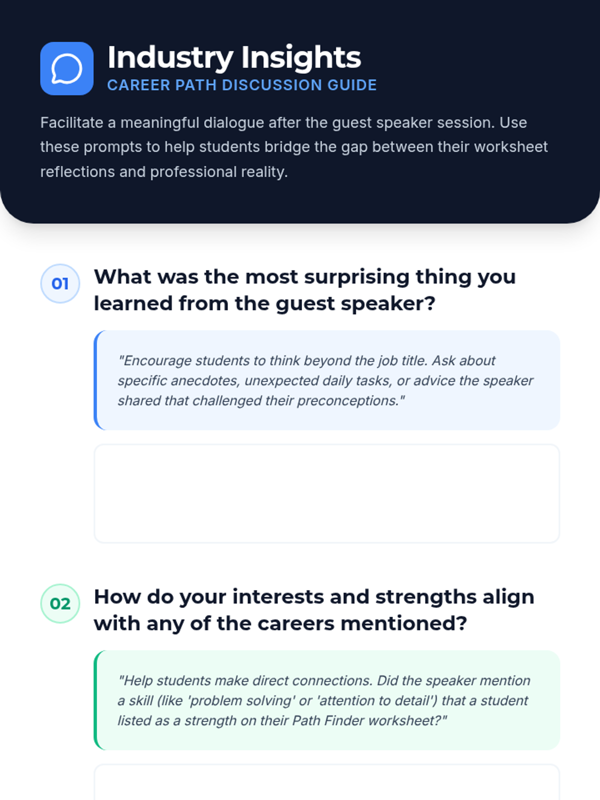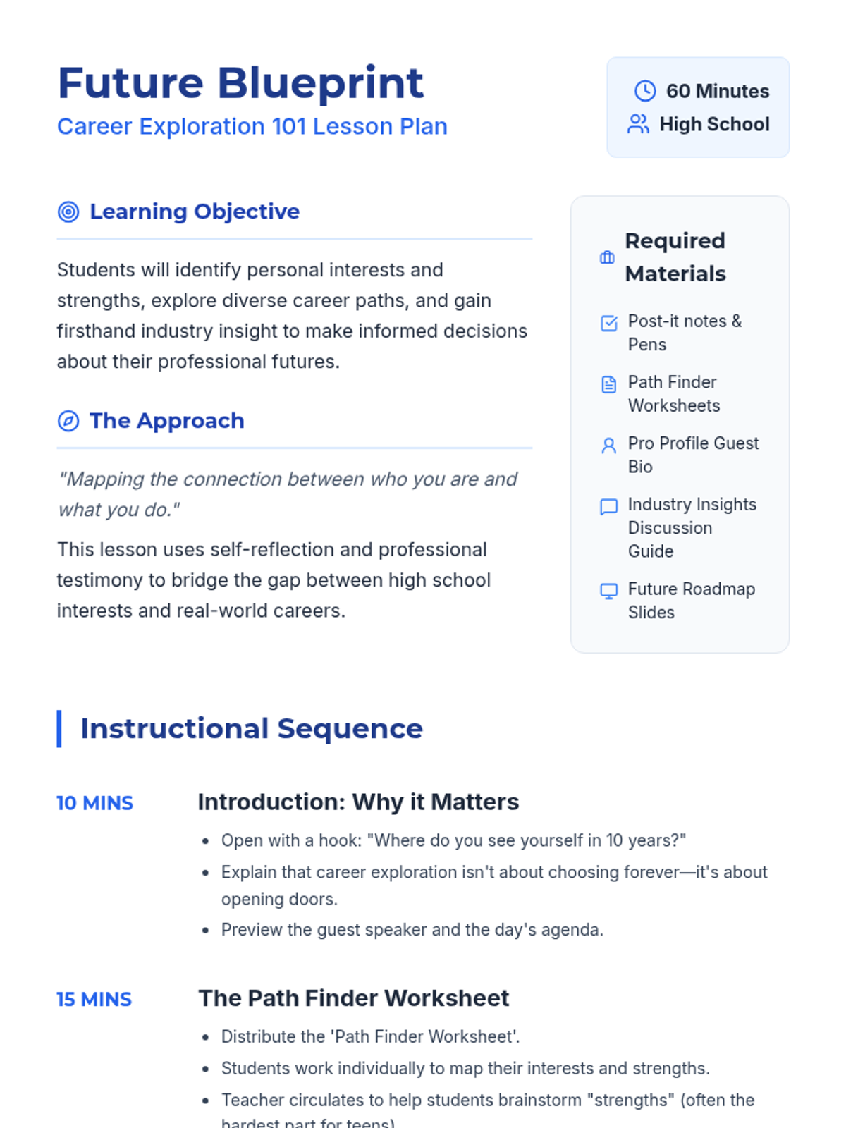 This lesson introduces students to various career paths, helping them identify their interests and strengths through practical exercises and a guest speaker session. This exploration is essential as it helps students make informed decisions about their future careers.