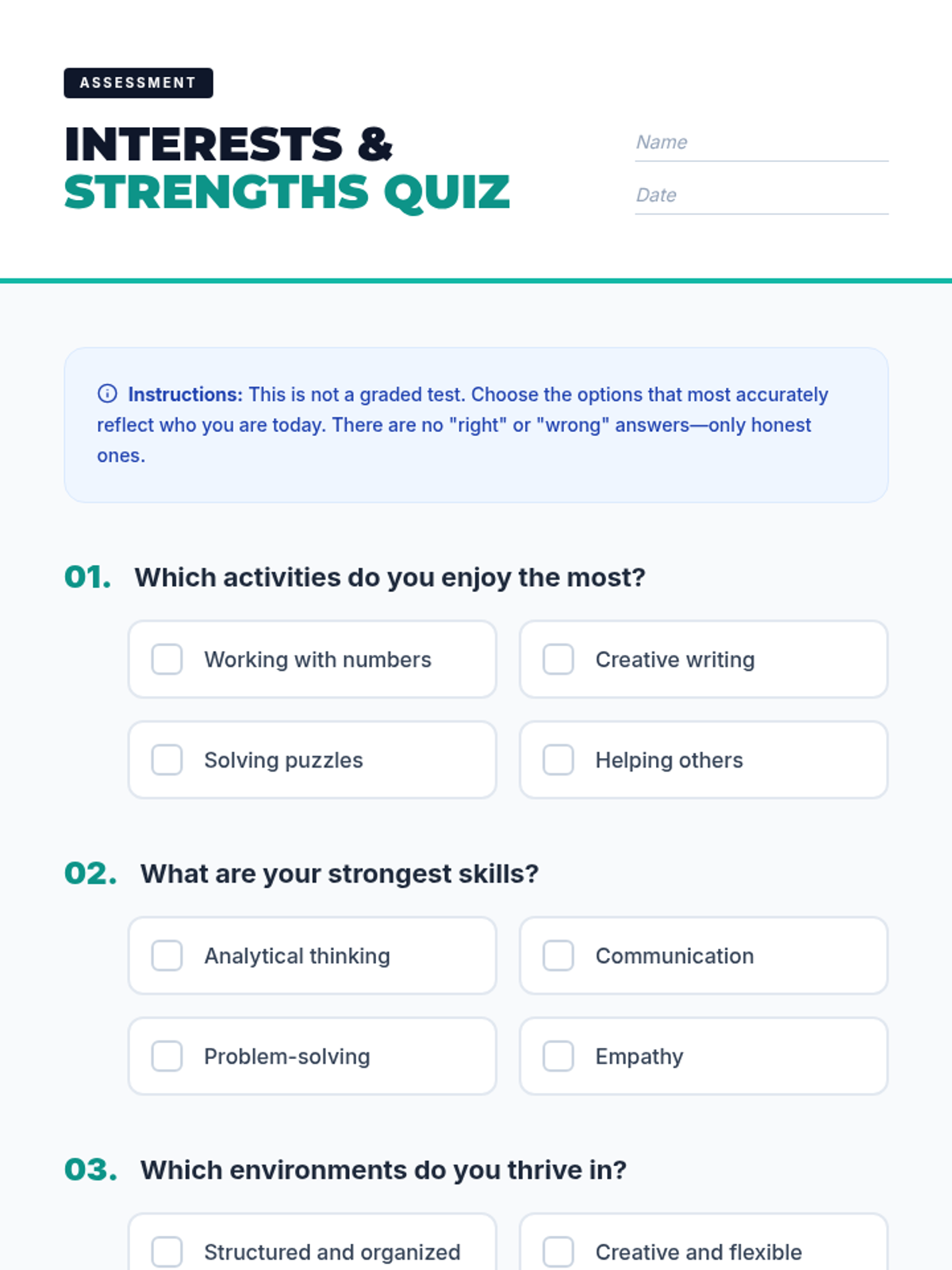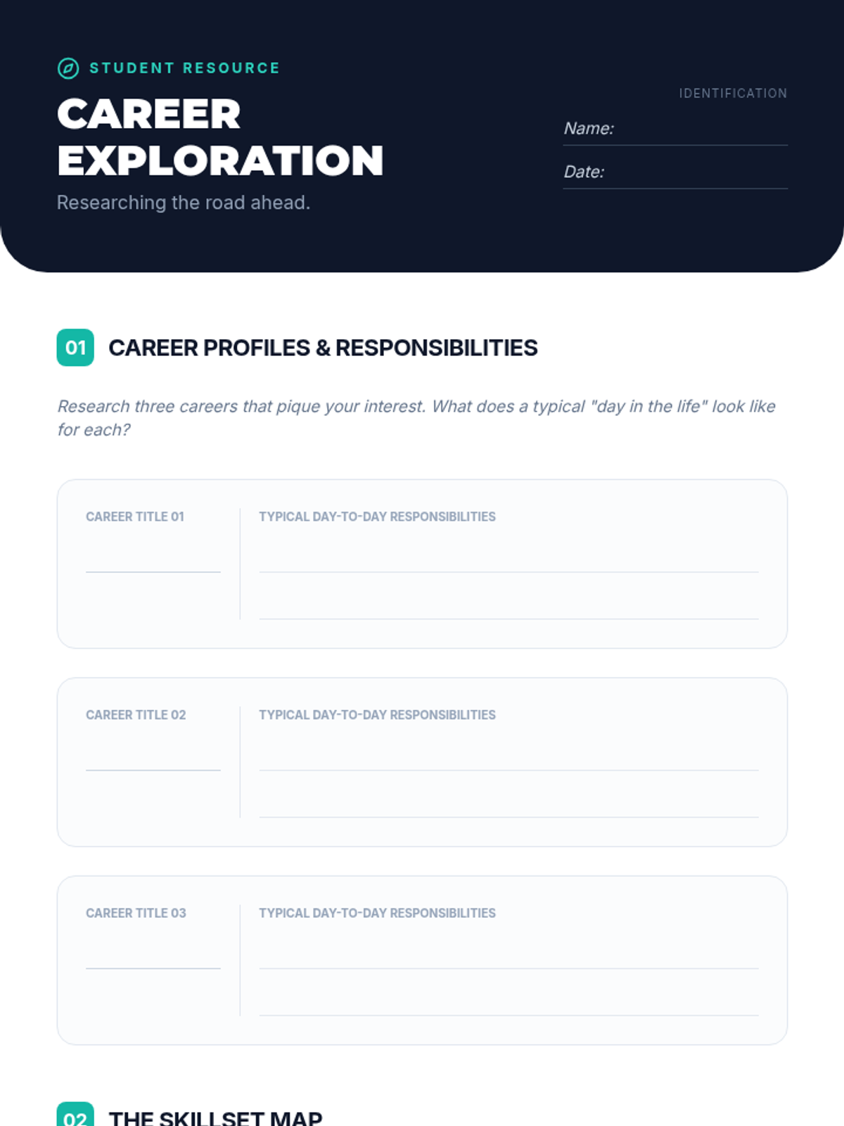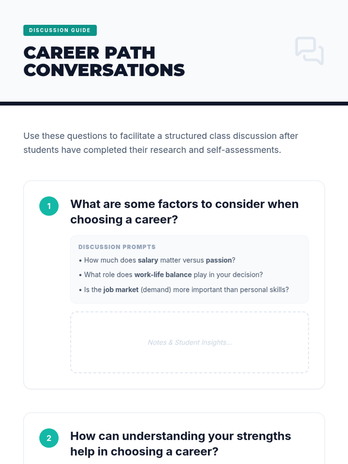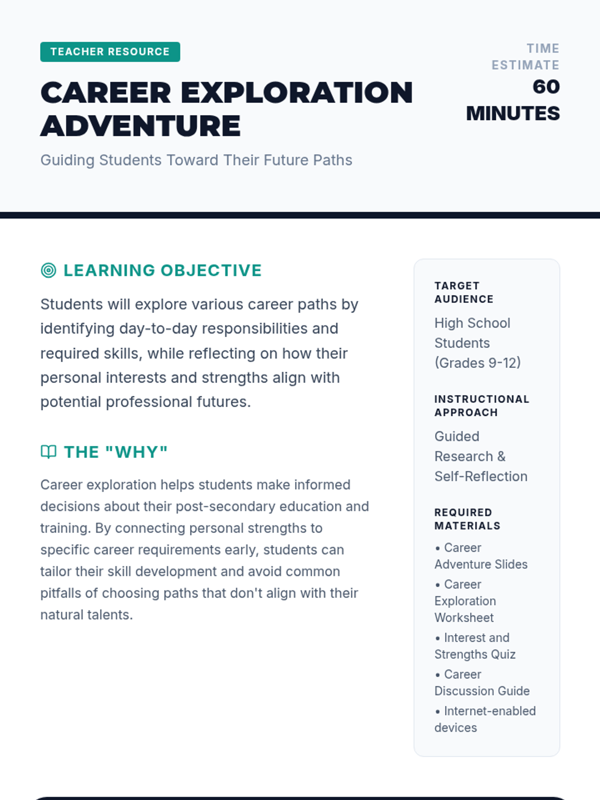 Students explore diverse career paths, identify personal strengths and interests, and learn how to align their skills with future professional opportunities through research and reflection.